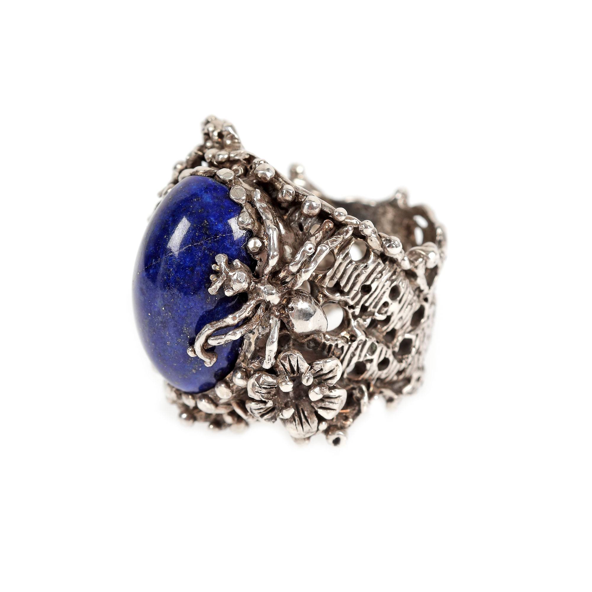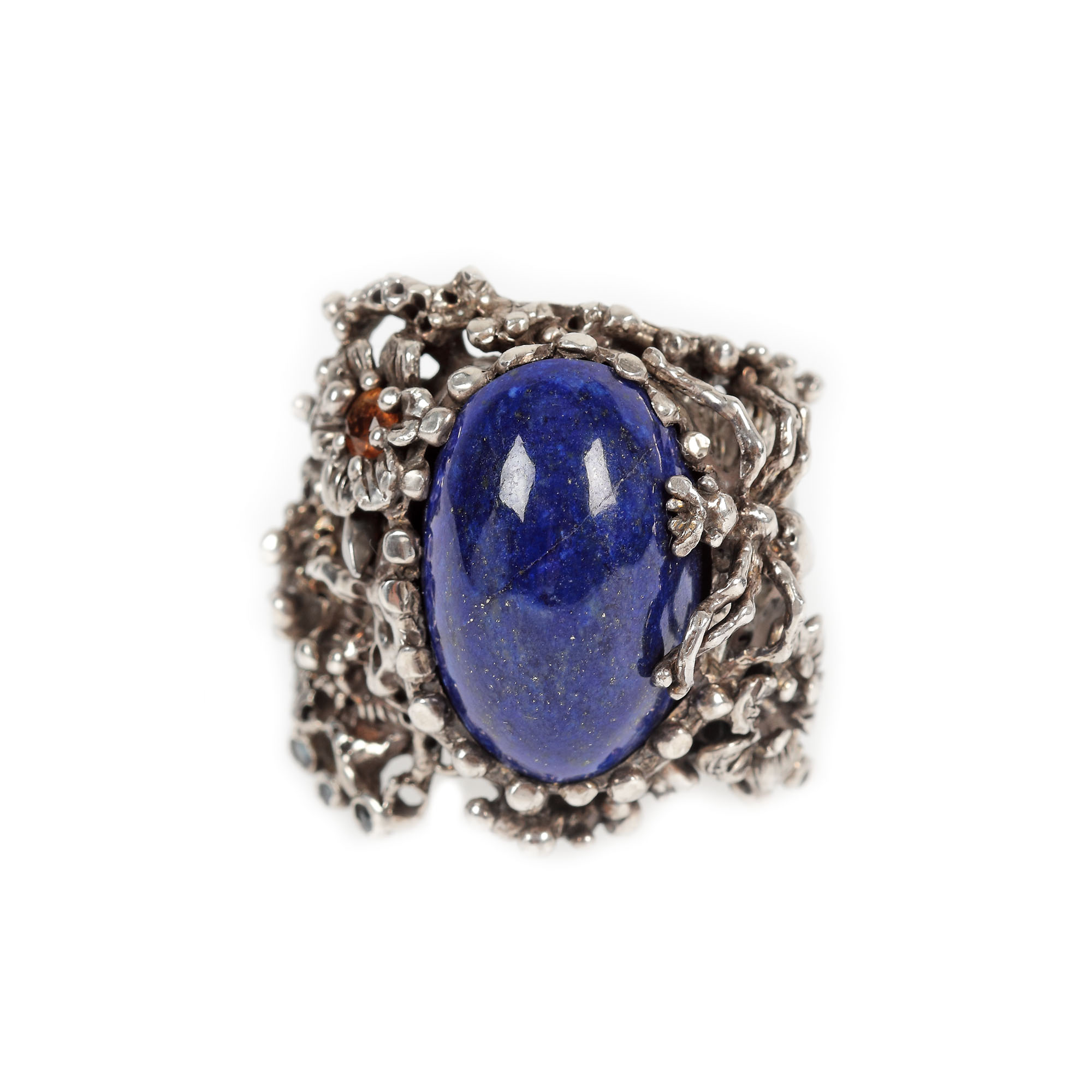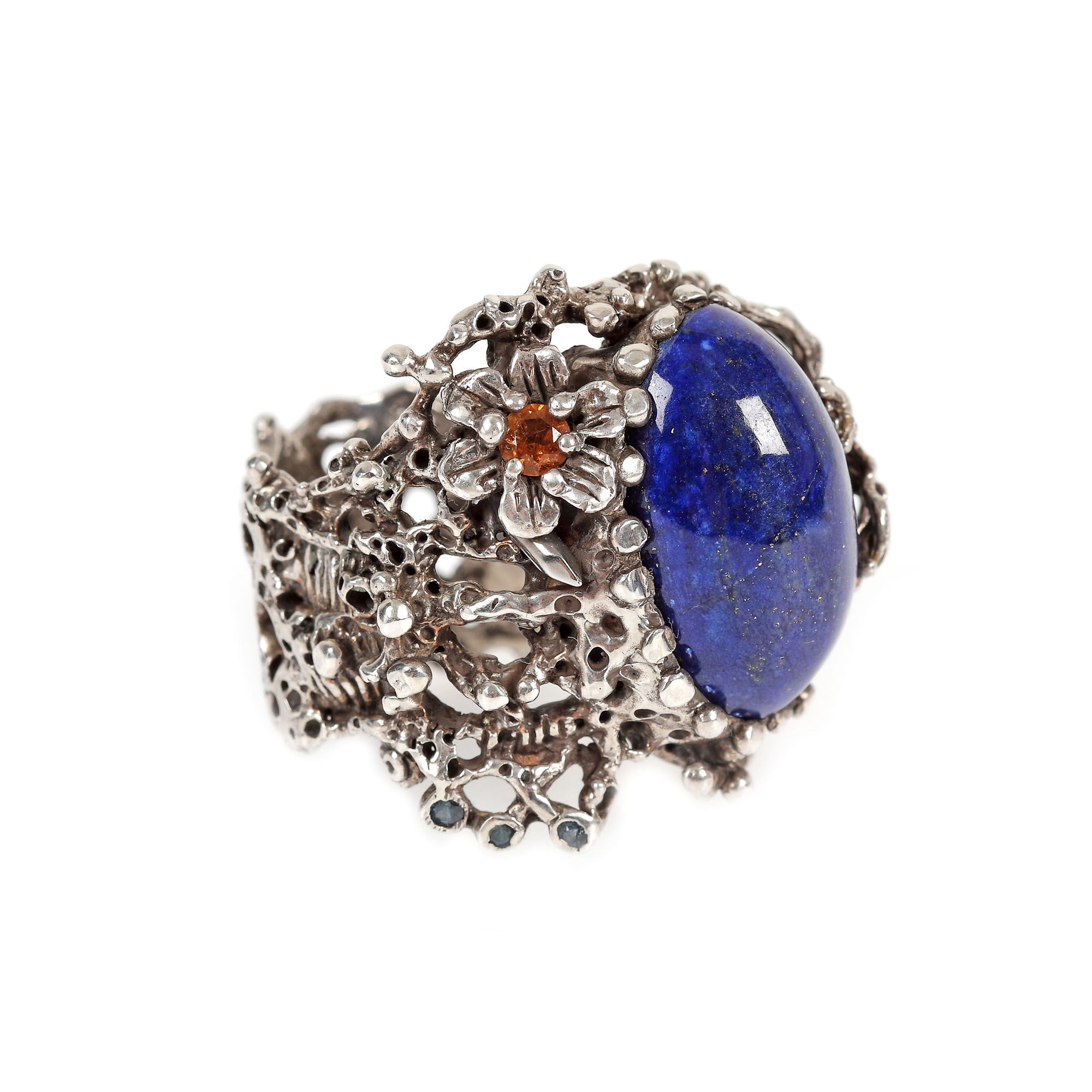 72. ”Mooncast” - inel din argint, decorat cu lapis lazuli și citrin, creat și donat de Monica Bîrlădeanu