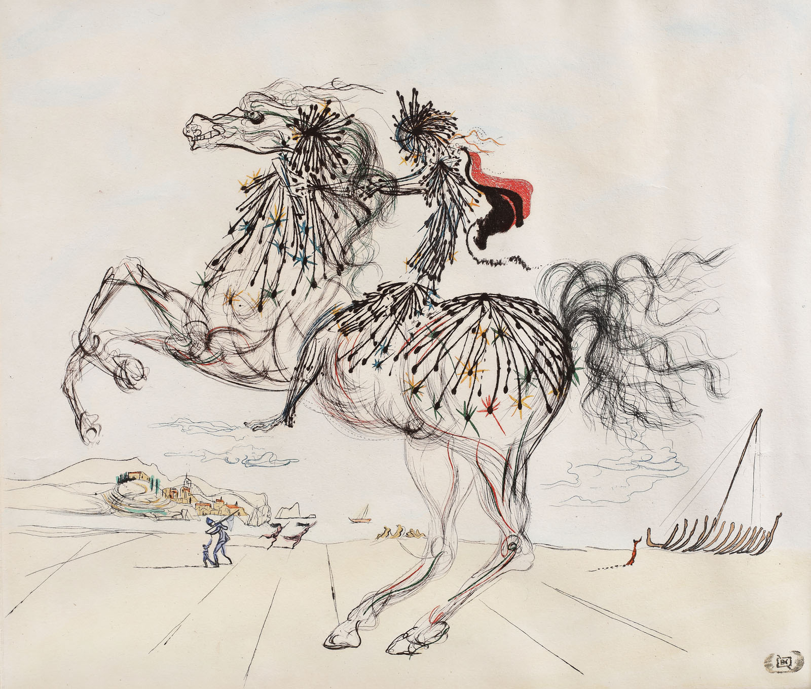 notat dreapta jos, în creion, "Salvador Dali'; numerotat stânga jos, în creion, "698/750"; intitulat central jos, în creion, "Le chevalier"