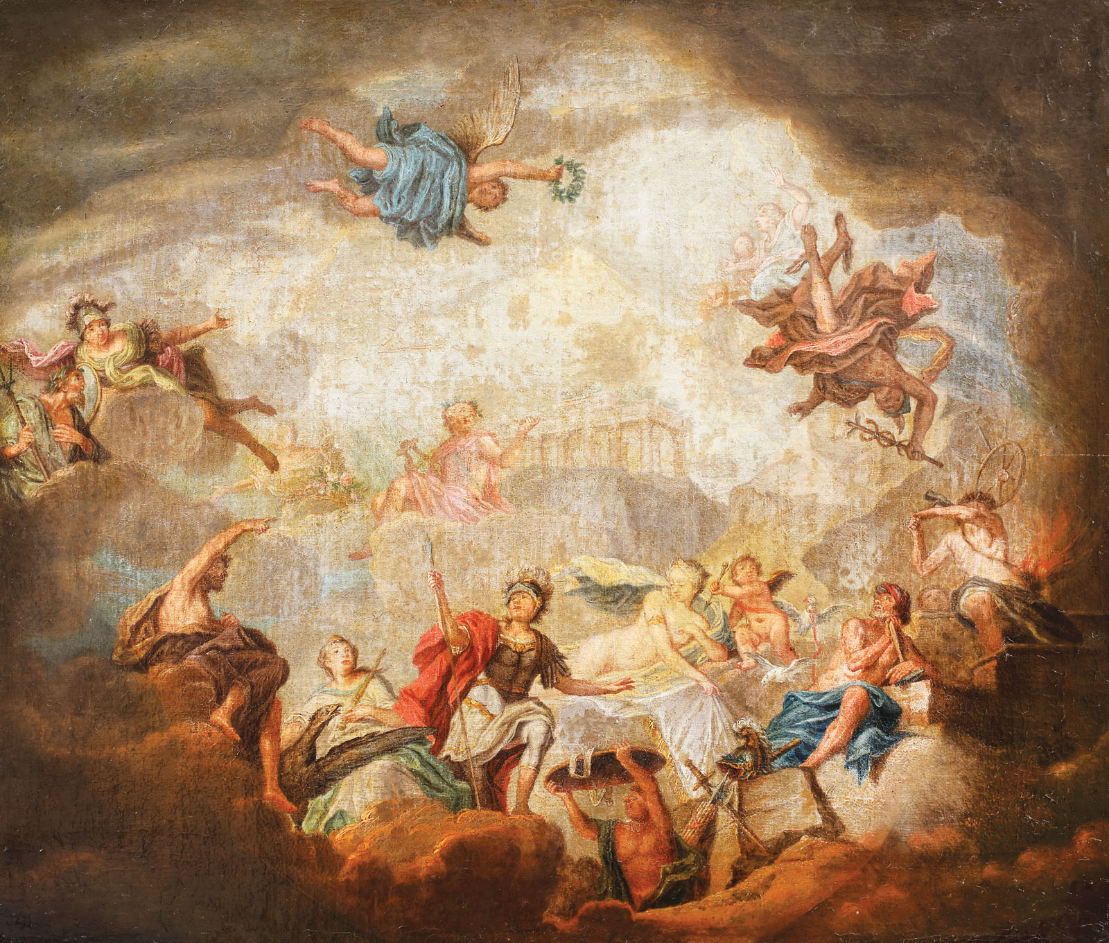 Guglielmi Gregorio, deşi născut la Roma, şi-a definitivat ucenicia în spaţiul german, în special sub îndrumarea lui Sebastiano Conca. Printre principalele lucrări se numără frescele de la biserica Santissima Trinità degli Spagnoli, de la Palatul Regal din Turin, de la marea galerie a Palatului Schönbrunn, Palatul Liebert etc. Din 1769 intră sub serviciul Ecaterinei a Rusiei, petrecându-şi ultima parte a vieţii la Palatul Regal de la Sankt- Petersburg. Lucrarea de faţă reprezintă un proiect în ulei pentru una din numeroasele sale fresce din spaţiul italian. Imaginea aduce în discuţie o lume antică a miturilor, a eroilor legendari si a zeităţilor. Utilizarea culorilor calde, luminoase şi proiectarea figurilor modelate în detaliu reflectă tendinţa artistului de a uni într-o manieră naturală Barocul târziu influenţat de Conca cu Clasicismul în dezvoltare al lui Pierre Subleyras şi Marco Benefial. Lucrări de Gugliemi Gregorio se regăsesc în Muzeul Hermitage (Sankt Petersburg, Rusia), Muzeul Louvre ( Paris, Franţa), Muzeul Kunsthistorisches (Viena, Austria).