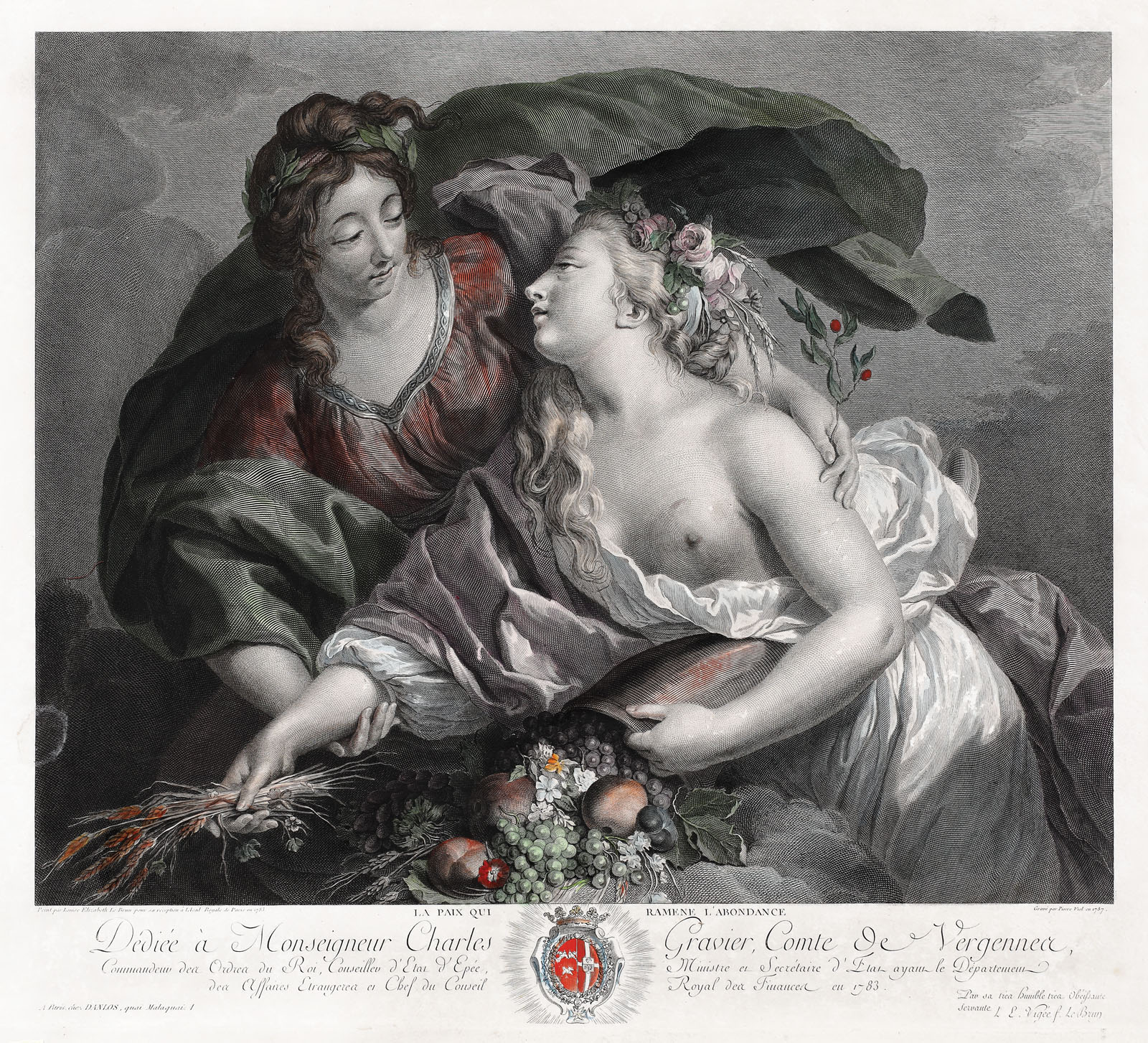 semnat, datat, gravat, stânga jos sub cadru, "Gravé par Pierre Viel en 1787"; notat, gravat, stânga, jos sub cadru, "Peint par Louise Elizabeth Le Brun pour sa réception a L Acad. Royale de Paris en 1783"; intitulat, gravat, central jos, sub cadru, "La paix qui ramene l'abondance"