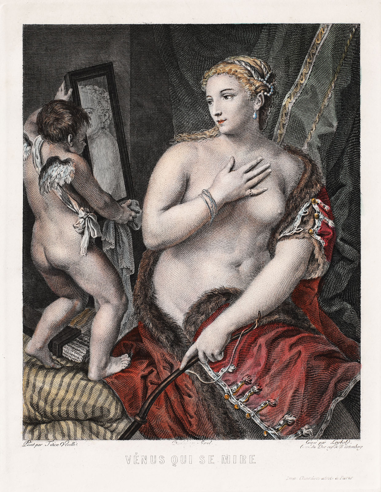 semnat, gravat, dreapta jos, sub cadru, "Gravé par Leybold, gravé du duc. reg. de Wurtemberg"; notat, gravat, stânga jos sub cadru, "Peint par Titien Vecelli"; intitulat, gravat, central jos, sub cadru, "Vénus qui se mire"; notat, gravat, central jos, sub cadru, "Desiné par Beret"; notat, gravat, stânga jos, "Imp. Chardon aine a Paris"