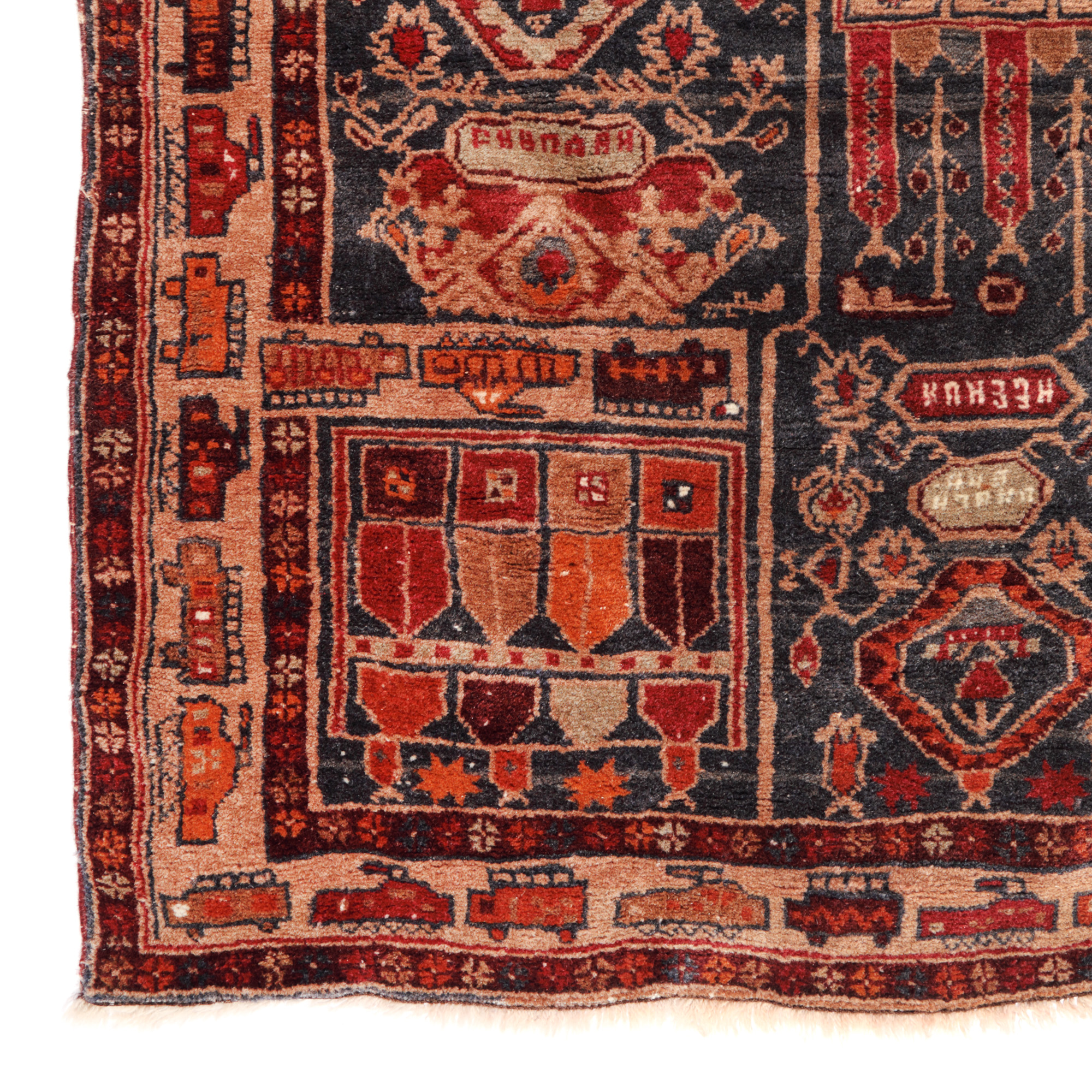 Motivele inspirate de război în covoare au apărut după ce Uniunea Sovietică a ocupat Afghanistanul în 1977, ele ilustrând de regulă cotidianul afgan, respectiv animale, scene din Coran dar și tancuri, elicoptere, mitraliere chiar și rachete balistice. Covorul aici de fața este foarte special din cauza celor doua cimitire, care rezultau evident în urma războiului de ocupație. Aceste covoare sunt rare și, ca atare, extrem de colecționabile.