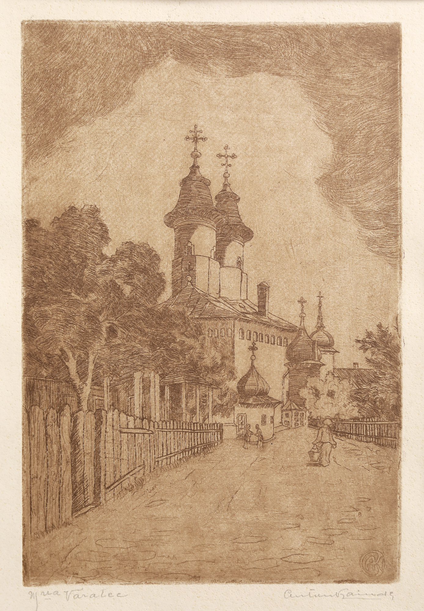semnat dreapta jos, în monogramă, ”AK”; semnat dreapta jos, în creion, ”Anton Kaindl”; localizat dreapta jos, în creion, ”M-rea Văratec”