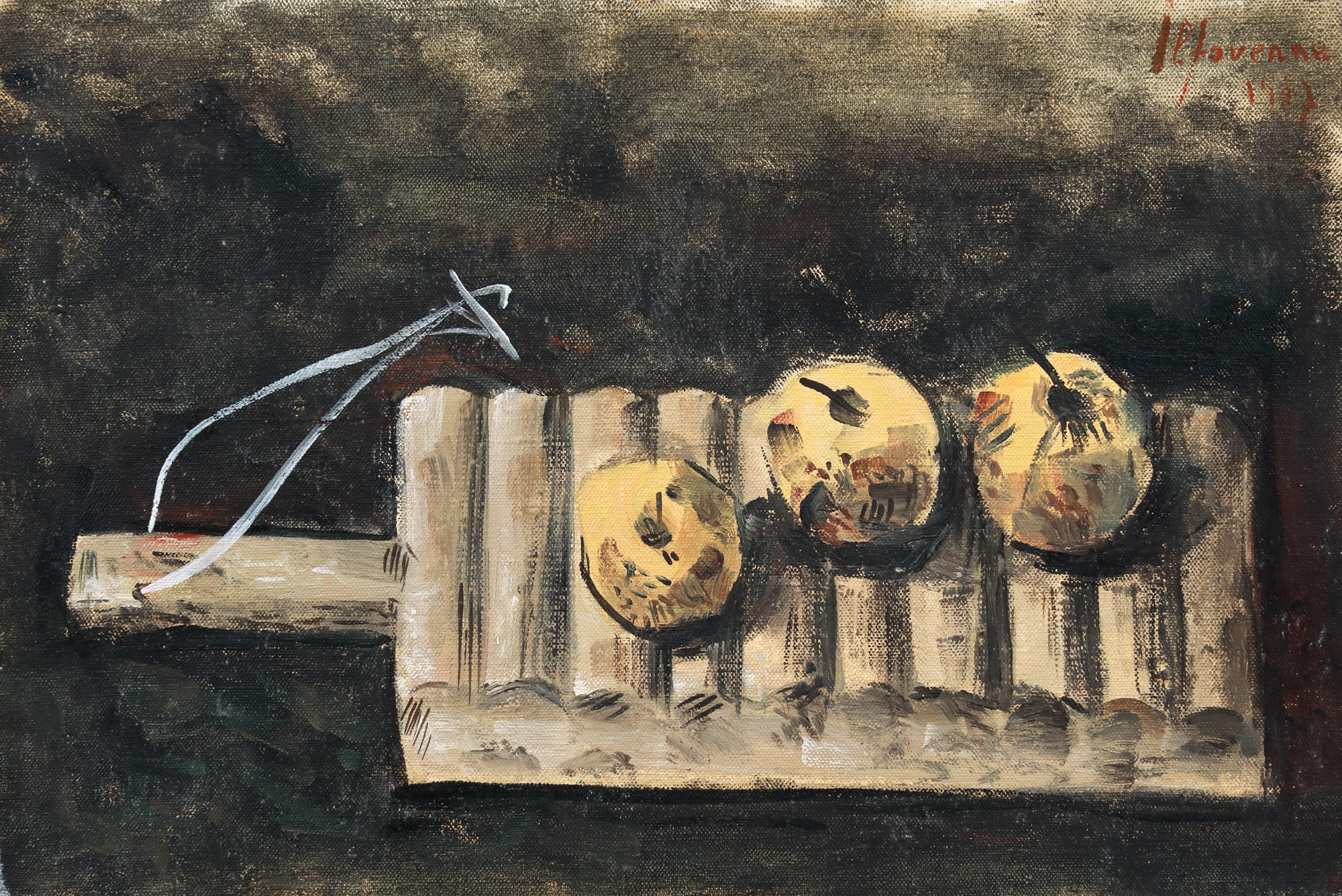 De peste 30 de ani de la debutul expoziţional, Sorin Ilfoveanu ne-a constrâns să-i recunoaştem grifa de desenator, peste construcţia căreia, culoarea aproape nu-şi mai găseşte locul. Iată de pildă această mică pânză (mică în comparaţie cu marile pânze ce-i vor urma) făcută probabil la Rădeşti, jud. Piteşti (1987), în casa de vară pe care şi-o cumpărase nu demult (1985). Este epoca în care naturile statice alterneză cu peisajele realizate în acelaşi context rural. Obiectele vechi, populare, nu lipseau probabil din gospodăria recent cumpărată, iar înclinaţia artistului spre aceste piese, cu valoare muzeistică, nu se lasă greu descifrată. Alunecând din sistemul tehnologic în cel cultu- ral, eliberat în obiectivitatea sa funcţională, maiul de bătut rufe, devine un suport expresiv pentru nişte mere. De-a lungul timpului coerenţa sistemului tehnologic a fost neîncetat modificată şi perturbată. Raţionalitatea de odinioară a obiectelor, strâns legată de un ritual al gesturilor, capătă acum o semnificaţie întâmplătoare sau secundă .Ilfoveanu se foloseşte de acest impas pentru a înzestra obiectul cu alte valori estetice. Cuplate, merele şi maiul, se autopotenţează în hieratismul expresiei, devenite semn-esenţă, îmbogăţind limbajul prin care pictorul comunică privitorului. Asceza, în elementul căreia Ilfoveanu se simte cel mai bine, nu compromite comunicarea complexă. Pe linia vechilor bodegon, în alianţă cu o civilizaţie pe care mai târziu o va îndrăgi, consacrându-i cicluri întregi de desene (mă refer, desigur, la literatura sud-americană) artistul capaciteză la maximum un subiect de o simplitate covârşitoare. (R.G.)