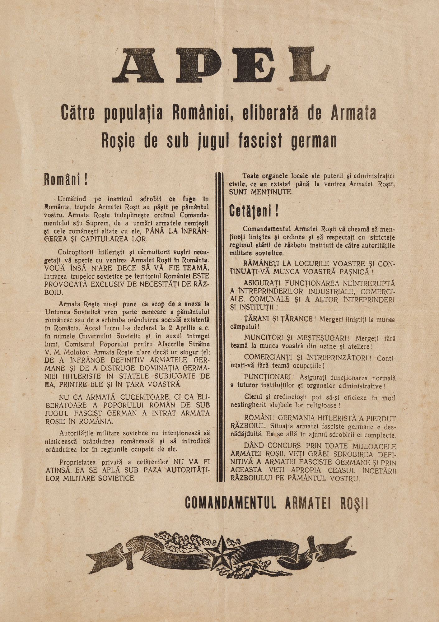 227. Apel către populaţia României, eliberată de Armata Roşie de sub jugul fascist german, afiş de propagandă comunistă distribuit în vara anului 1944