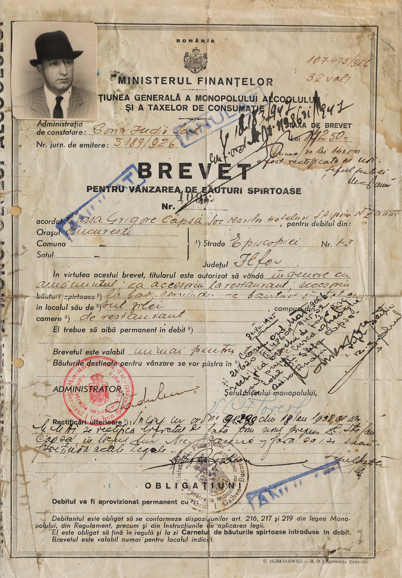 236. Brevet pentru vânzarea băuturilor spirtoase, acordat celebrului restaurant Capșa, 1926, piesă rară, de colecție