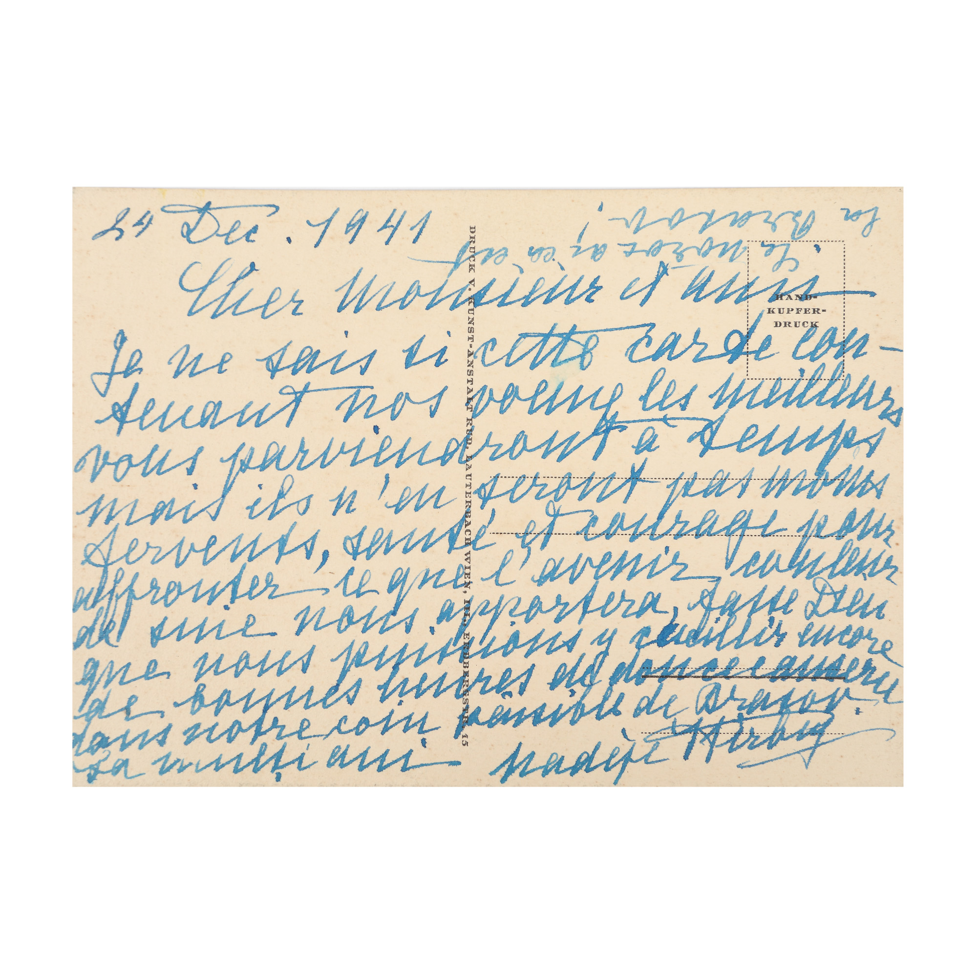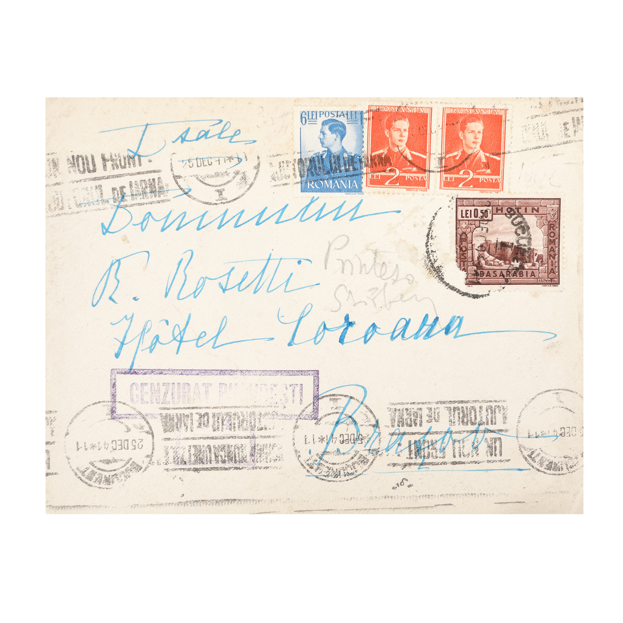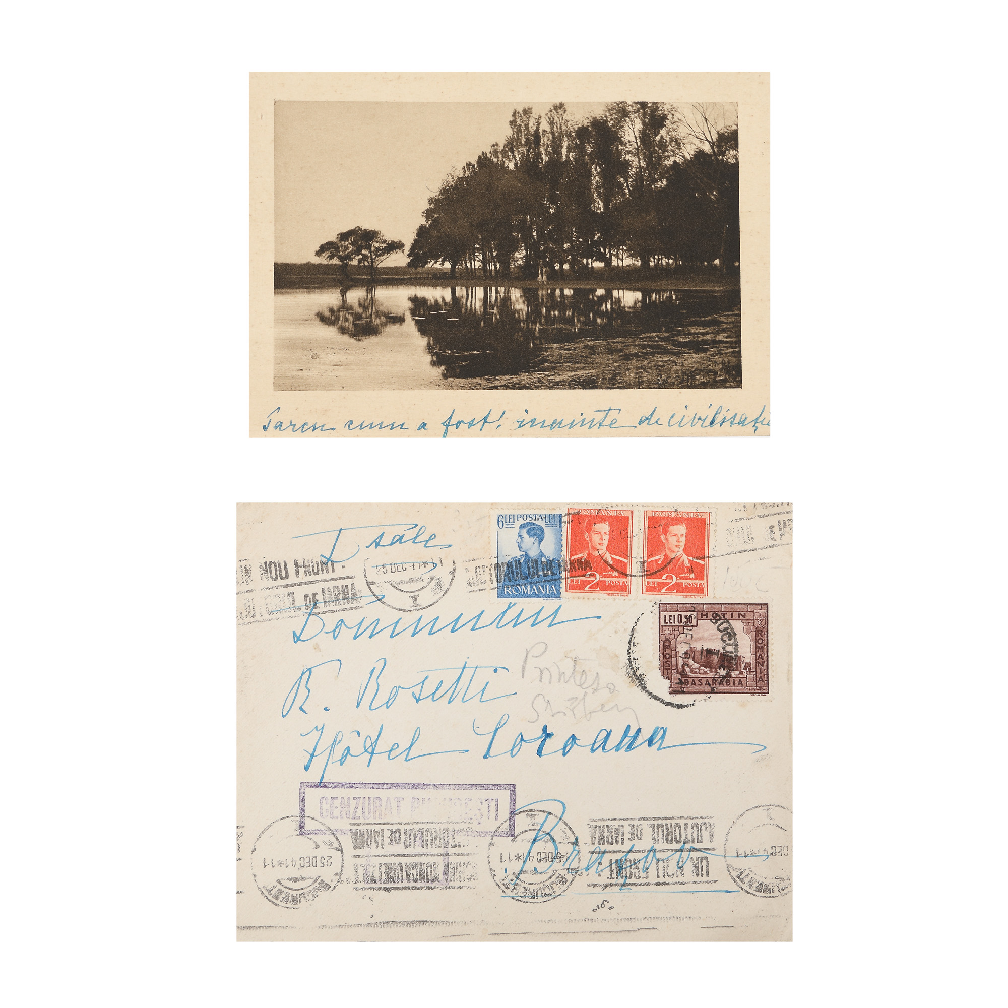 224. Carte poștală trimisă de prințesa Nadeja Bibescu Ștribey către istoricul Radu R. Rosetti, 24 decembrie 1941, cu semnătura olografă și plicul original