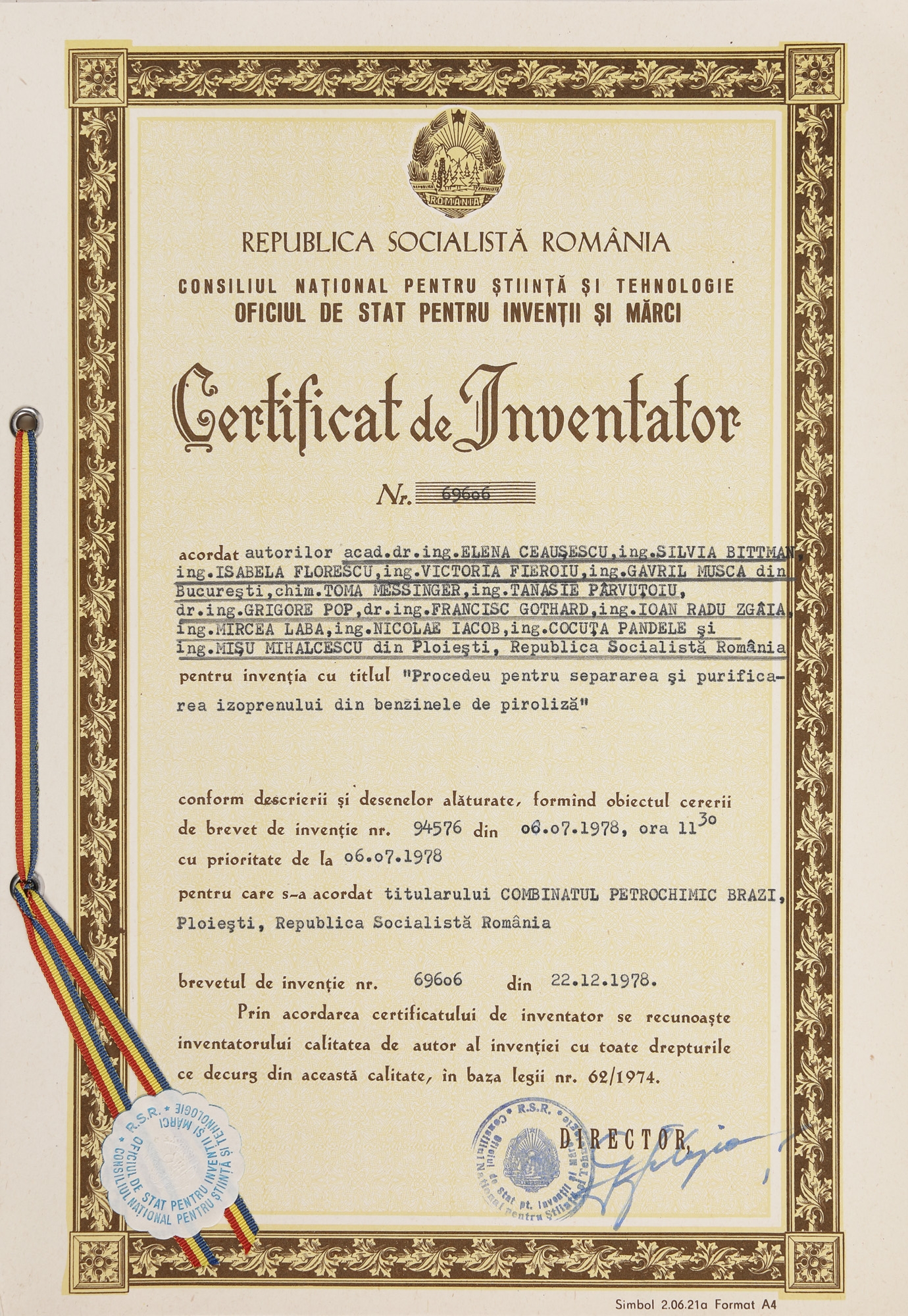 211. Certificatul de inventator al Elenei Ceaușescu, 22 decembrie 1978