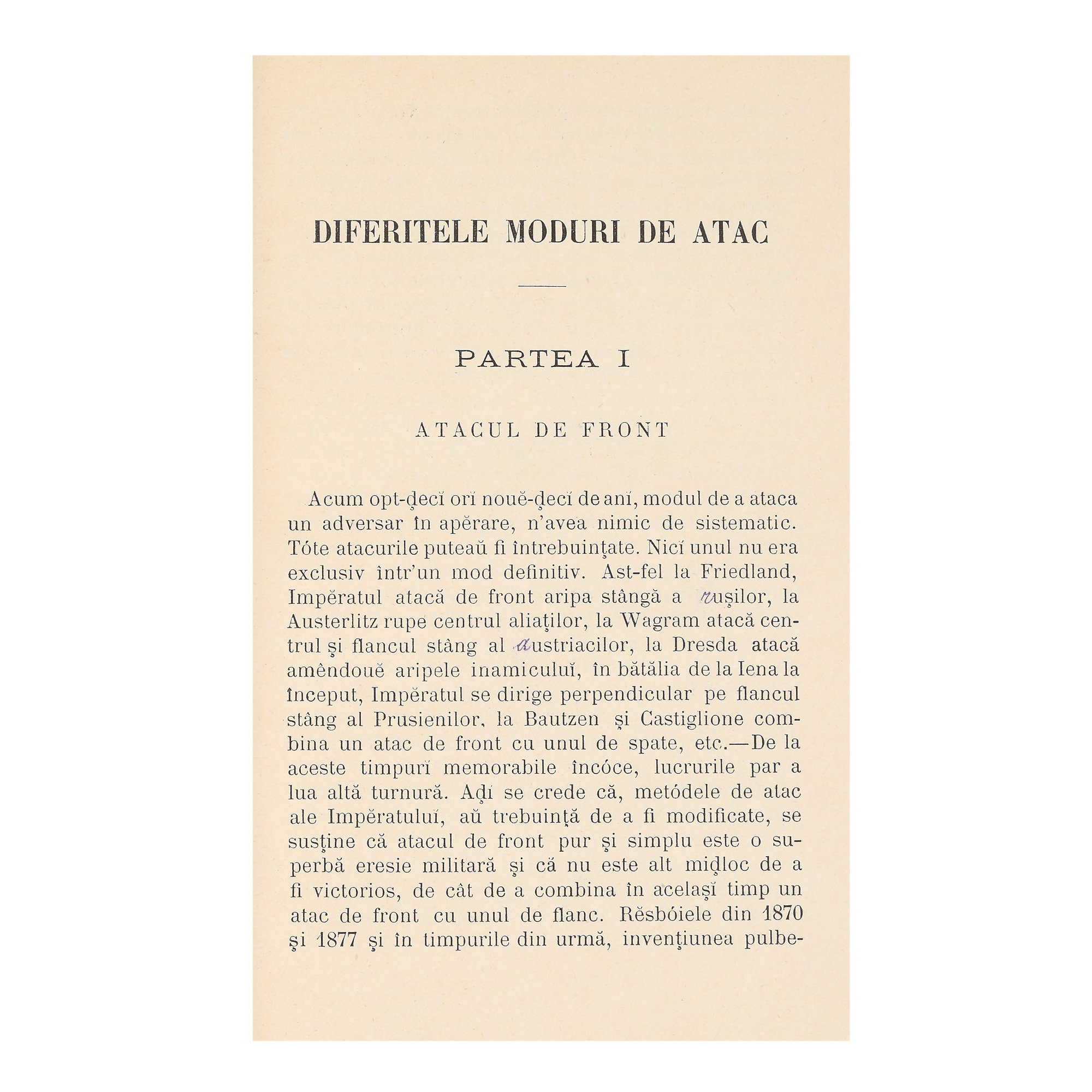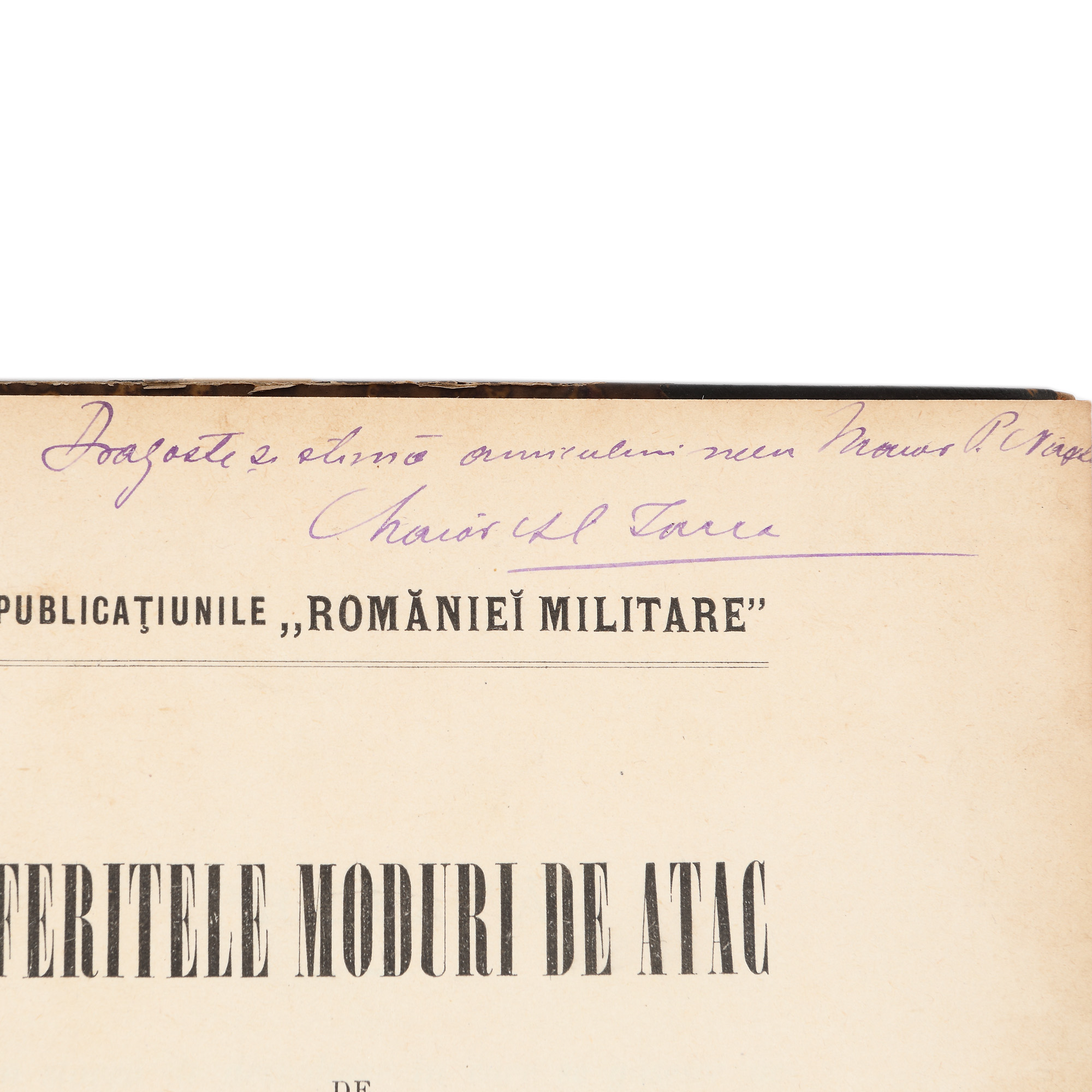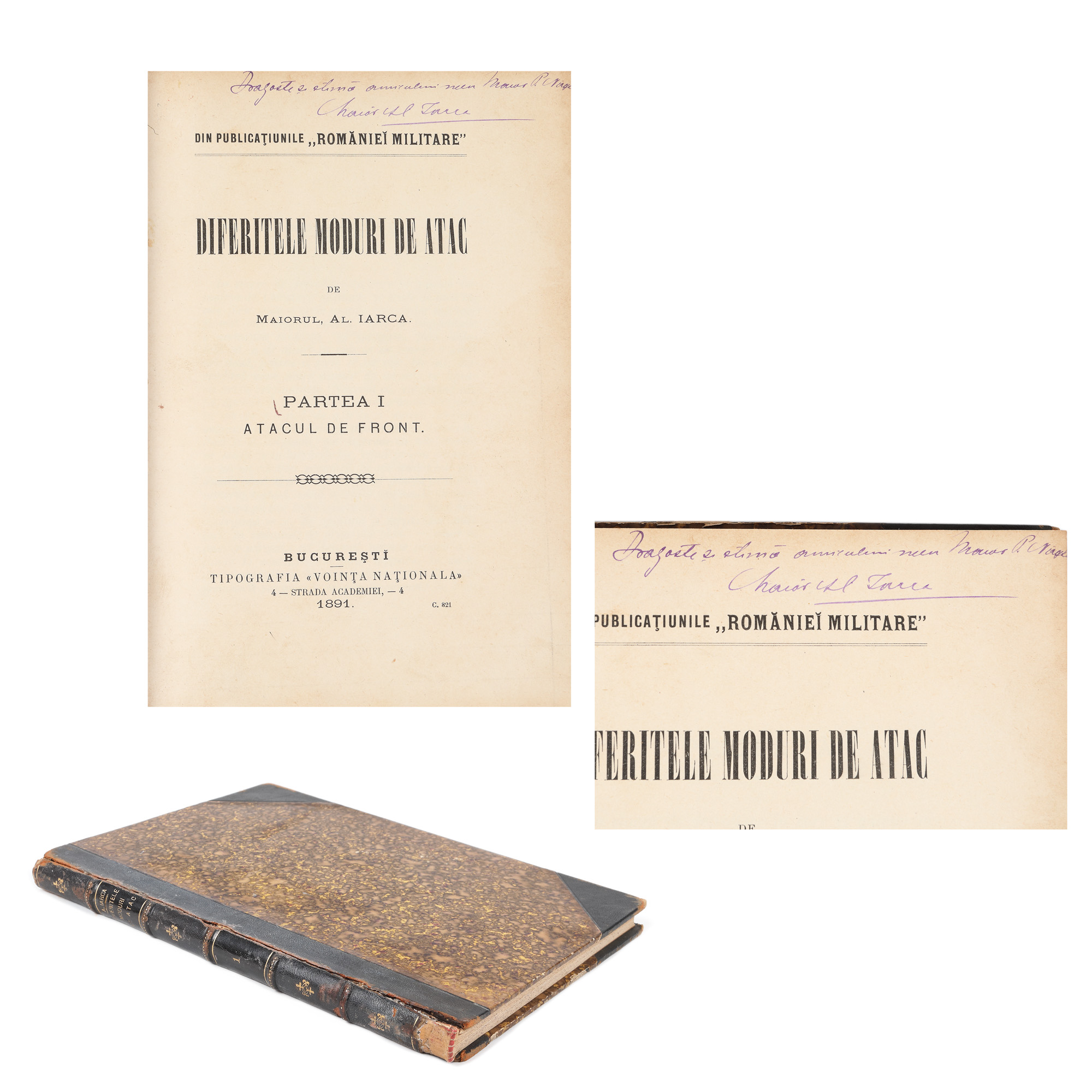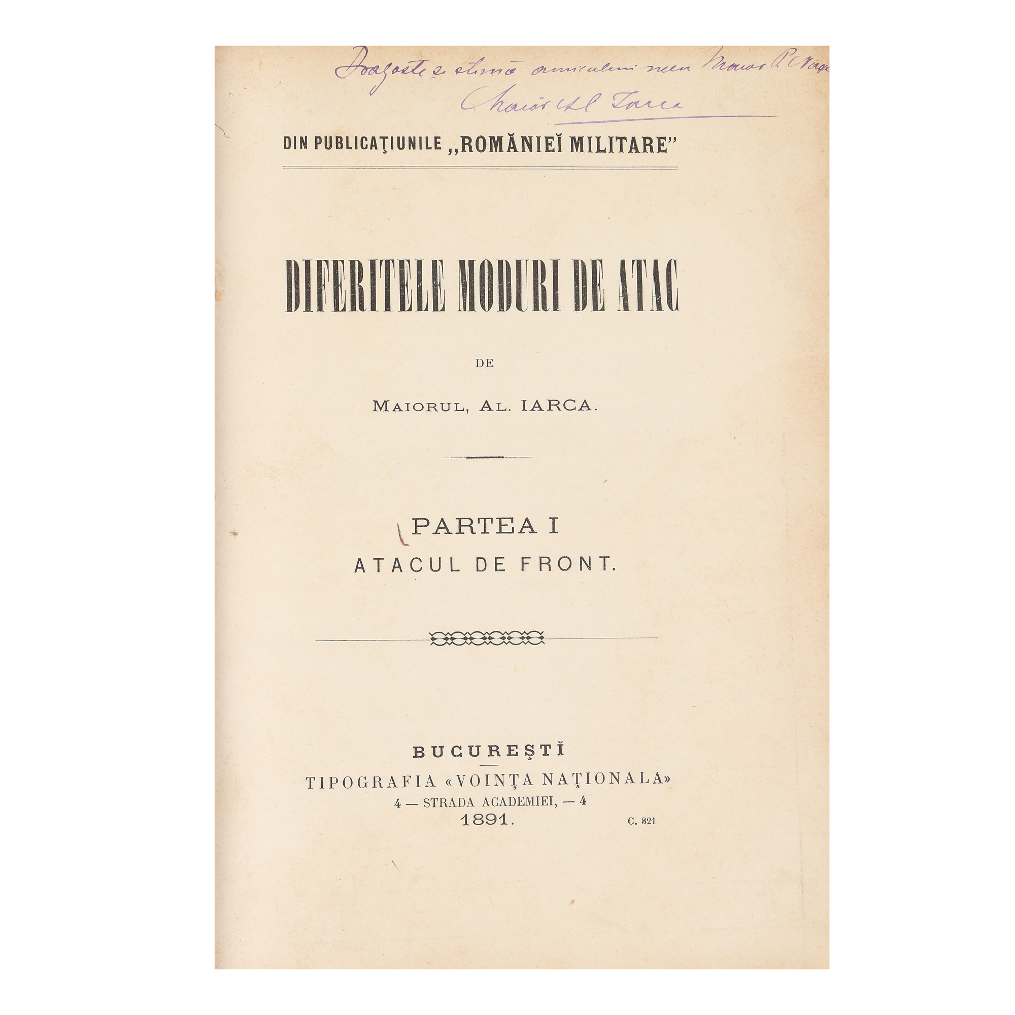 196. ”Diferitele moduri de atac”, de maior Alexandru Iarca, București, 1891, cu dedicația și semnătura olografă a autorului