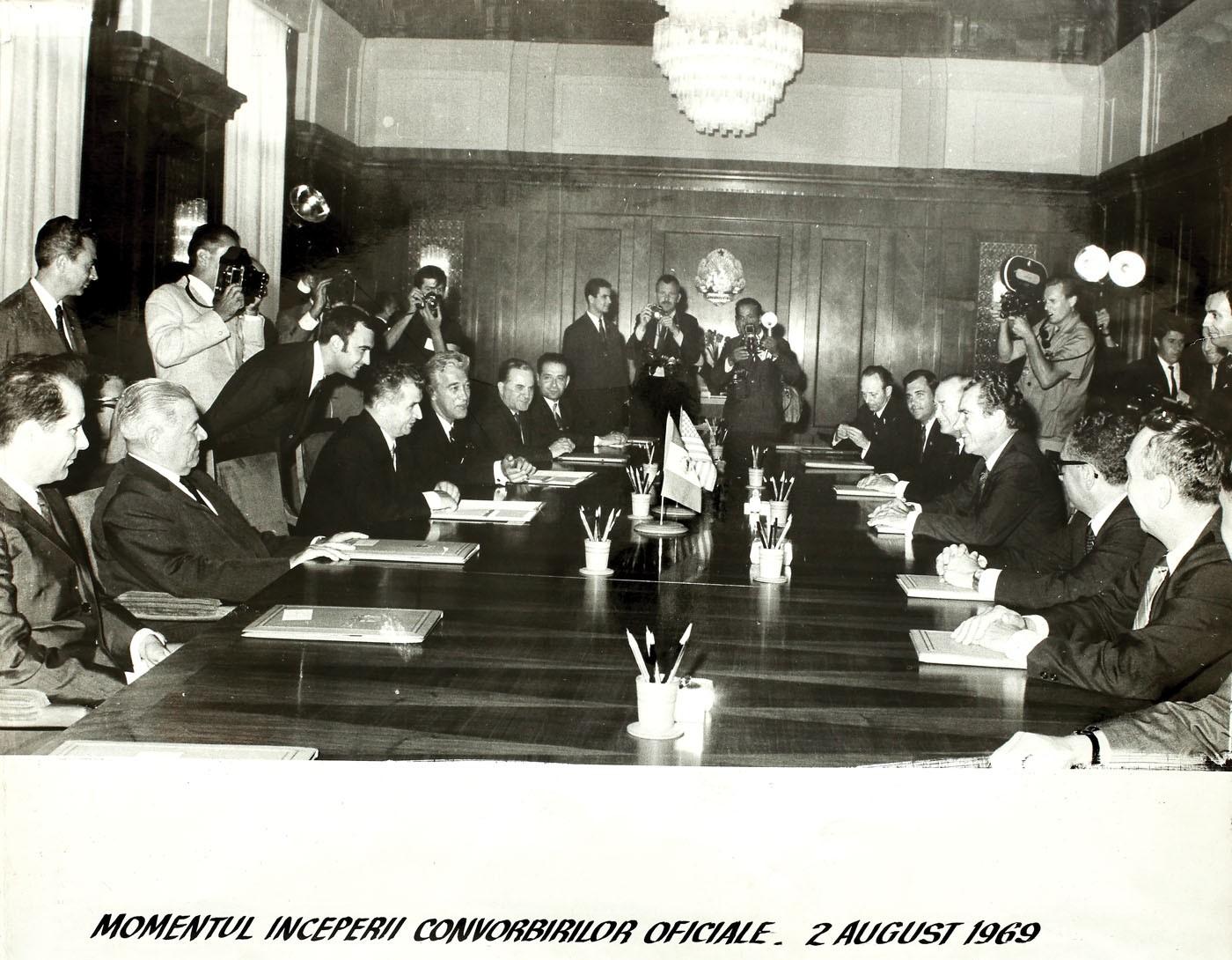 158. Fotografie surprinzând momentul începerii convorbirilor oficiale între Nicolae Ceauşescu şi Richard Nixon, 2 august 1969