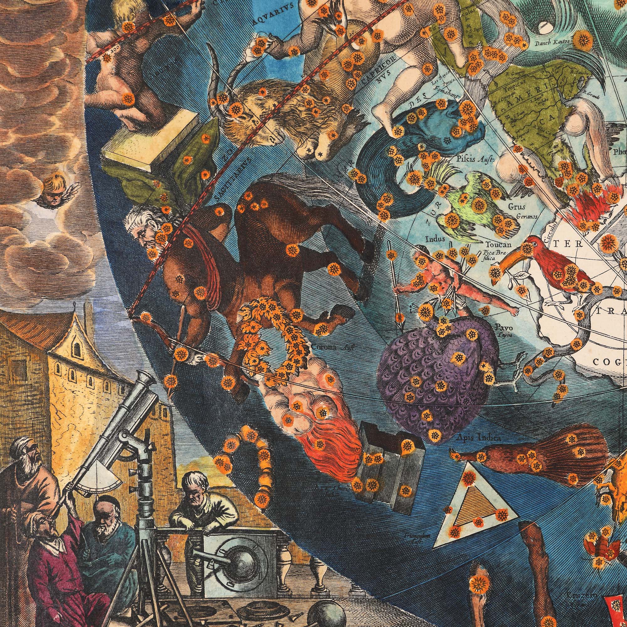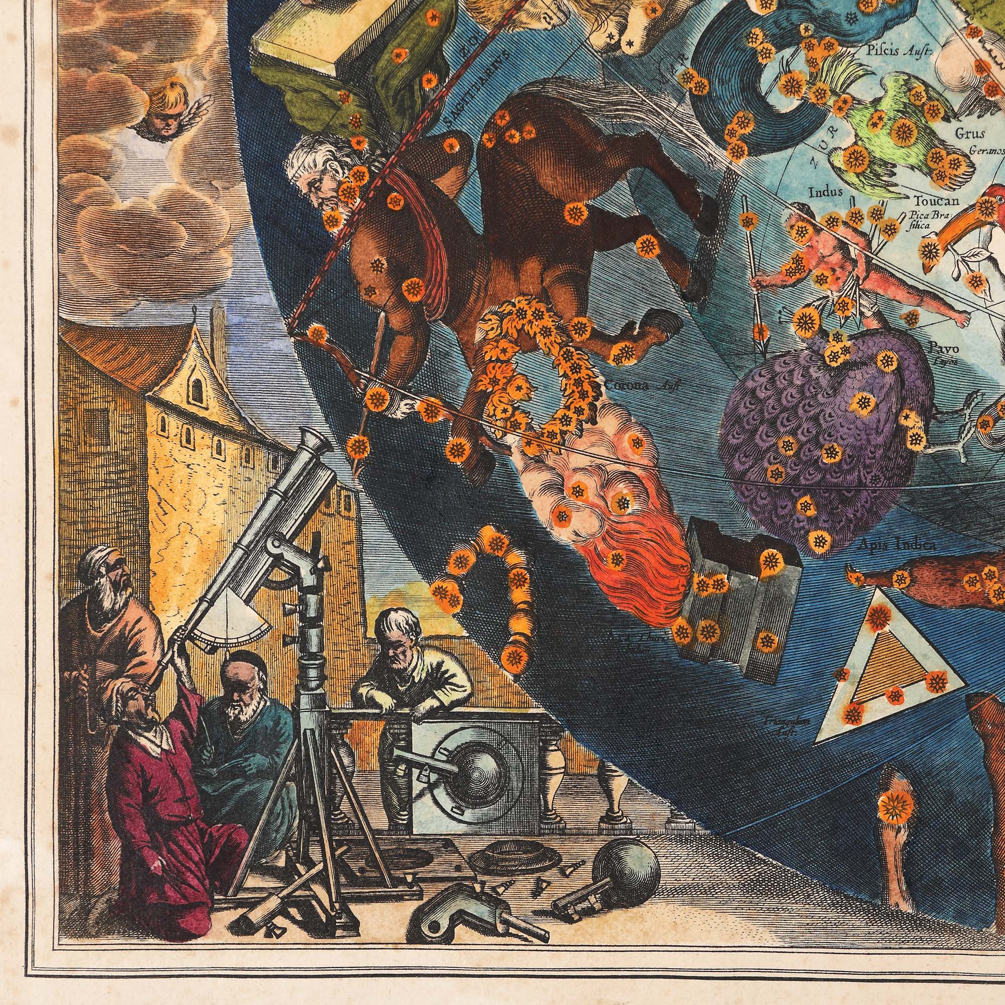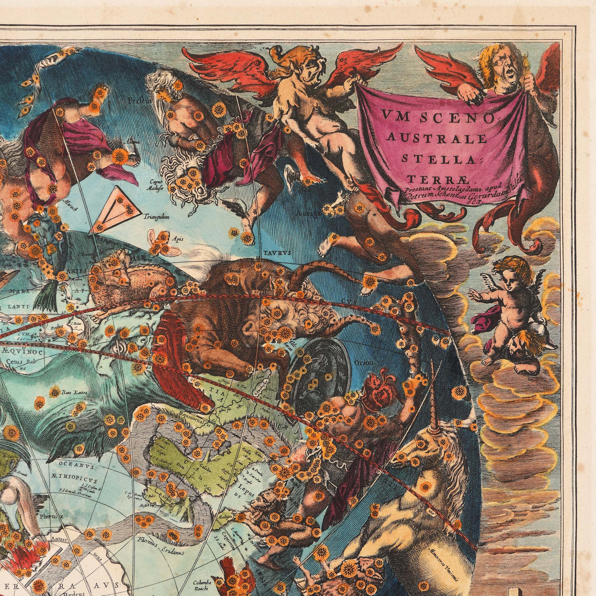 Hartă celestă realizată de gravorul Henricus Hondiu, ilustrând constelațiile emisferei sudice suprapuse peste emisfera polară sudică, publicată pentru prima dată de cartograful Andreas Cellarius în 1660. Harta oferă o impresionantă imagine a stelelor, ca și cum ar fi văzute din adâncul cosmosului, astfel încât fiecare constelație este orientată în direcția opusă față de modul în care aceleași constelații ar fi văzute de pe pământ. Această proiecție reflectă o teorie a lui Petrus Plancius, conform căreia stelele au rămas într-o configurație asemănătoare unei sfere deasupra pământului, care s-a deplasat odată cu pământul. Această teorie se regăsește în titlul atlasului său, Harmonia Macrocosmica. Andreas Cellarius s-a născut în 1596 la Neuhausen și a studiat la Heidelberg. A emigrat în Olanda la începutul secolului al XVII-lea și în 1637 s-a mutat la Hoorn, unde a devenit rectorul Școlii Latine. Cea mai cunoscută lucrare a lui Cellarius este Harmonia Macrocosmica, publicată pentru prima dată în 1660 de Jan Jansson, ca supliment la Atlas Novus al lui Jansson. Lucrarea constă într-o serie de hărți celesti începute de Cellarius în 1647 și destinate ca parte a unui tratat în două volume despre cosmografie, care nu a fost niciodată publicat. Hărțile lui Cellarius sunt cele mai căutate dintre hărțile cerești, îmbinând imaginile izbitoare ale epocii de aur a cartografiei olandeze cu cunoștințele științifice contemporane.