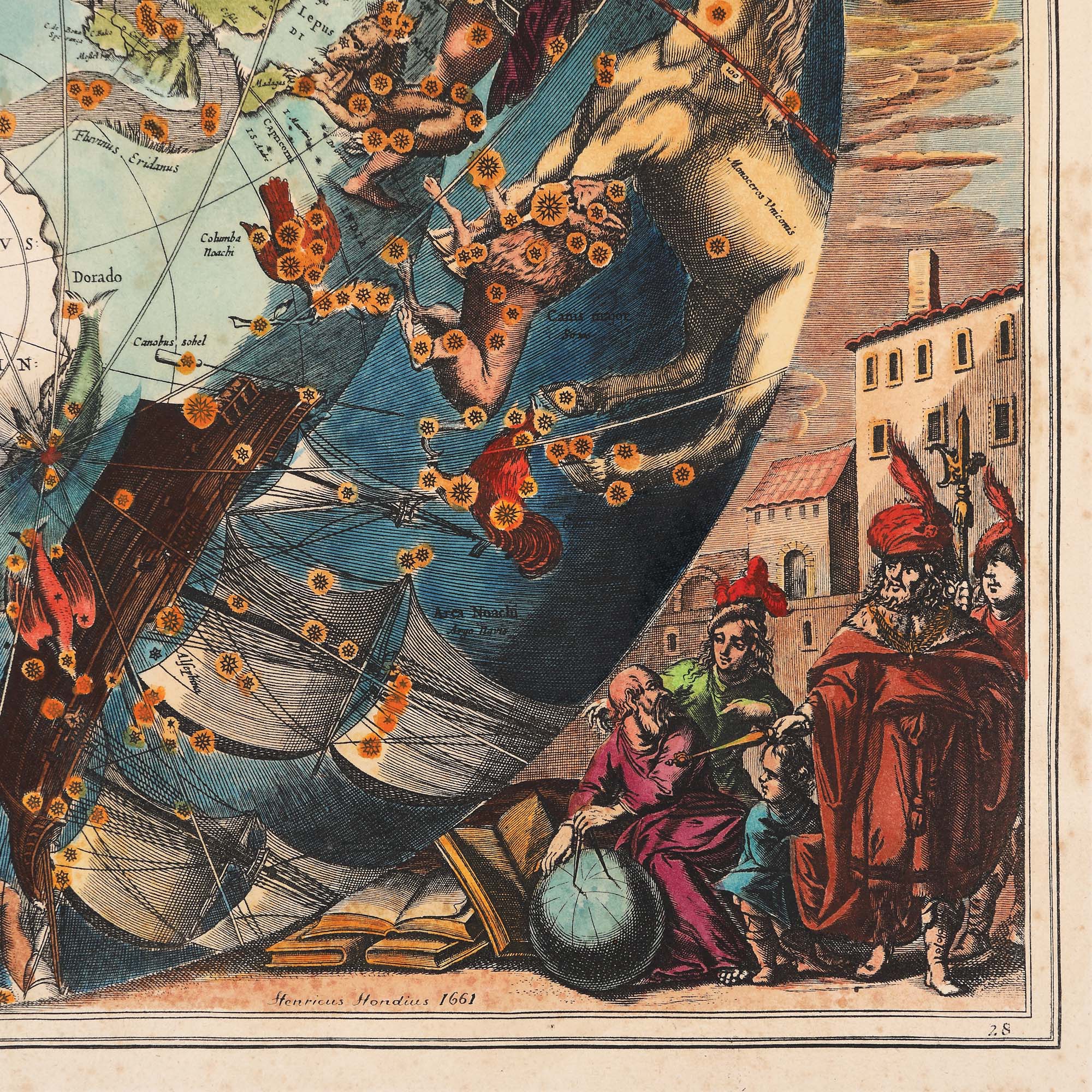 72. Hartă celestă ”Stelele și pământul în emisfera sudică (Haemisphaerium Scenographicum Australe Coeli Stellati Et Terrae)”, de Henricus Hondius, Amsterdam, 1661, piesă foarte rară, de colecție