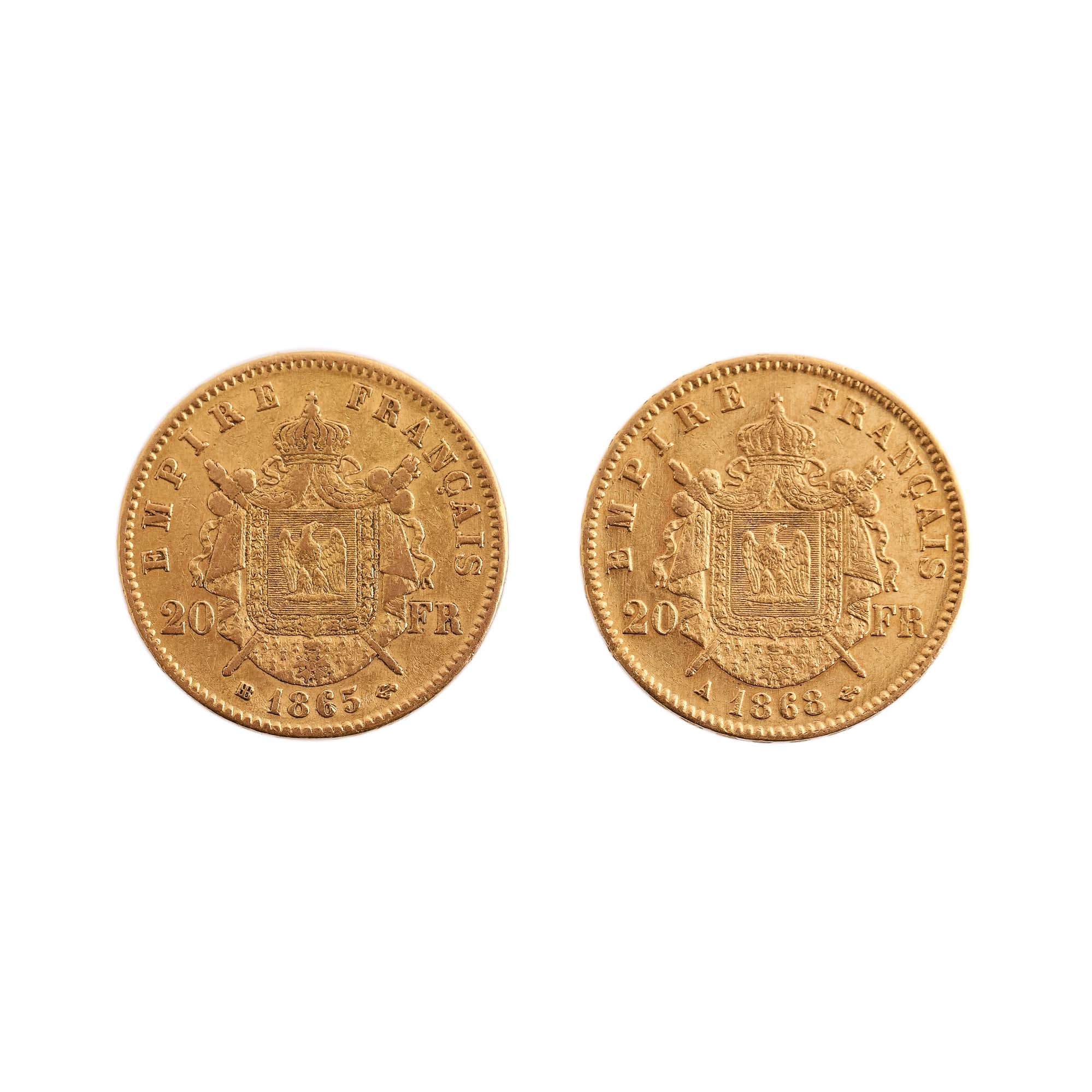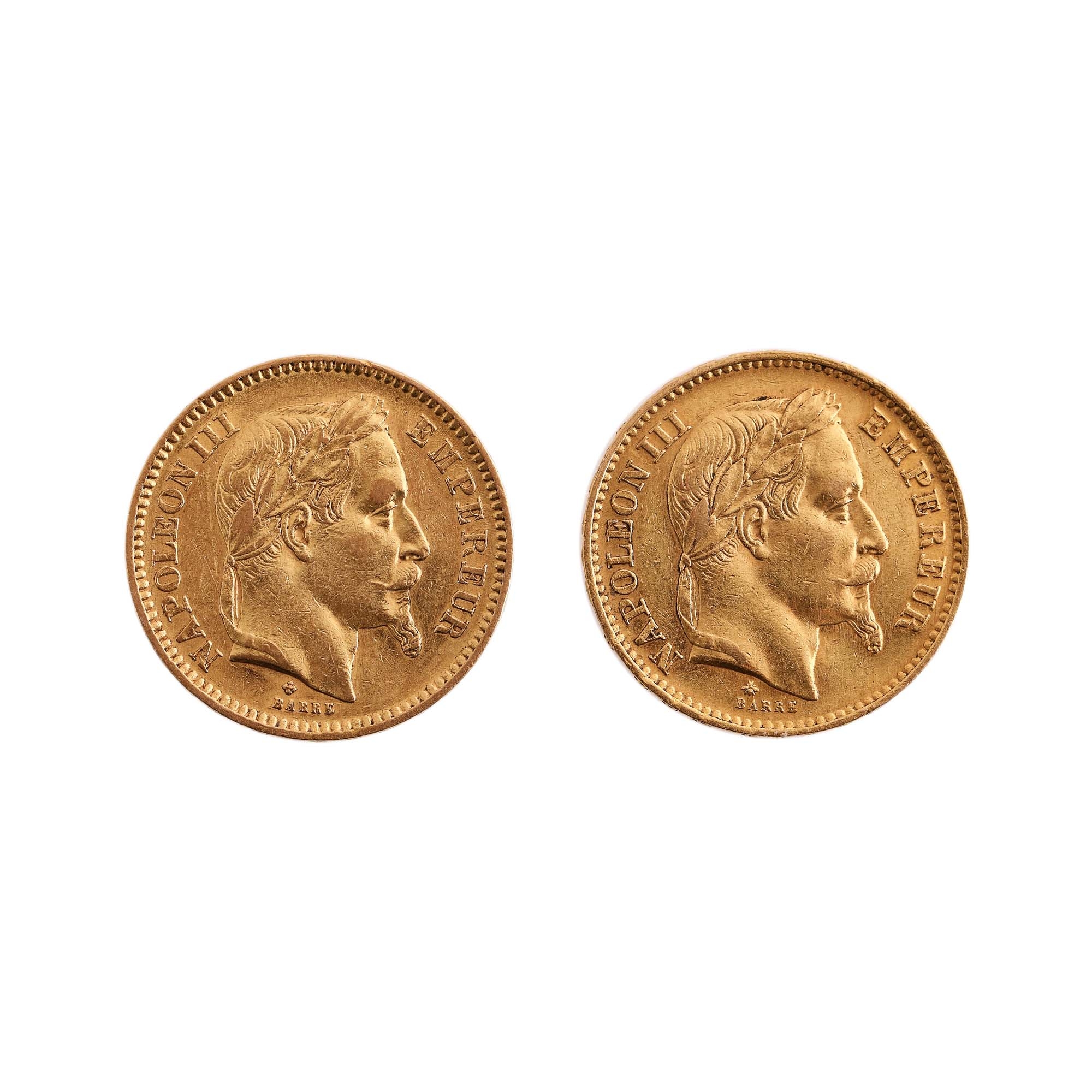 116. Lot format din 2 monede de 20 Franci 1869, 1865, Franța, aur