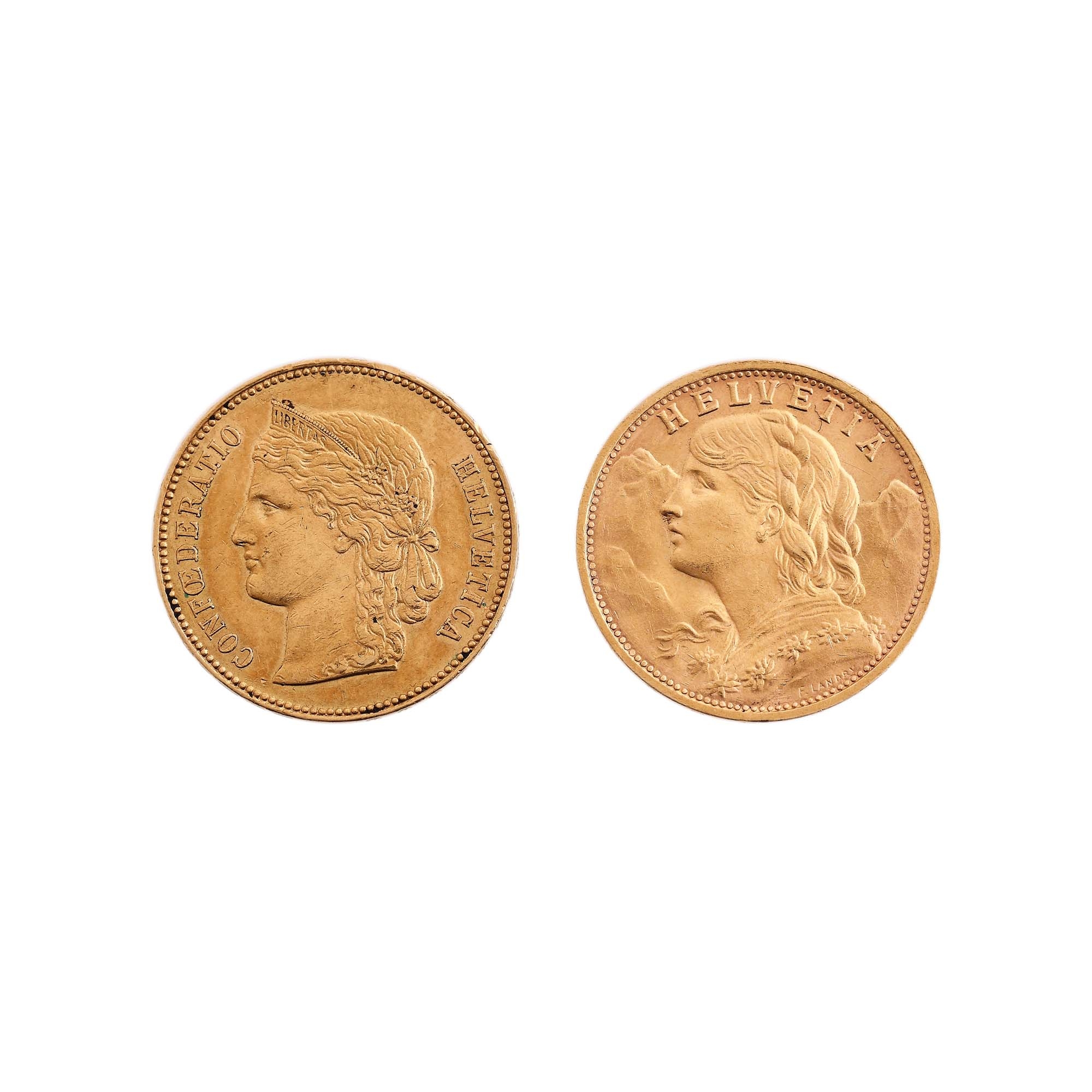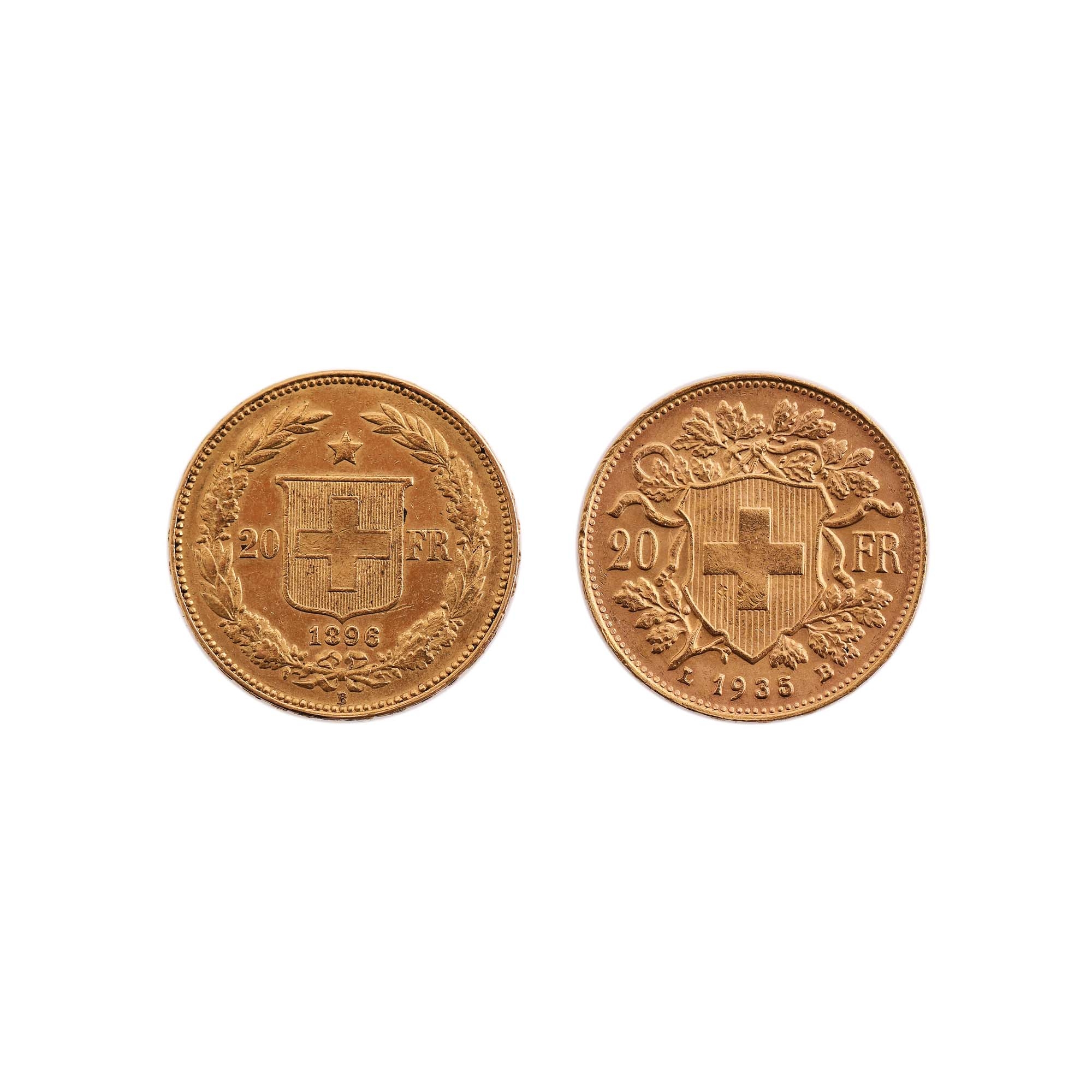 111. Lot format din 2 monede de 20 Franci 1896, 1935, Elveția, aur