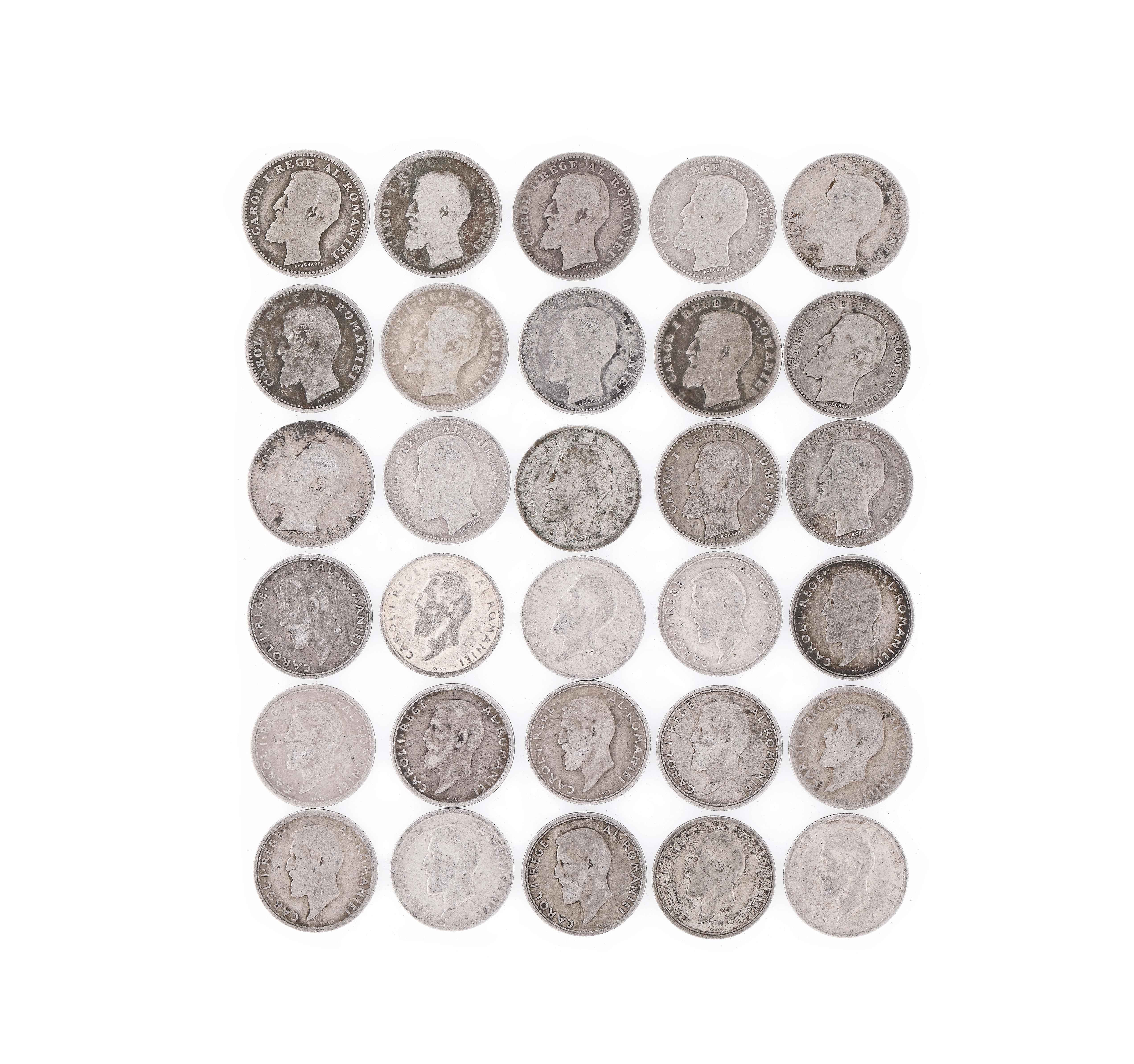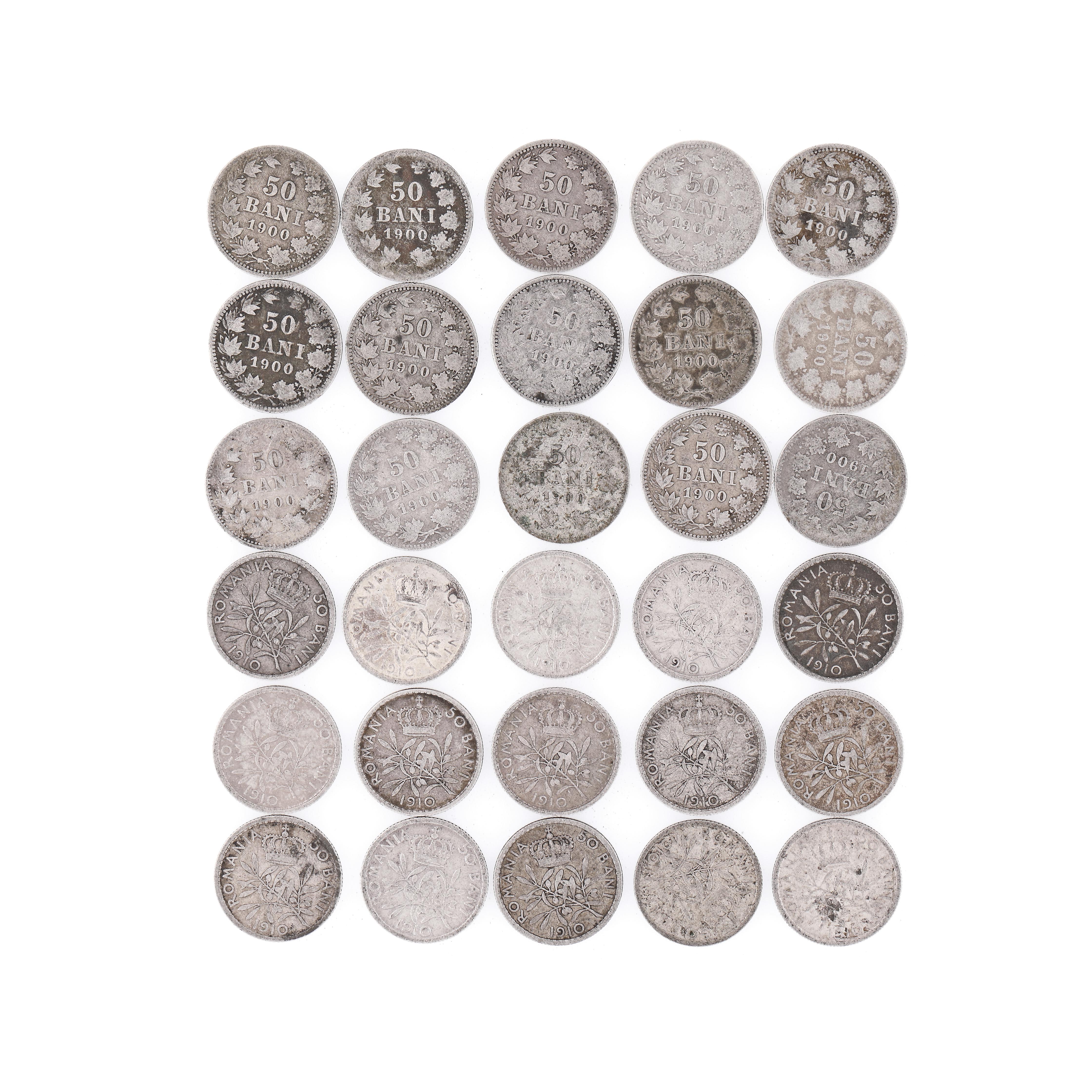 90. Lot format din 30 de monede din argint, cu portretul regelui Carol I, 50 Bani 1900 și 1910