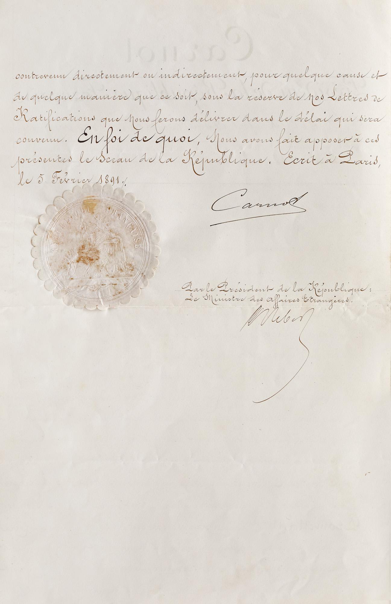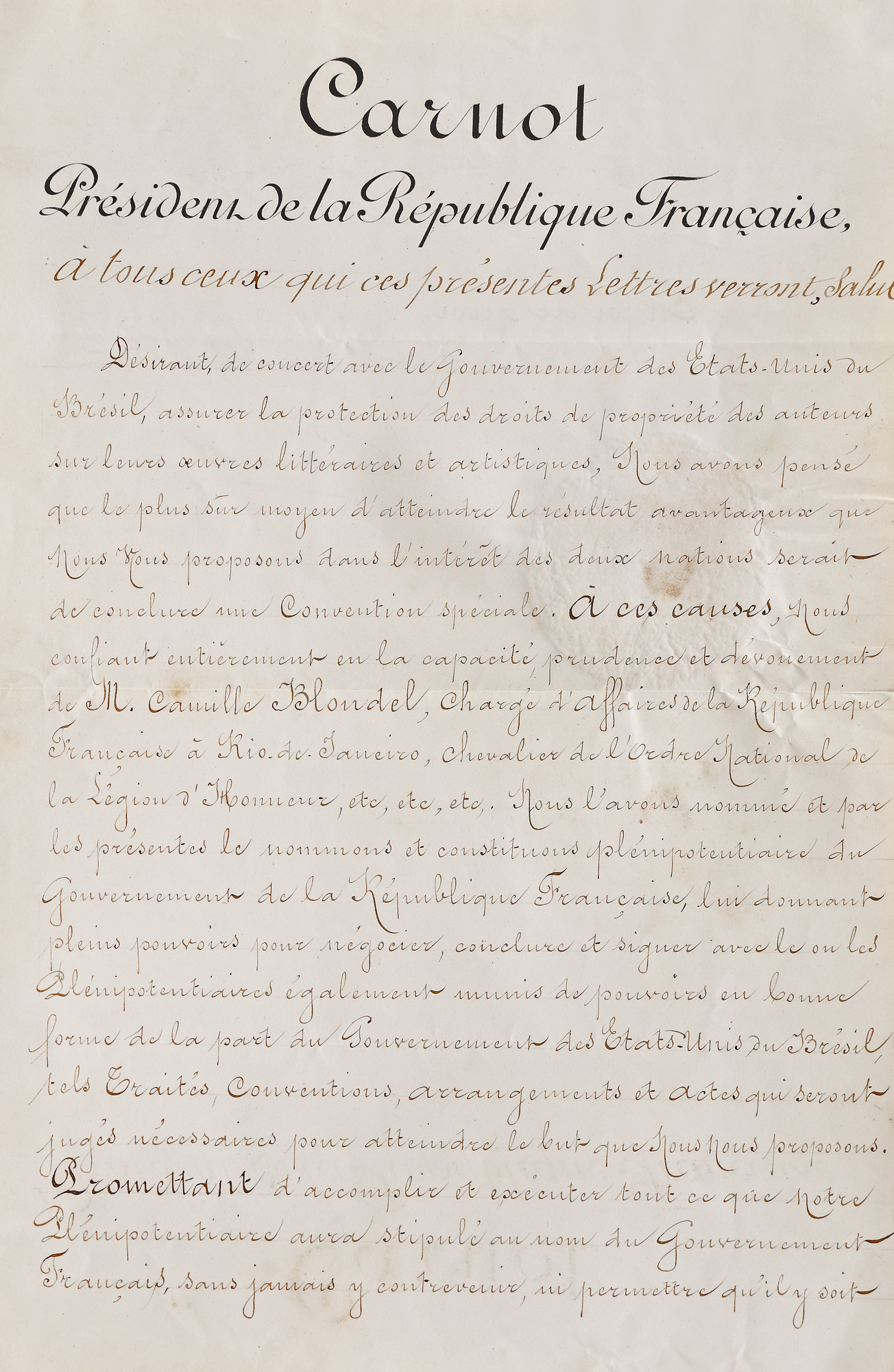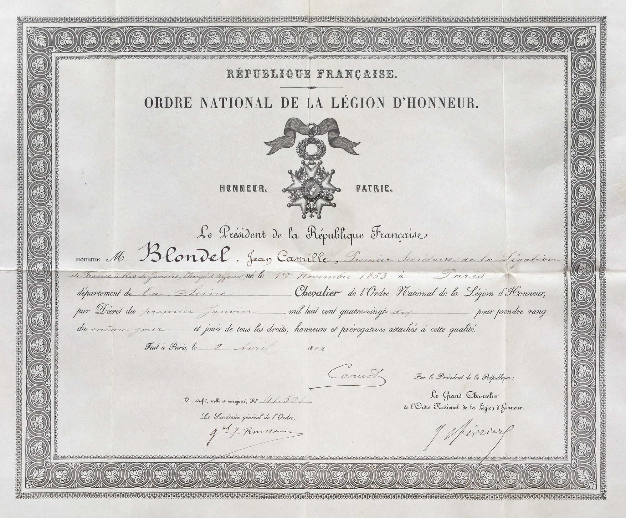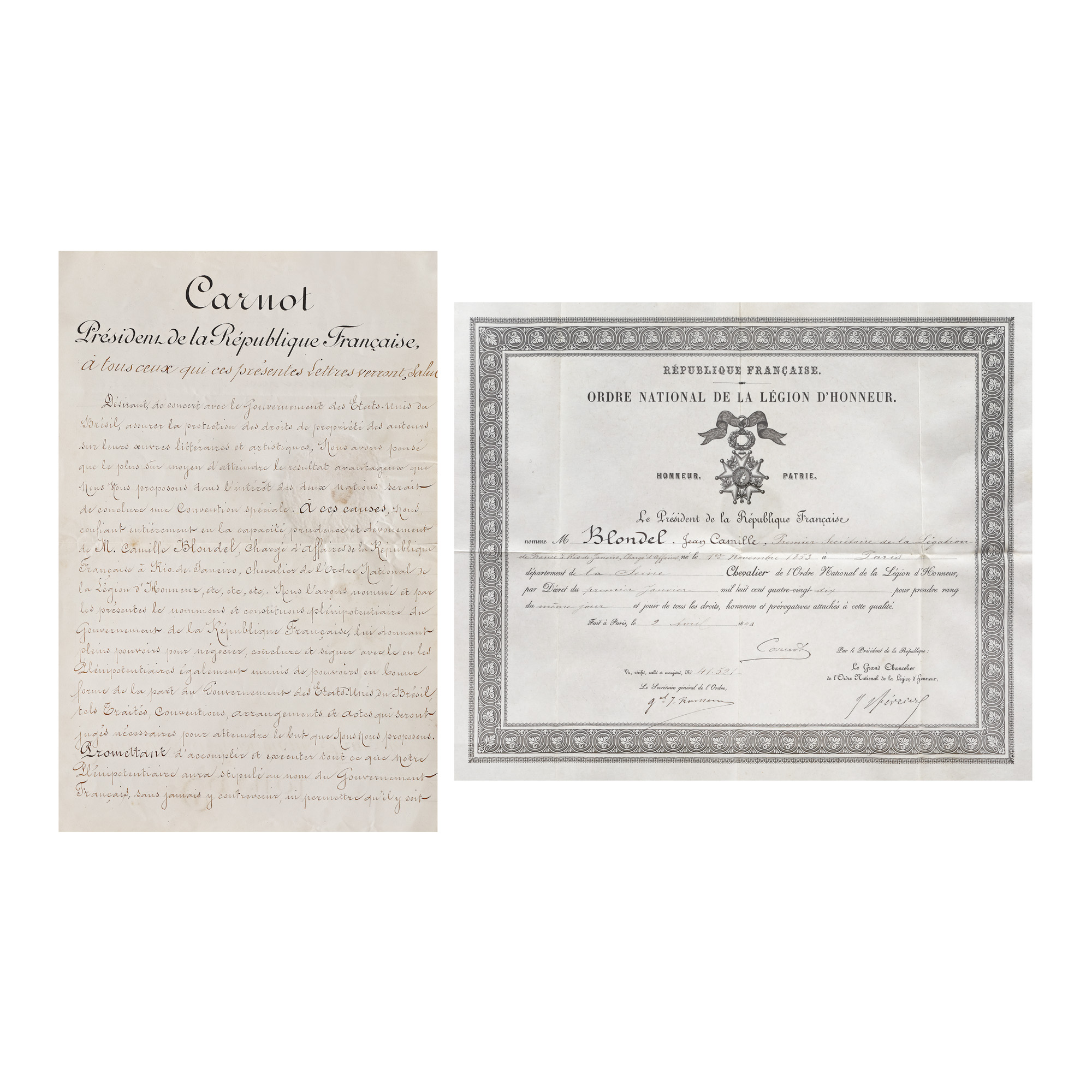 210. Lot format din brevetul de conferire către Camille Blondel a ordinului național al Legiunii de Onoare în grad de cavaler și decretul prezidențial de numire în funcția ”charge d'affaires” la Rio de Janeiro, 1890-1891