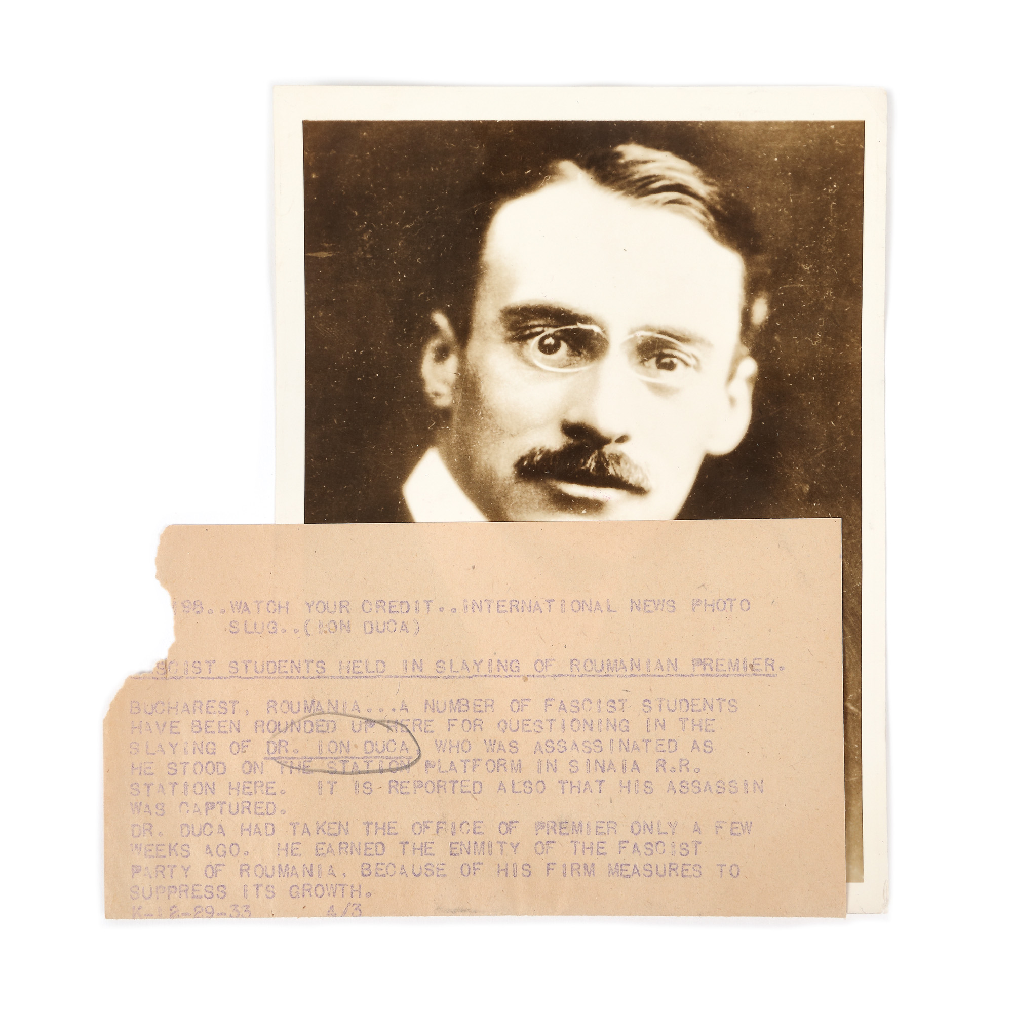 167IC. Lot format din două fotografii ilustrându-i pe prim-ministrul Ion Gheorghe Duca și pe asasinul acestuia, Nicolae Constantinescu, conducătorul unui comando legionar, provin din arhiva International News Photo, cca. 1933