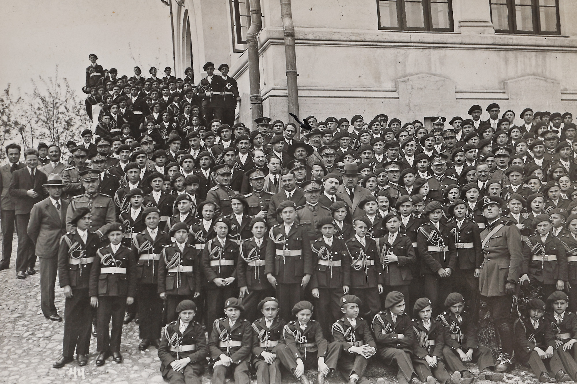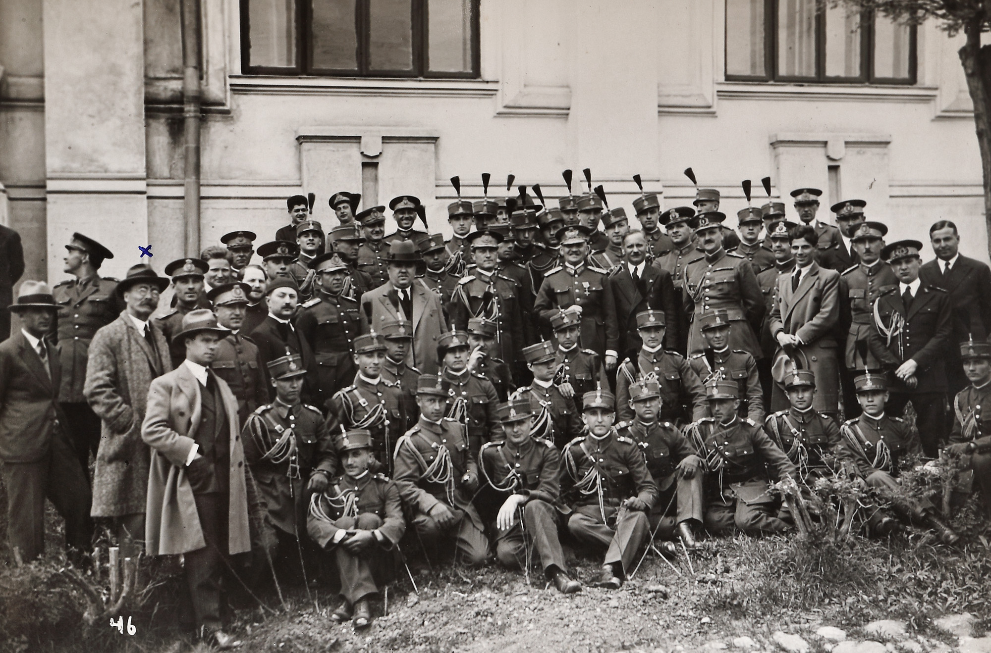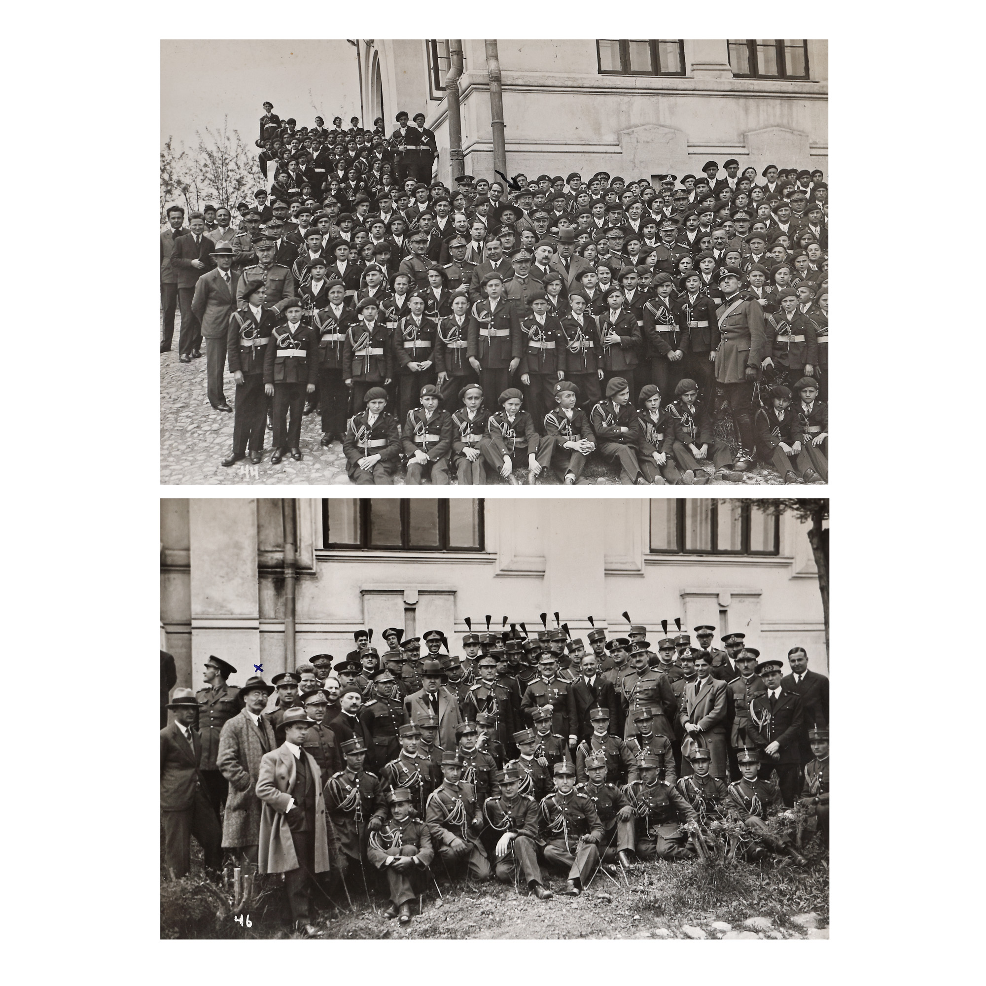 163. Lot format din două fotografii ilustrându-l pe Președintele Consiliului de Miniștri Alexandru Vaida-Voevod, alături de promoțiile Liceului Militar ”Nicolae Filipescu” de la Mănăstirea Dealu, atelier fotografic M. Vesa, 1932, cu semnătura olografă a omului politic