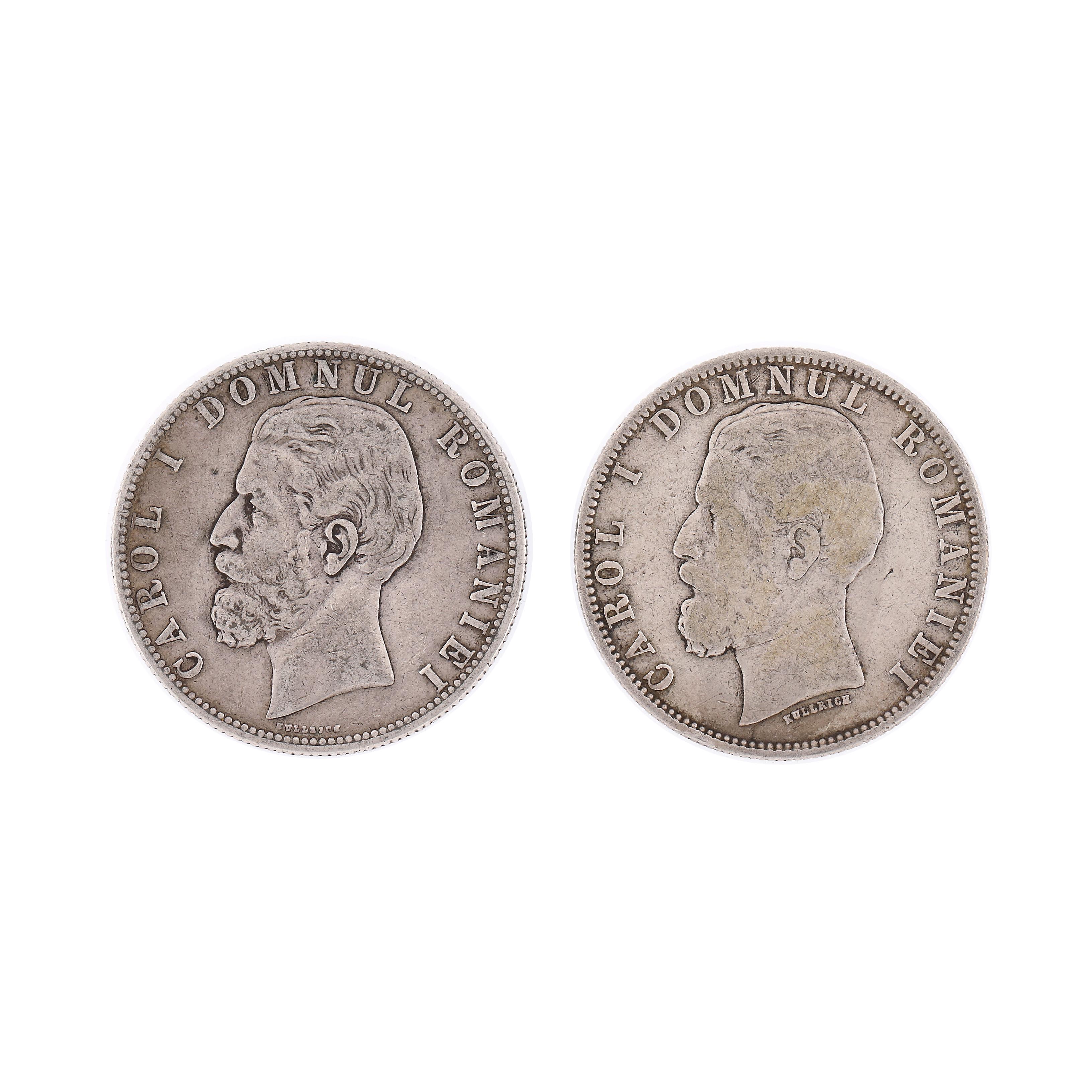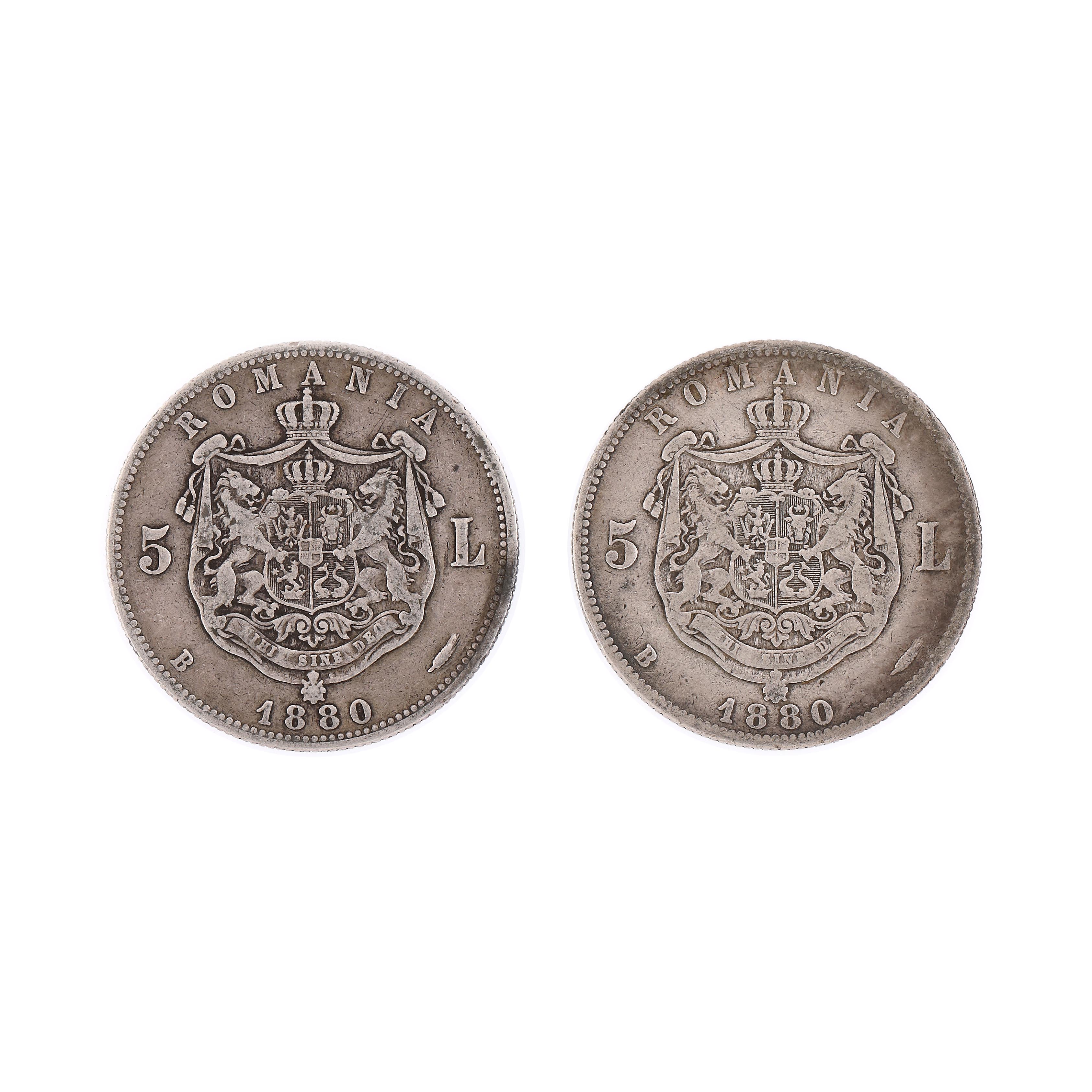 131. Lot format din două variante ale monedei de argint 5 Lei 1880, cu semnătura gravorului Kullrich pe cerc și sub gât