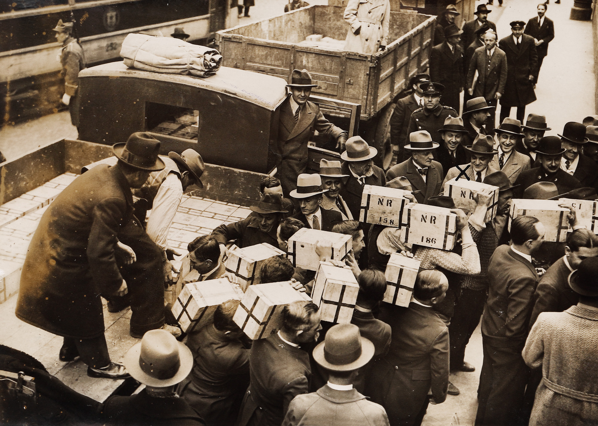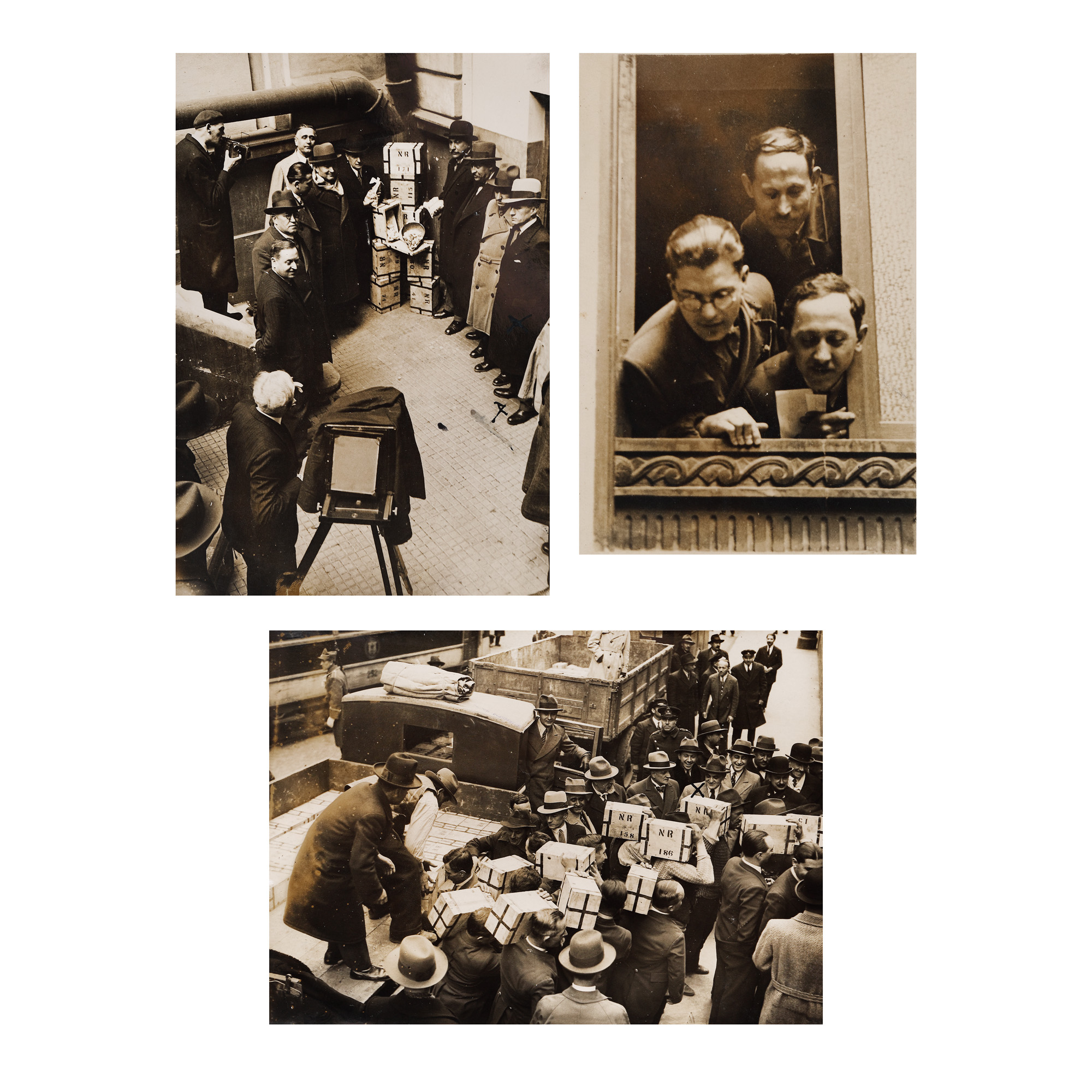150A. Lot format din trei fotografii ilustrând repatrierea aurului Băncii Naționale a României, în prezența guvernatorului Grigore Dimitrescu și a reprezentantului Băncii Angliei, Ernest Fuchs, fotograf Iosif Berman, 1935