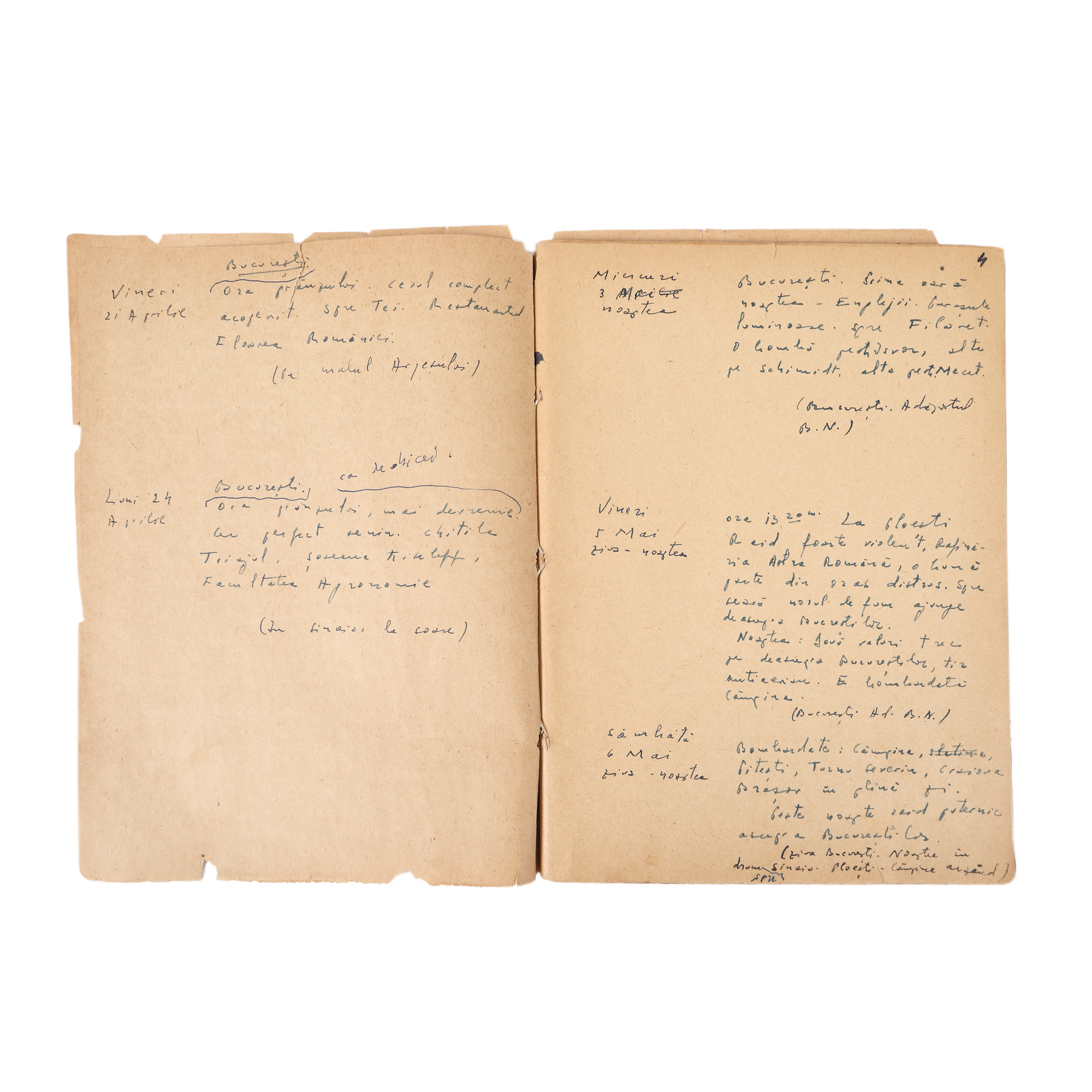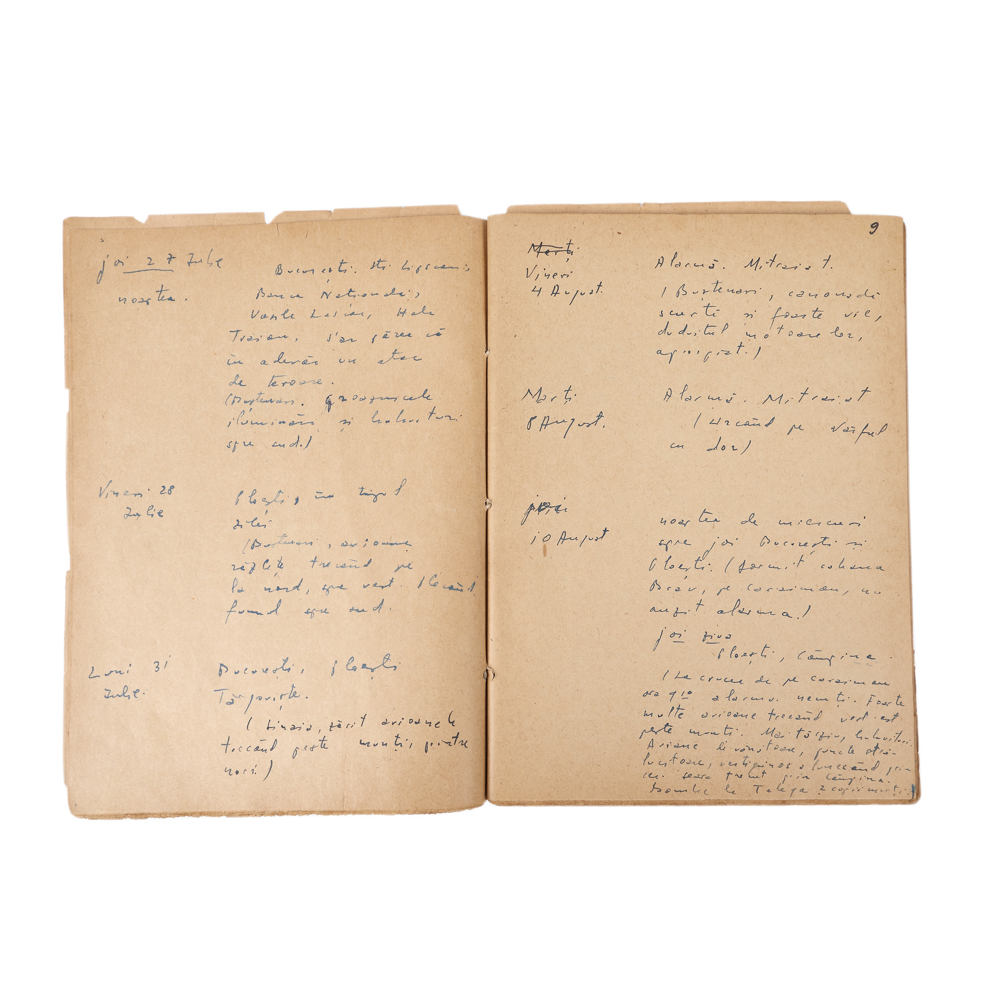 215. Manuscrisul ”Jurnal de bombardament”, de Geo Bogza, detaliind atacurile aviației americane asupra Ploieștiului, 1943 (24 file)