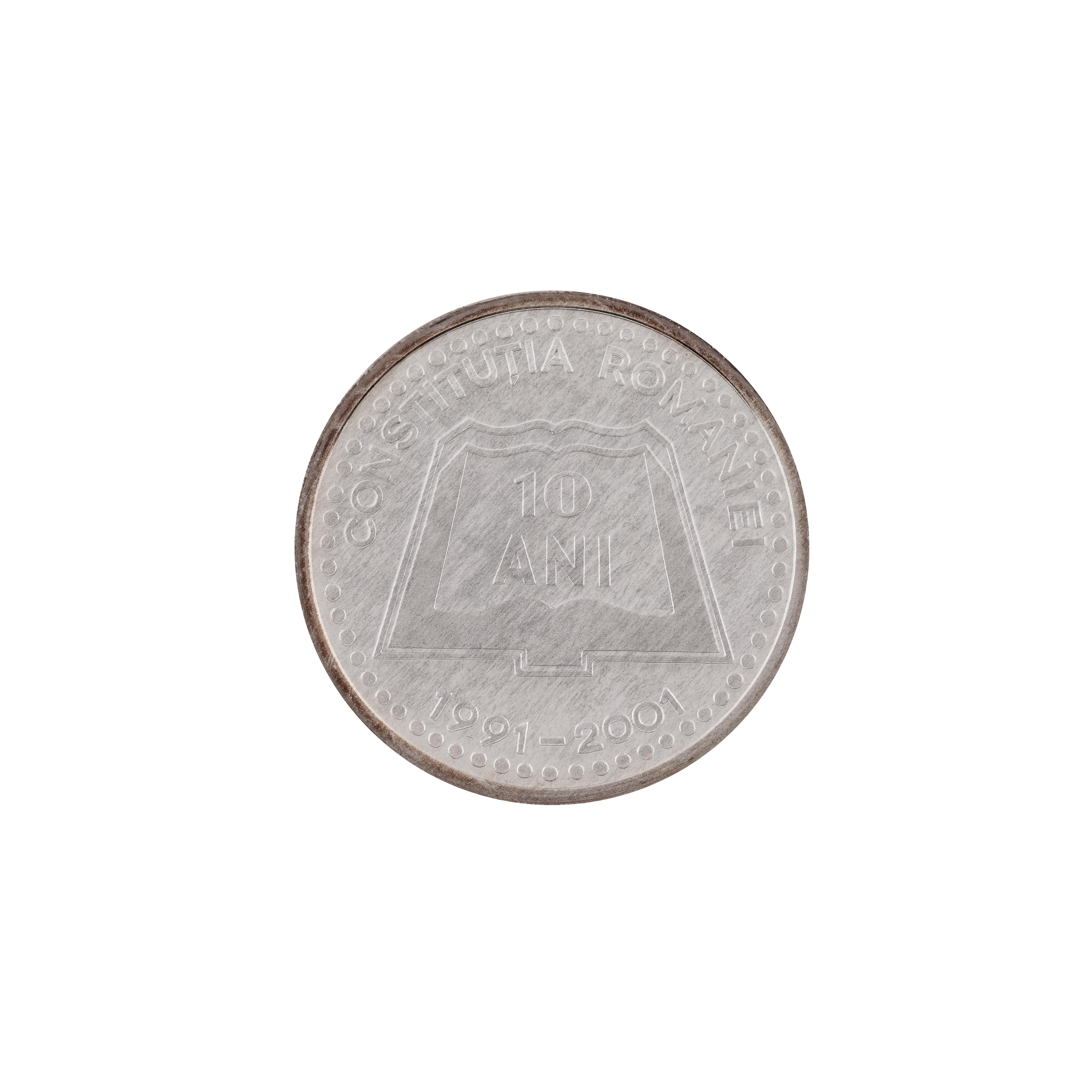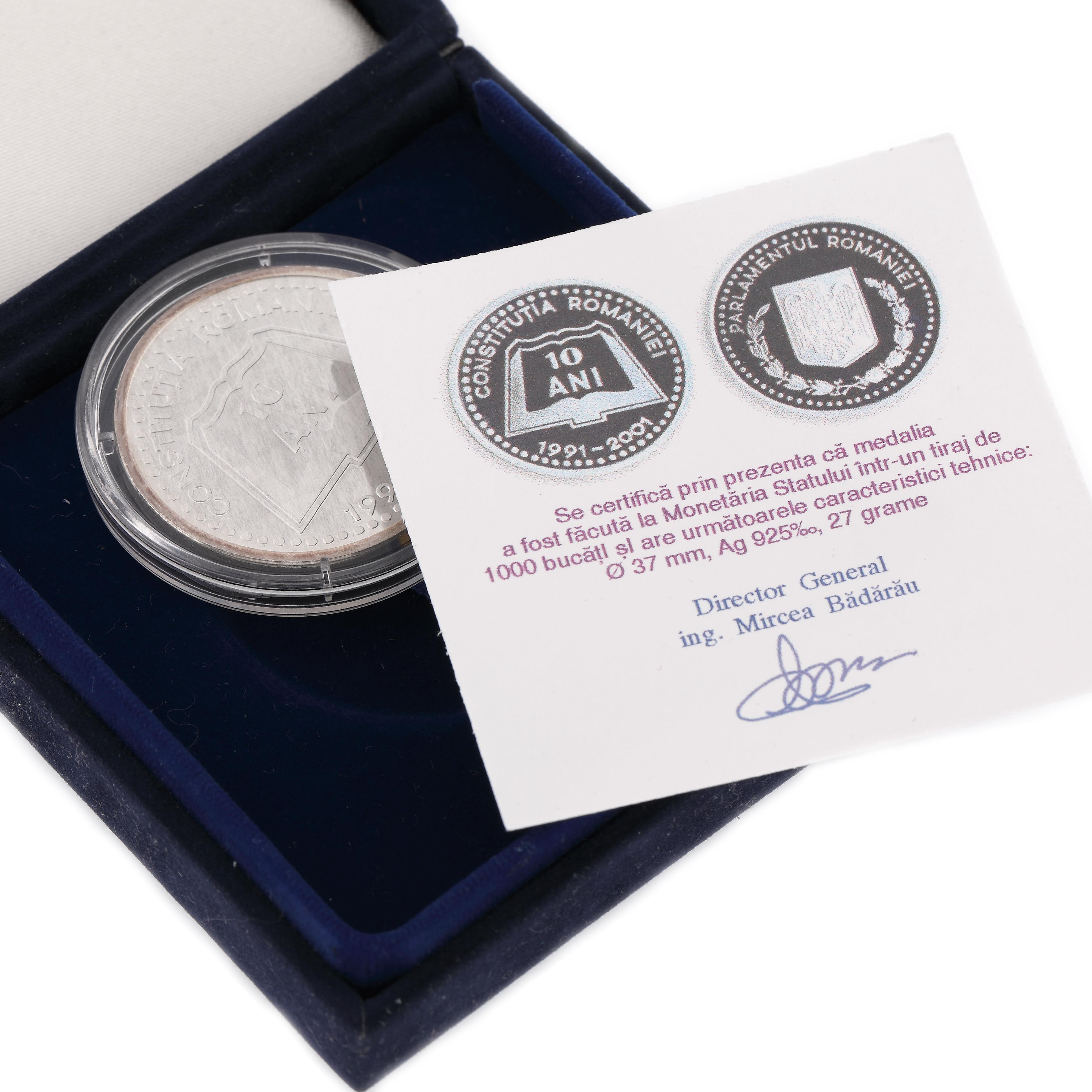 126. Medalia BNR 10 ani de la noua constituție a României, argint, 2001, însoțită de certificat