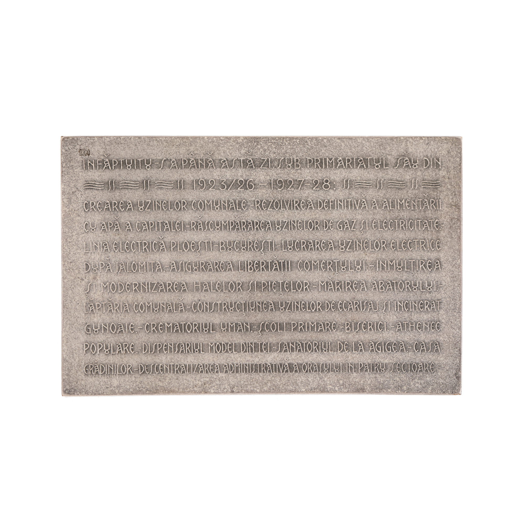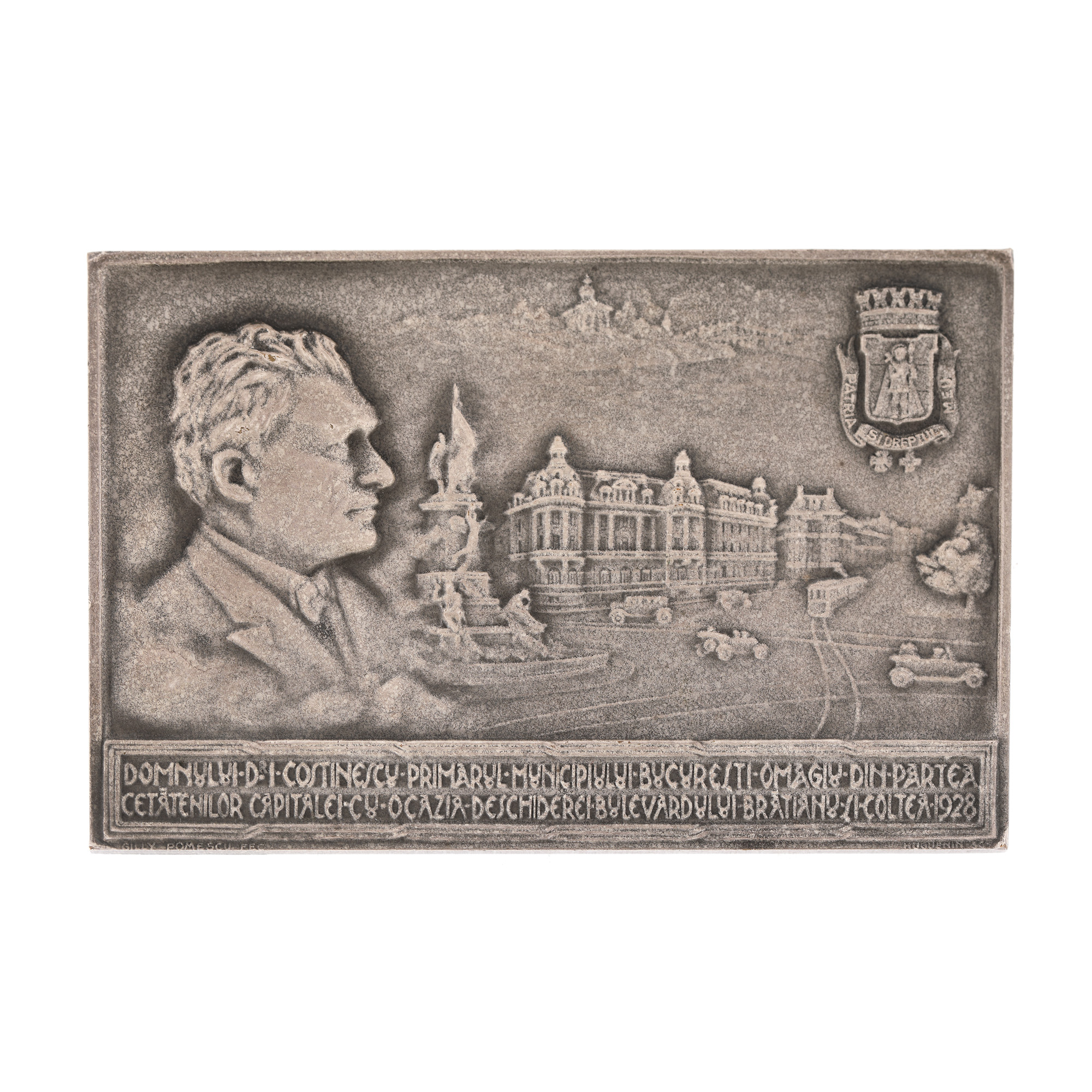 182. Plachetă omagială dedicată primarului Bucureștilor, dr. Ioan E. Costinescu, cu ocazia inaugurării bulevardelor I.C. Brătianu și Colțea, 1928