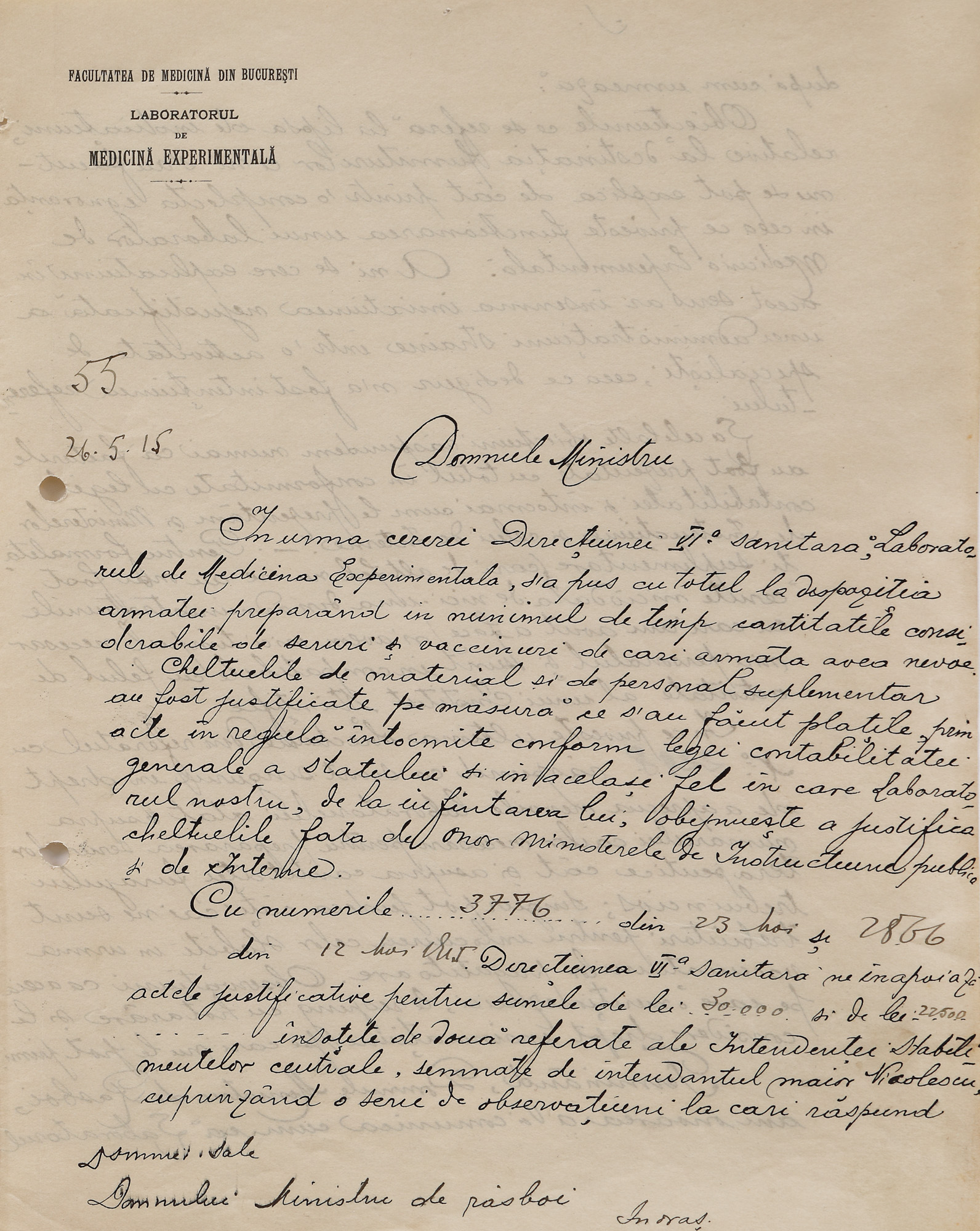 219A. Scrisoare trimisă de creatorul școlii românești de medicină experimentală Ion Cantacuzino către Ion I.C. Brătianu, despre ajutorul dat Armatei Române în Primul Război Mondial, București, 26 mai 1915, cu semnătura olografă (2 file)