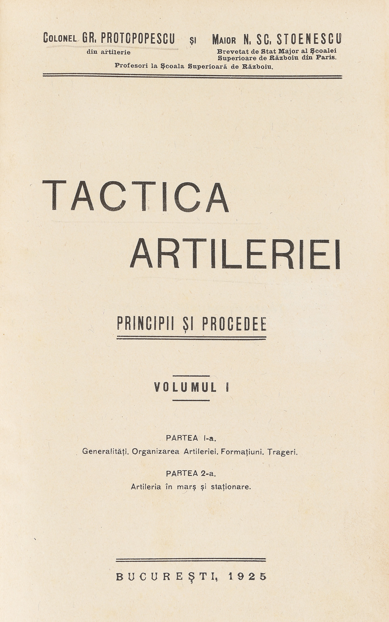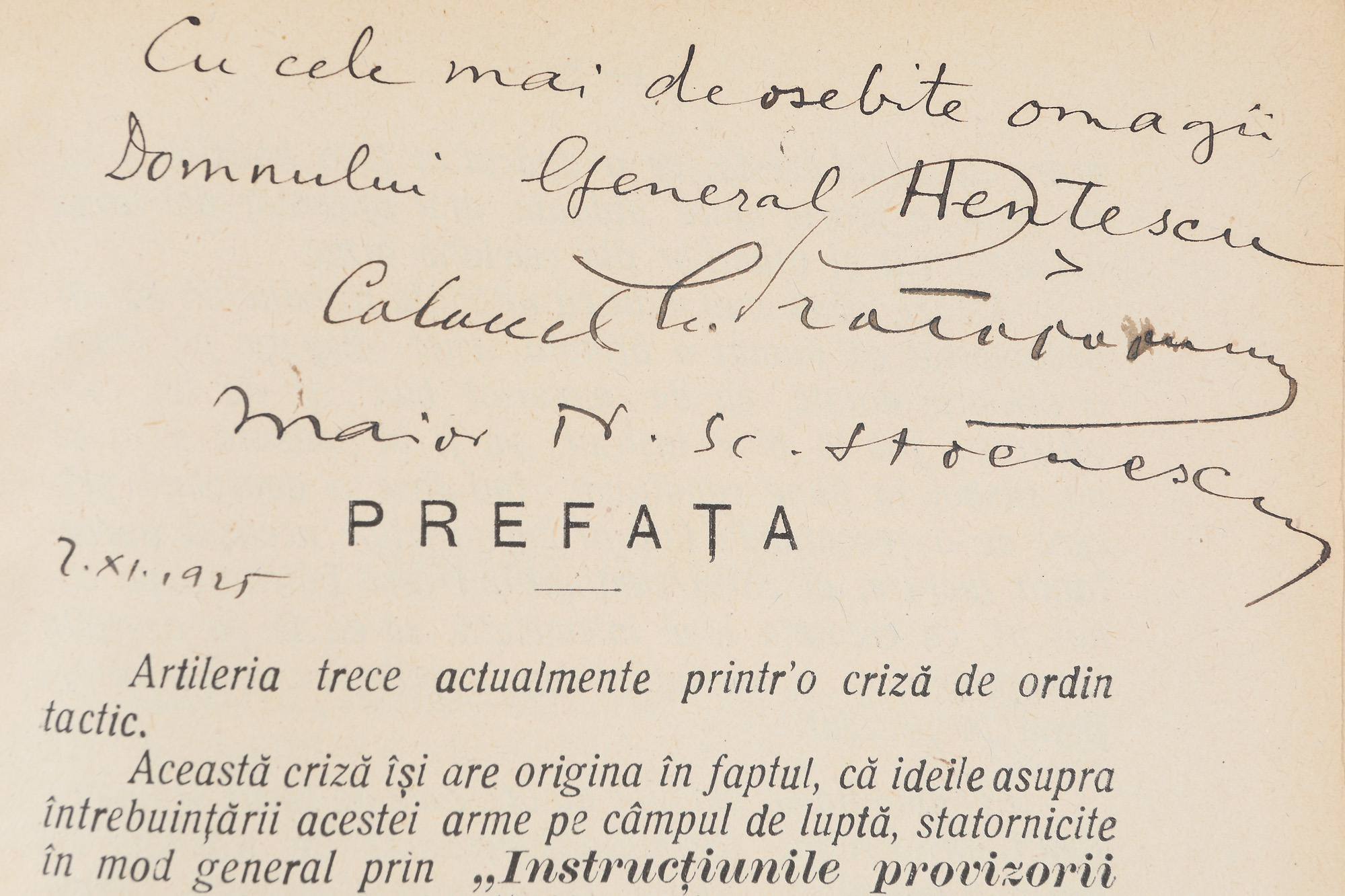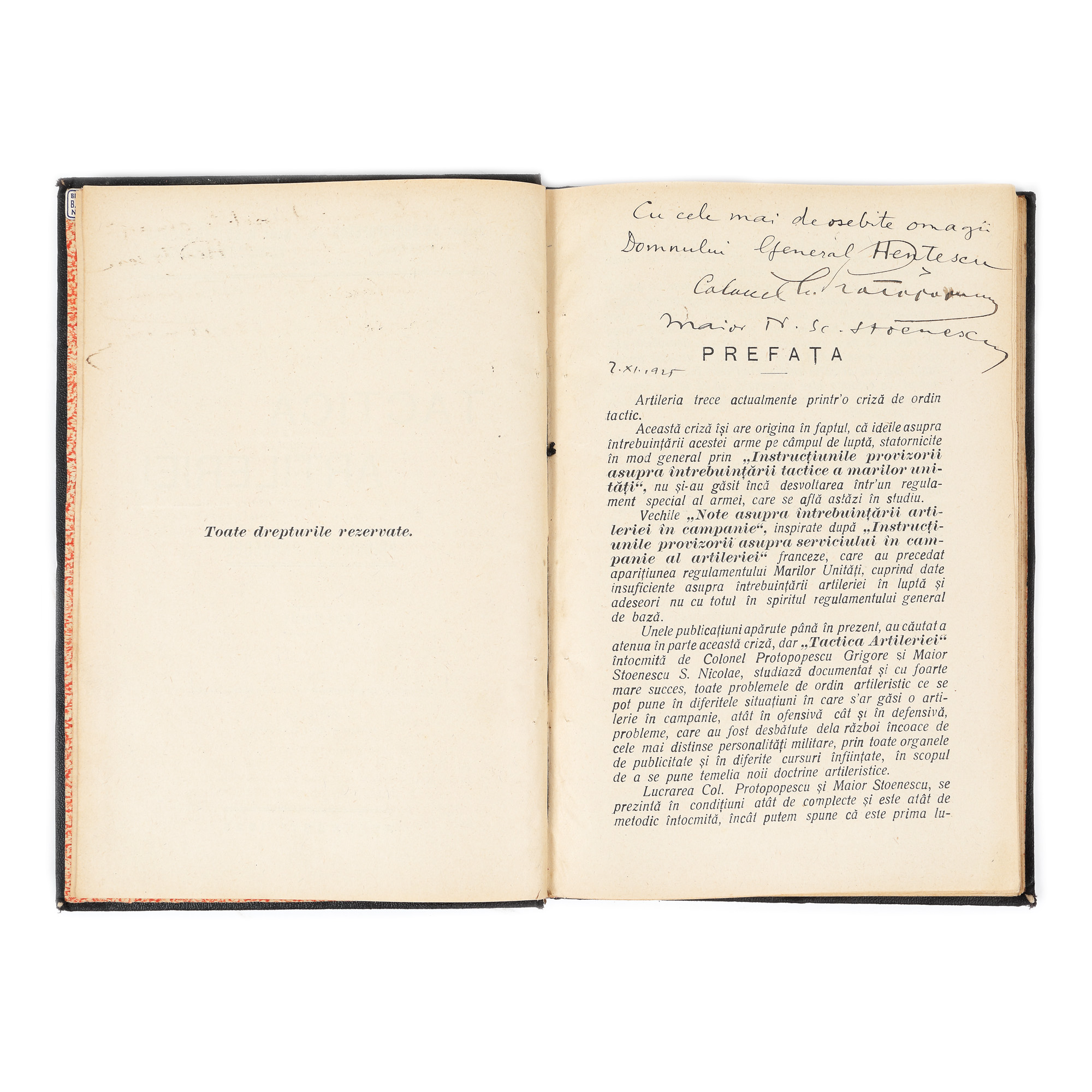 197. ”Tactica artileriei”, de col. Gheorghe Protopopescu și maior Nicolae Stoenescu, București, 1925, cu dedicația și semnătura olografă a autorilor către Generalul Hențescu