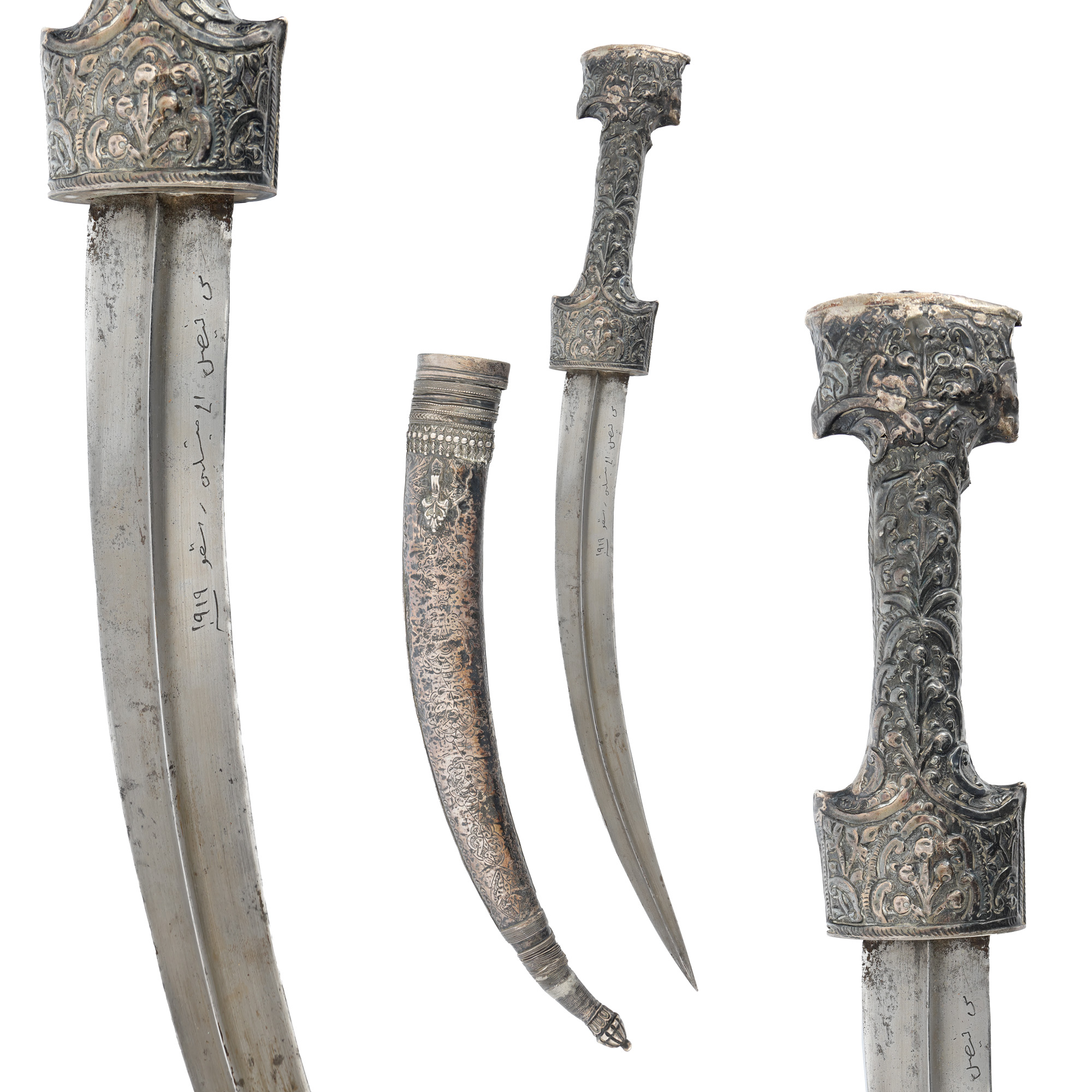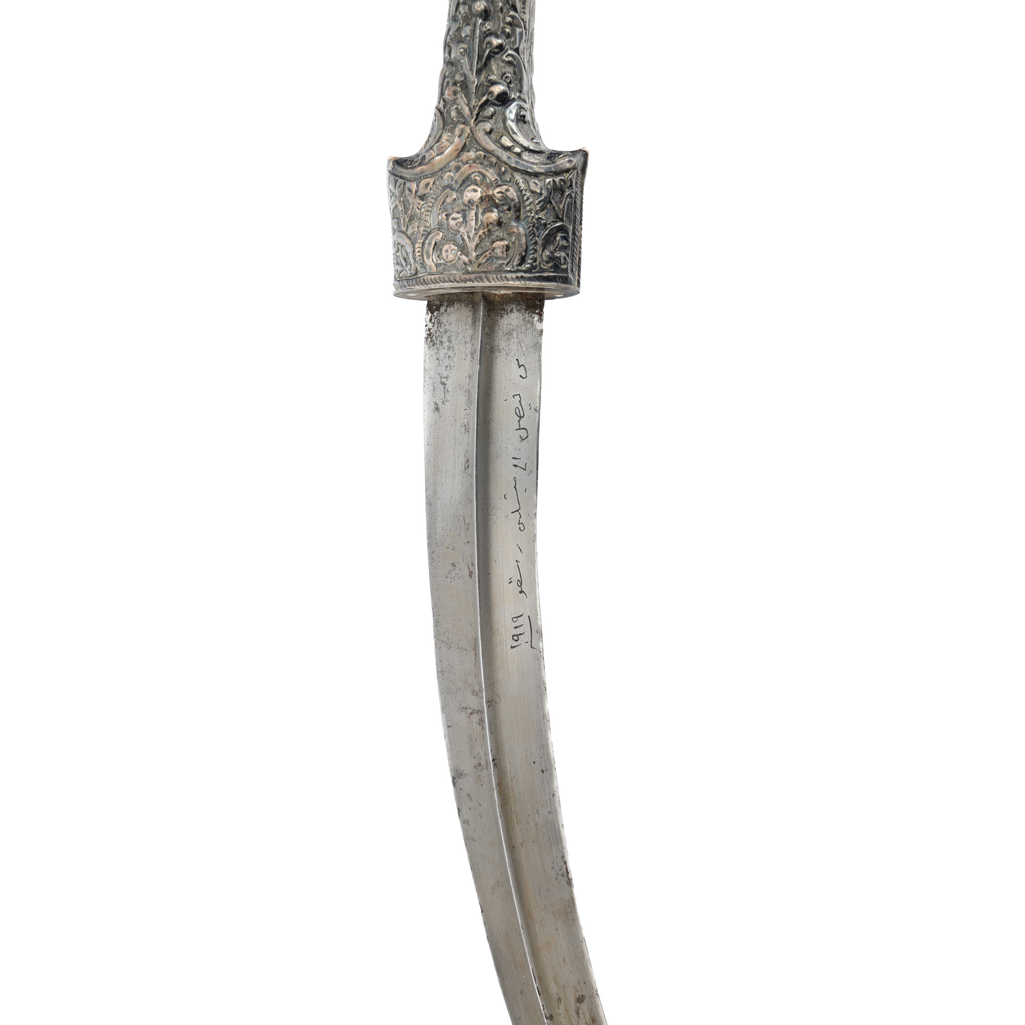 47. Pumnal Khanjar, cu teaca și mânerul din argint și lama gravată cu numele Faisal Al-Mislin și anul 1919