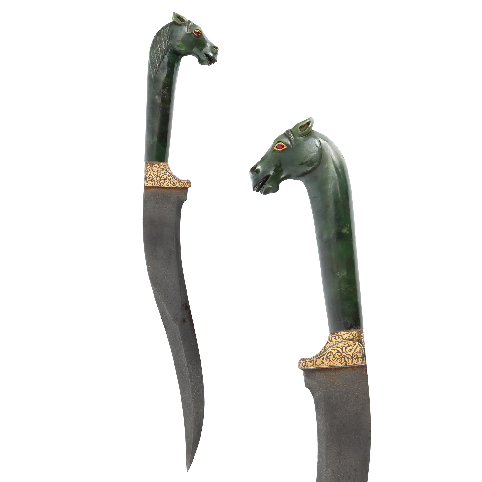 46. Pumnal Pesh-Kabz, indo-persan, cu mânerul din nefrit și lama din oțel Wootz, decorat cu aur, prima jumătate a sec. XX