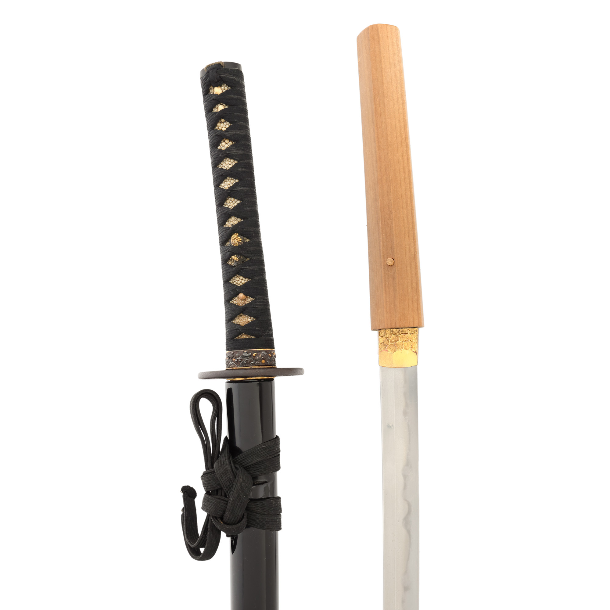 oțel tamahagane, piele de pisică de mare, alamă, lemn lăcuit