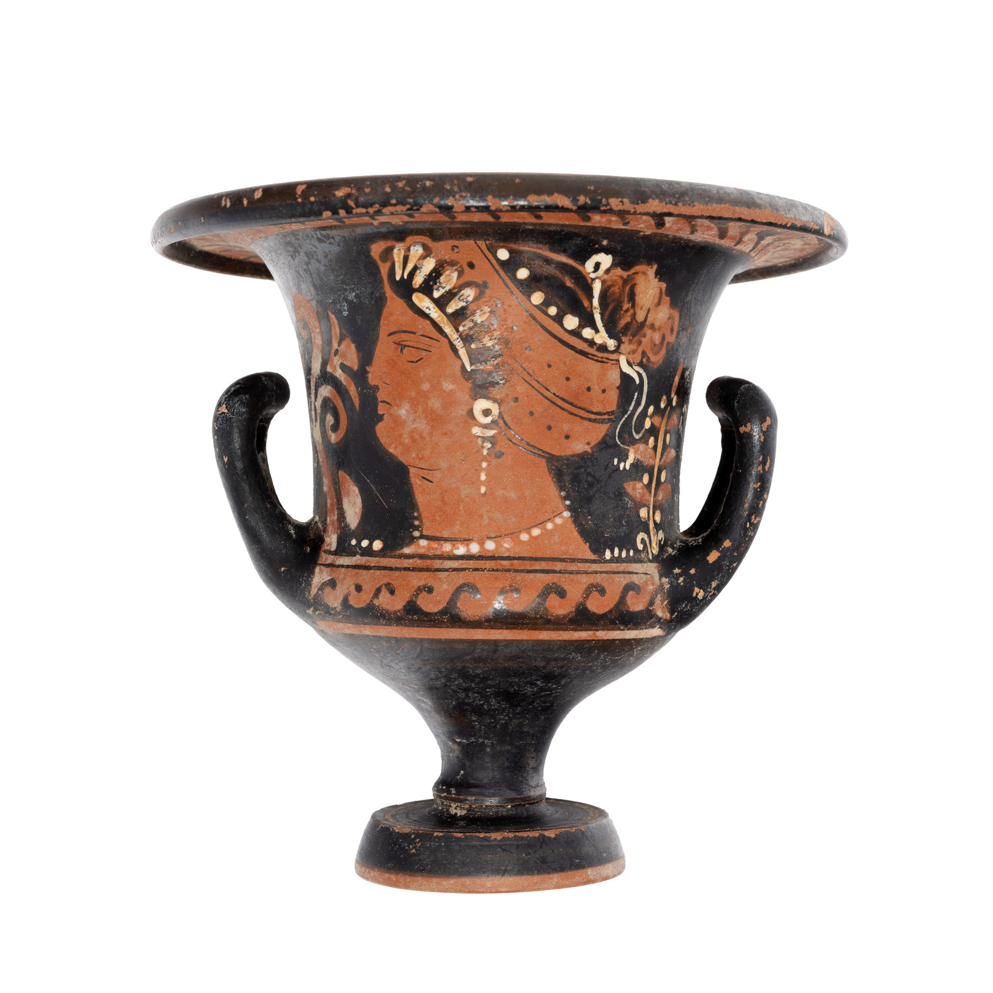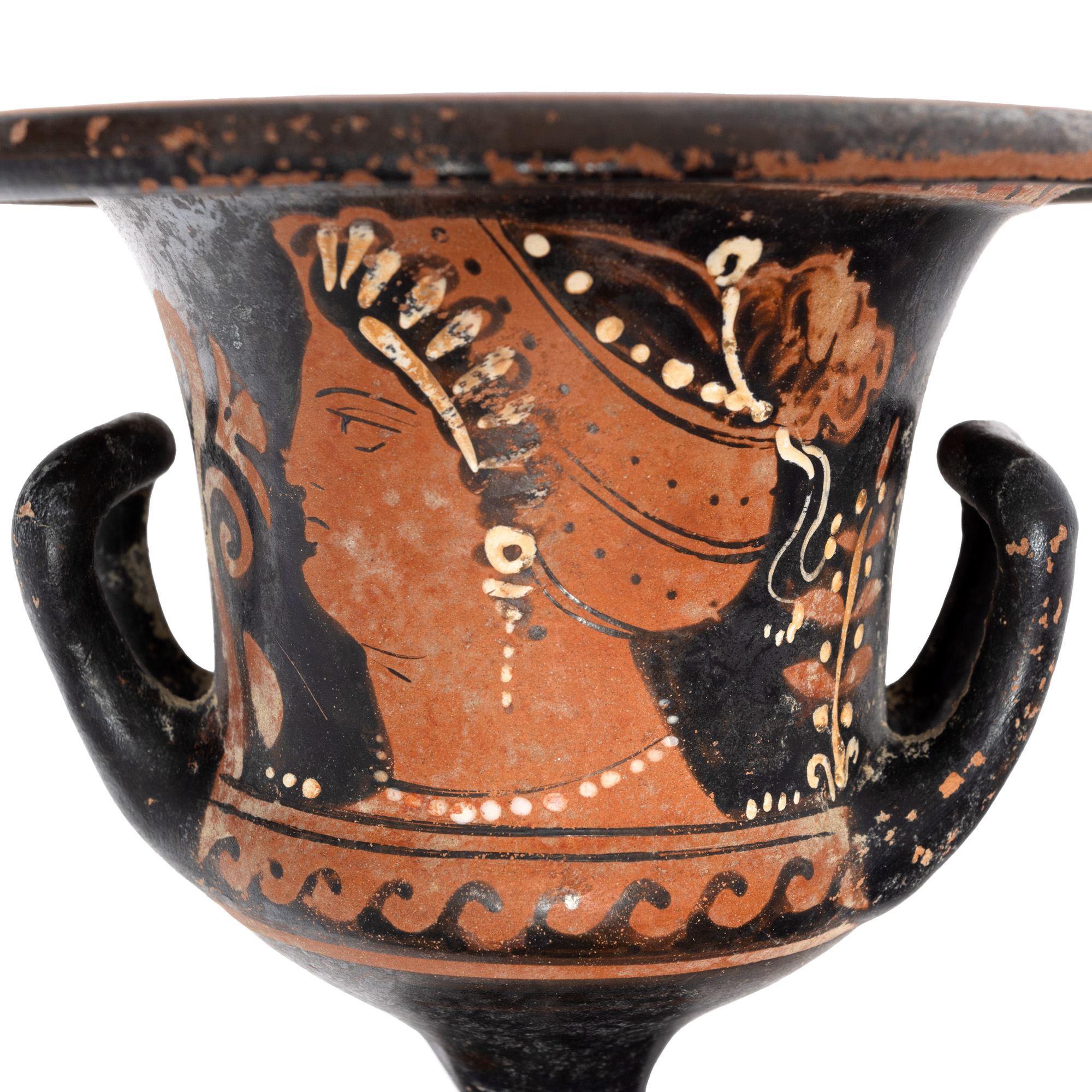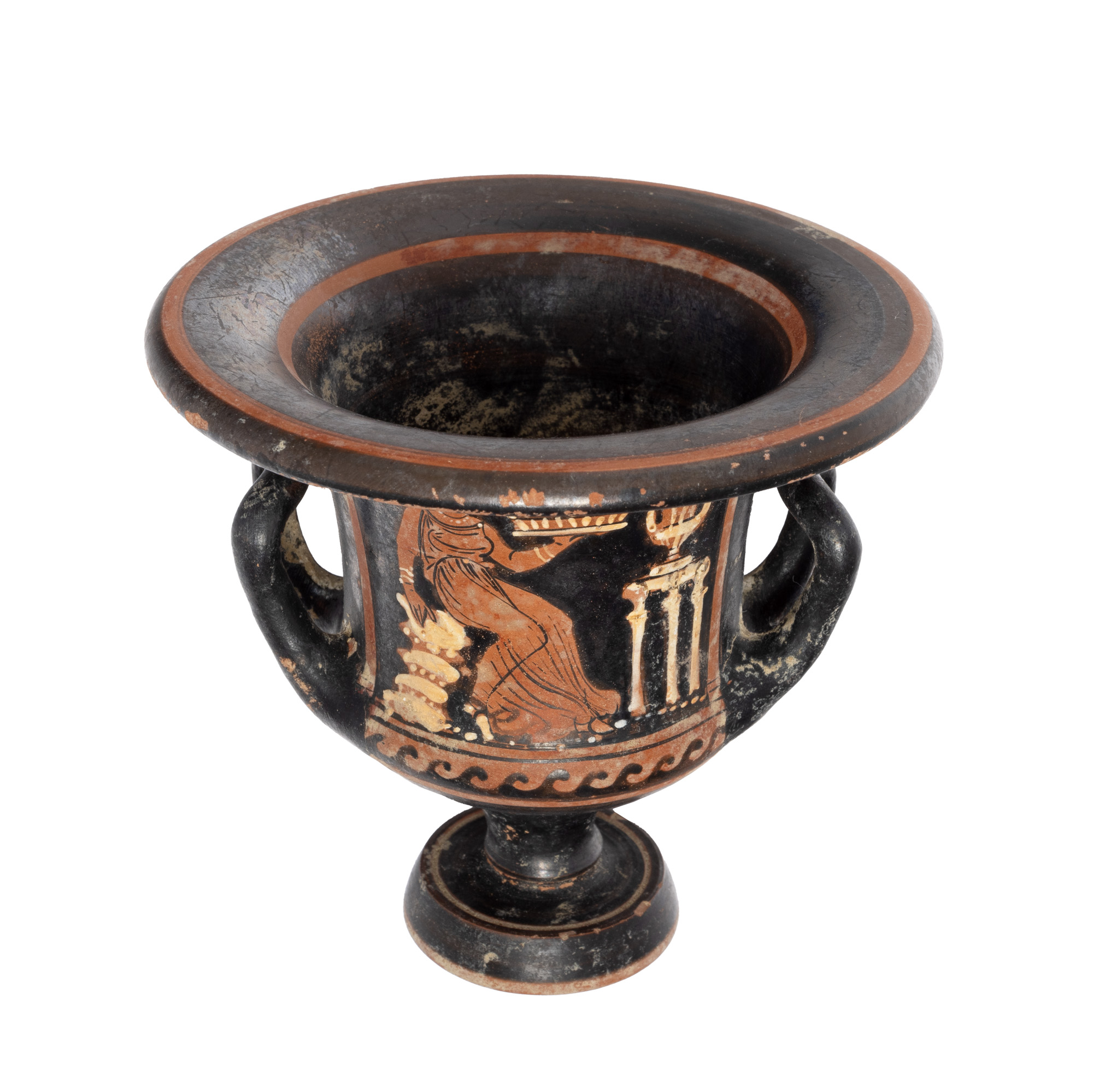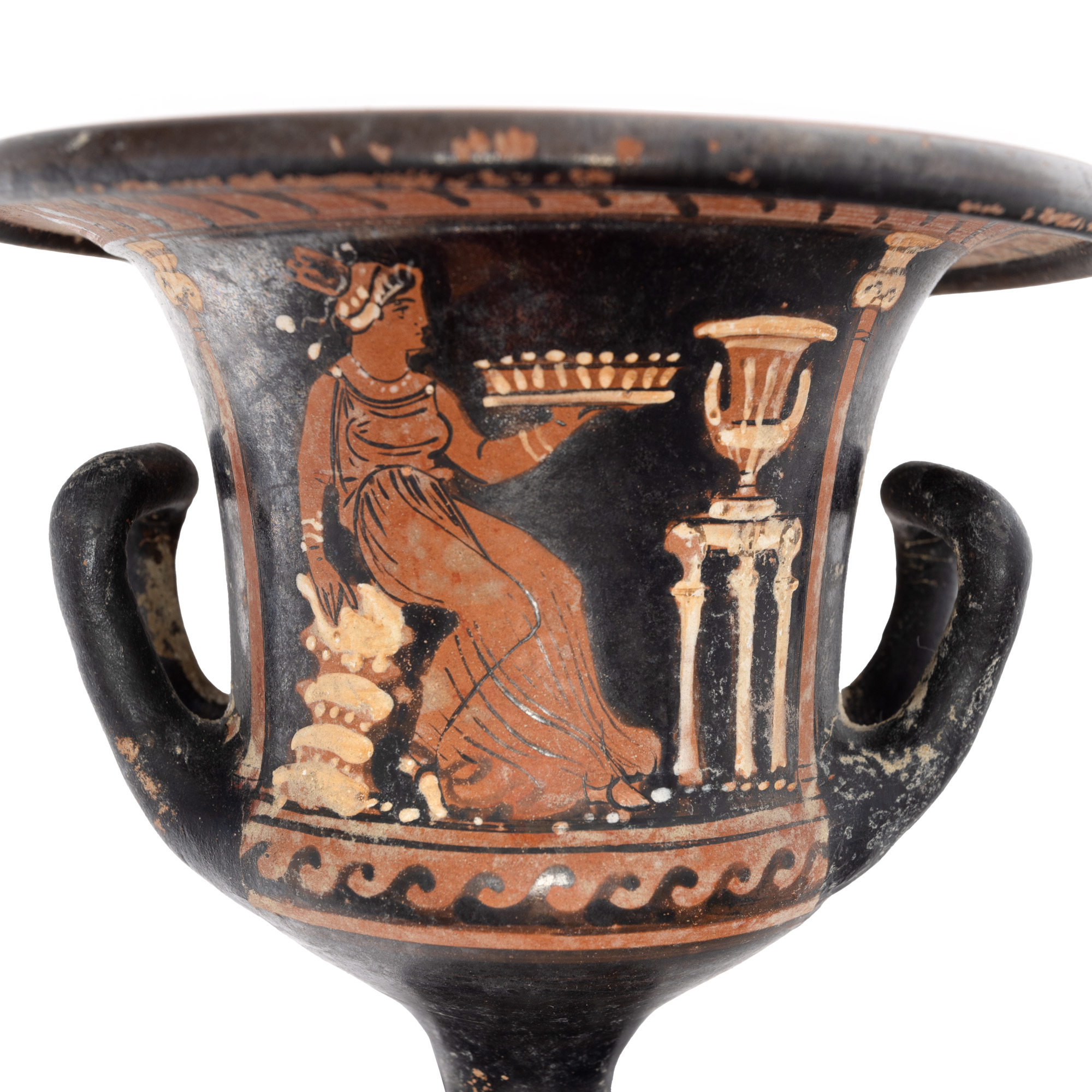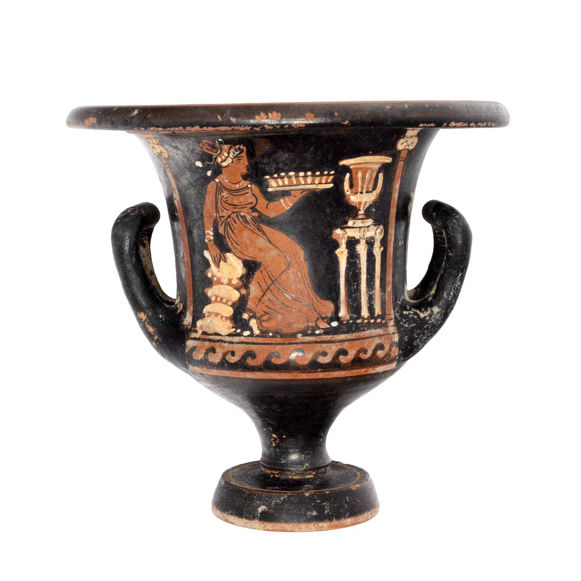73Т. Krater pictat în tehnica figurilor roșii, atribuit Pictorului din Malibou, Apulia, Sudul Italiei, 340-320 î.e.n.