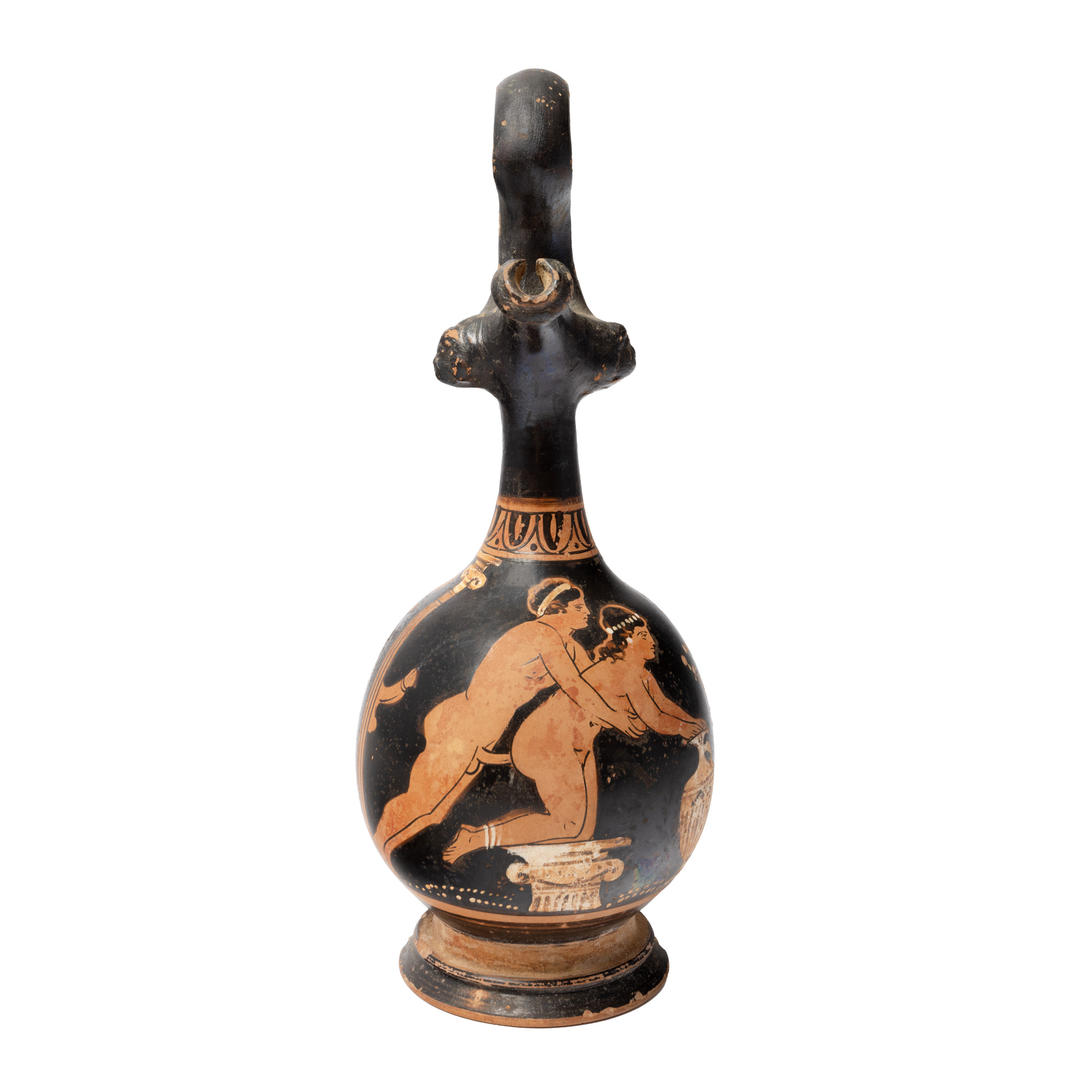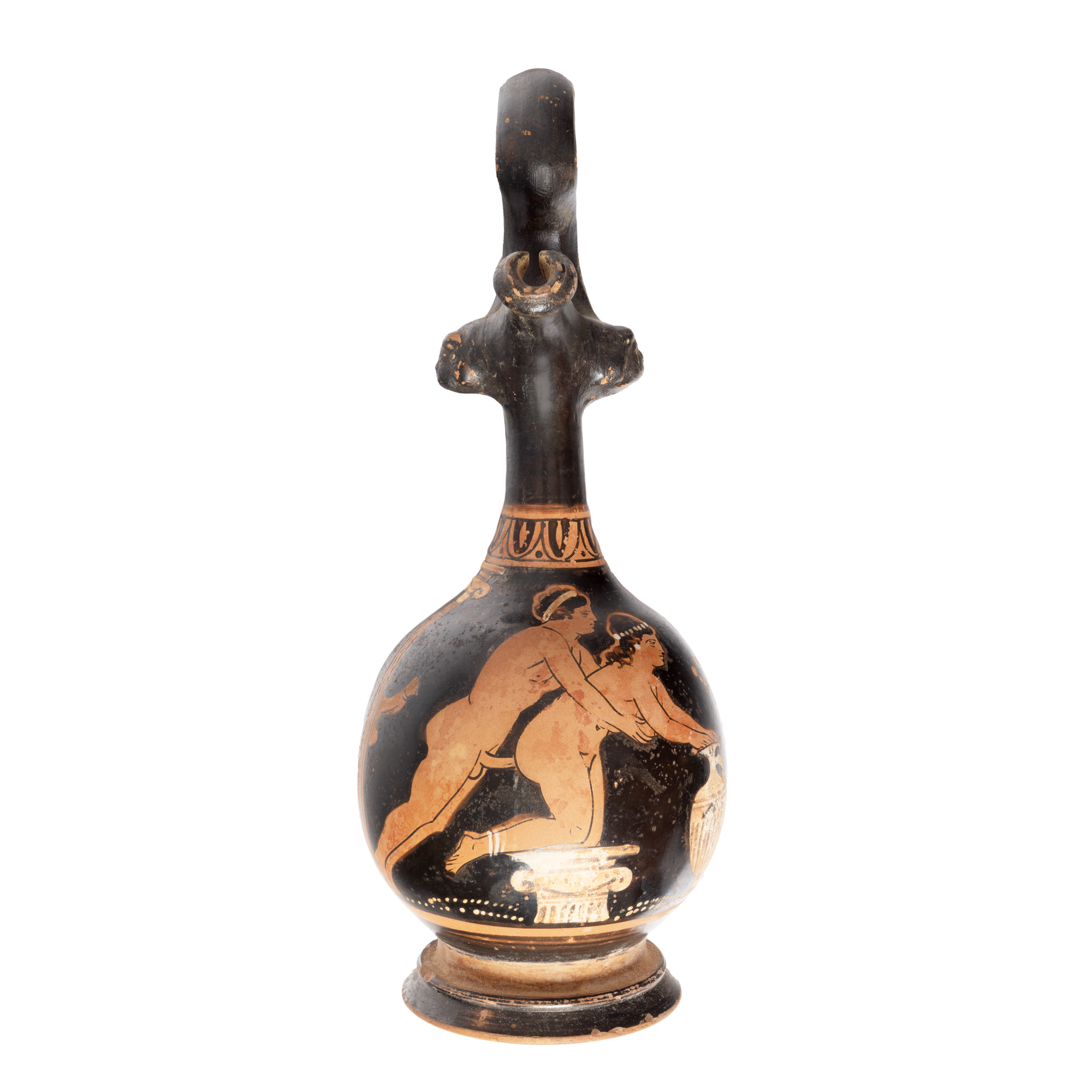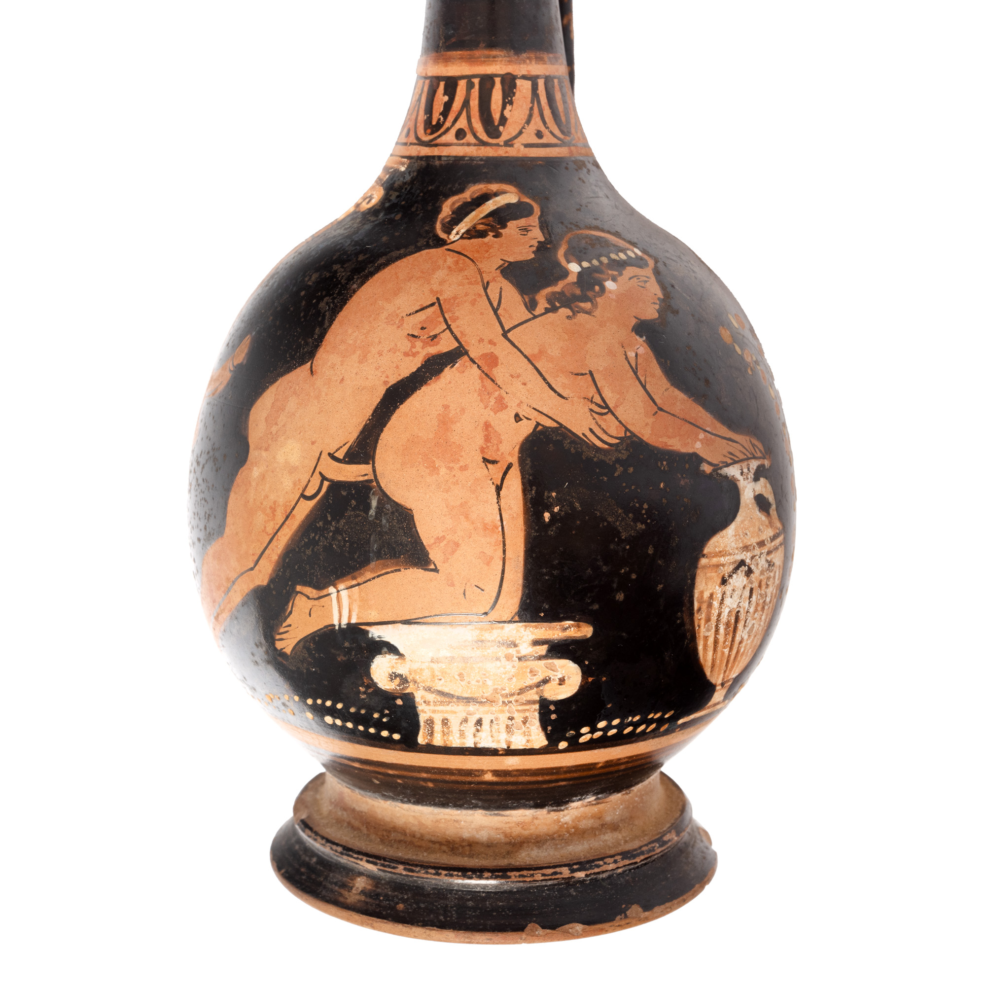 Oinochoe (epichysis) cu toarta supraînalţată, cu aplice laterale în relief la bază, pe buză. Corp globular, cu buza alungită şi gât cilindric subţire. Orificiul de scurgere prelungit și marginea cu guler. Vasul este decorat cu figuri roşii. Scena principală este în interiorul unei construcţii gen templu sau sanctuar, sugerat de coloanele cu capiteluri ionice. Doi tineri, bărbat şi femeie, sunt surprinşi goi, într-o scenă de amor. Femeia este cu genunchii sprijiniţi de un capitel şi cu mâinile pe o hidria poziţionată uşor înclinat. In spatele tânarului, după coloană apare un penis în erecţie. Tânărul poartă o panglică în jurul capului iar femeia o bijuterie ca un şirag de mărgele în păr, doua şiraguri paralele la gleznă şi cercei în urechi. Sub toartă, un aranjament de palmete. Scena este încadrată în partea de sus de o friză formată din semiove cu punct. Adaos de alb la coloane, hydria, bijuterii, plante.