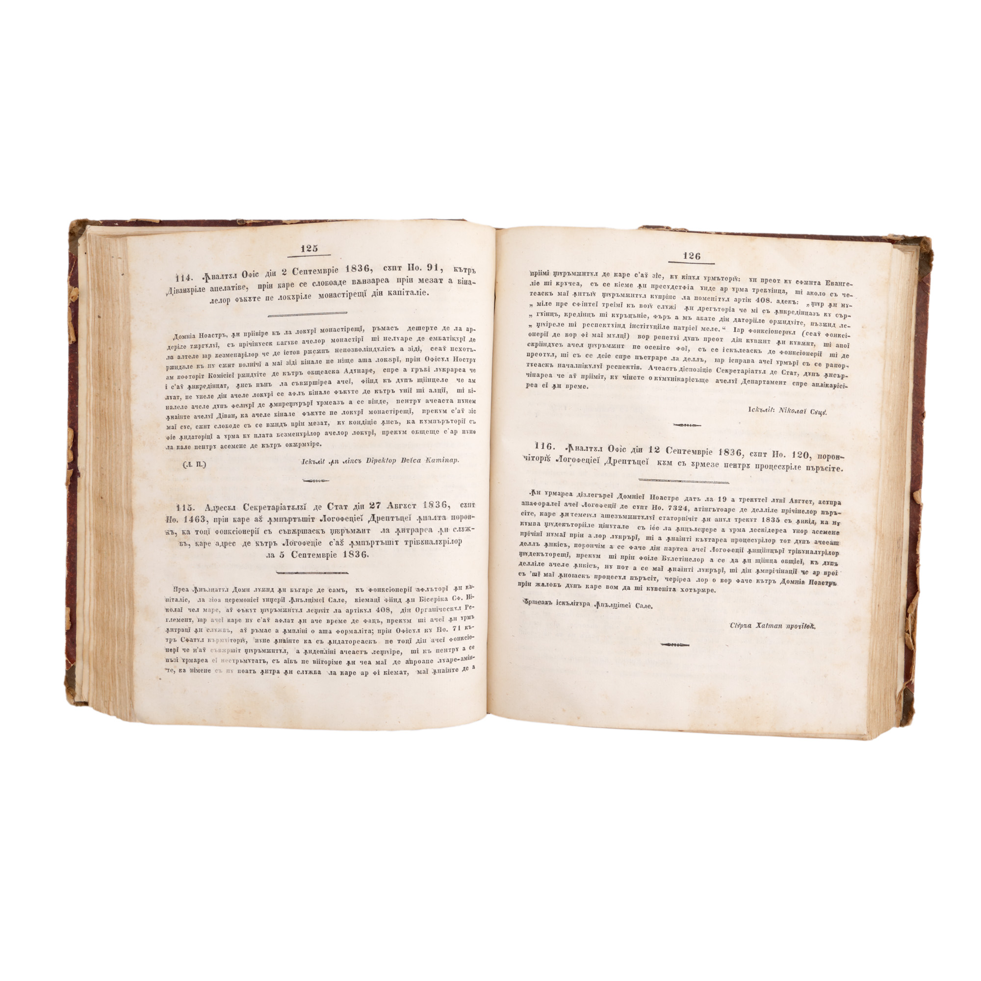 Volumul cuprinde actele de organizare și funcționare, precum și deciziile judecătorești adoptate și pronunțate în timpul domniei lui Mihail Grigorie Sturdza în Moldova. Legătura este de epocă. Coperțile sunt din carton iar cotorul este din piele. Prezintă urme ale trecerii timpului.