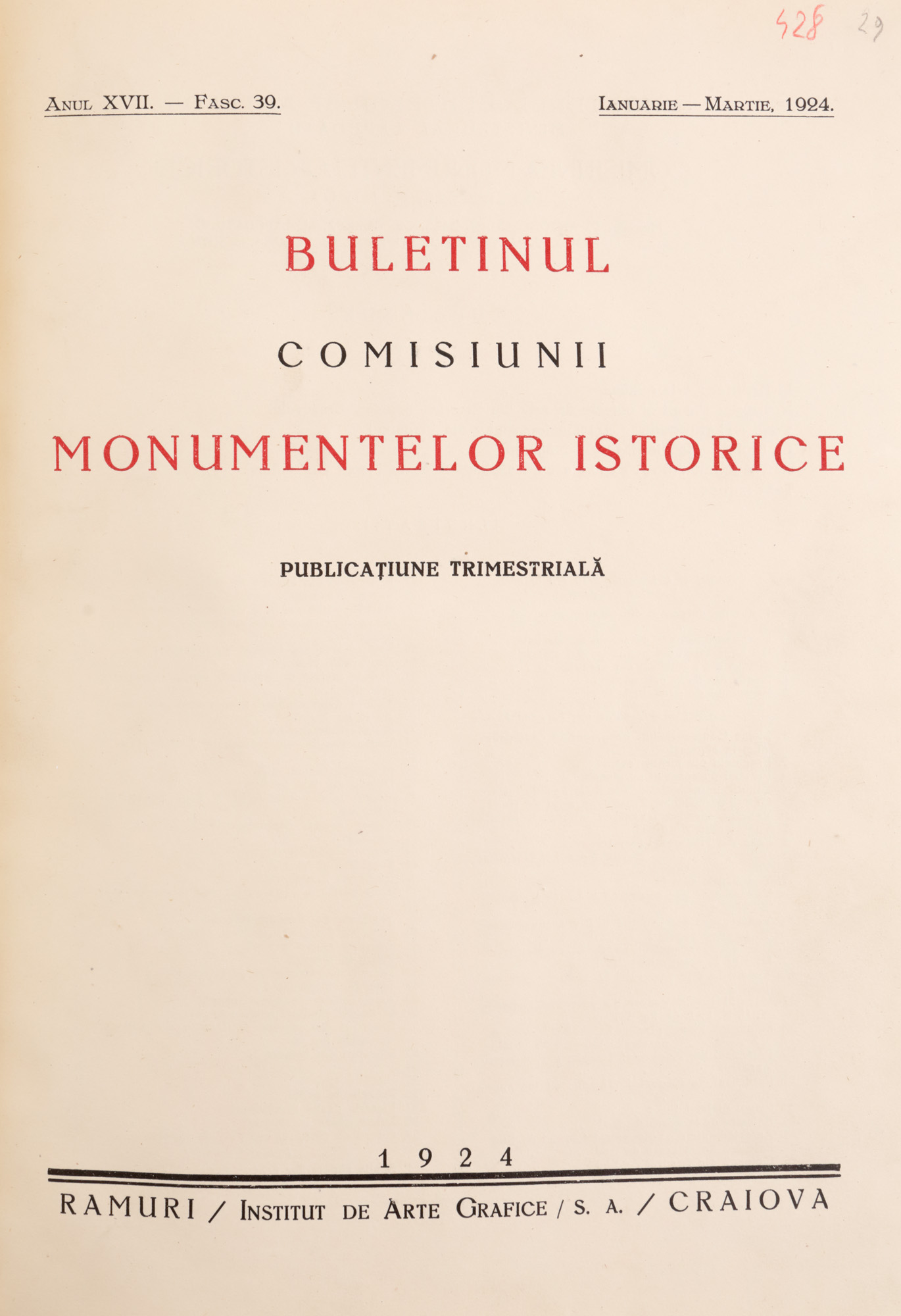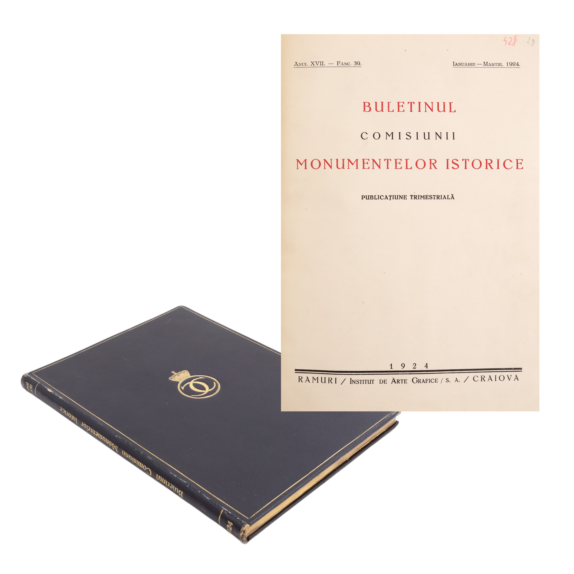 140. "Buletinul comisiunii monumentelor istorice", anul XVII, București, 1924, exemplar bibliofil, cu cifrul Regelui Carol II