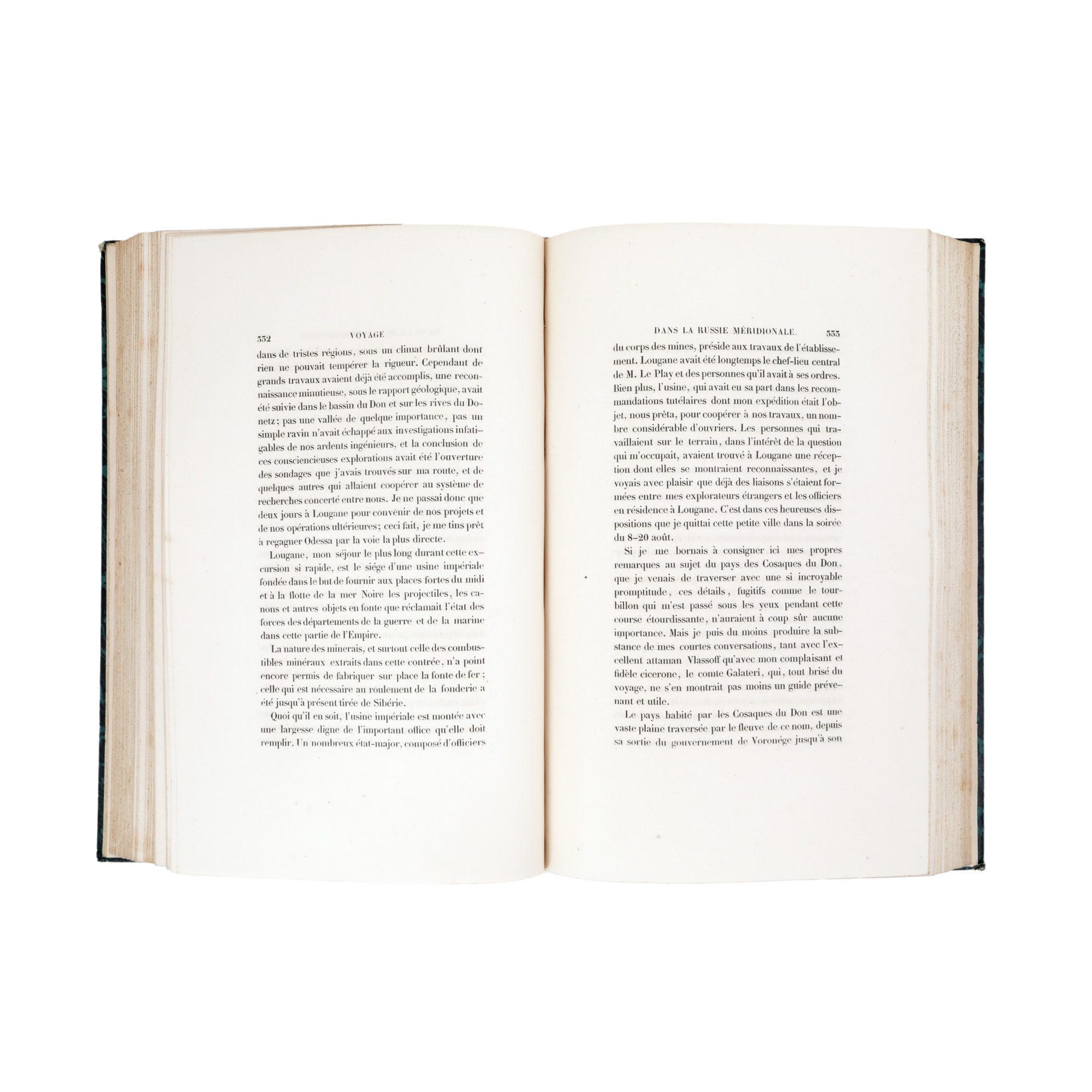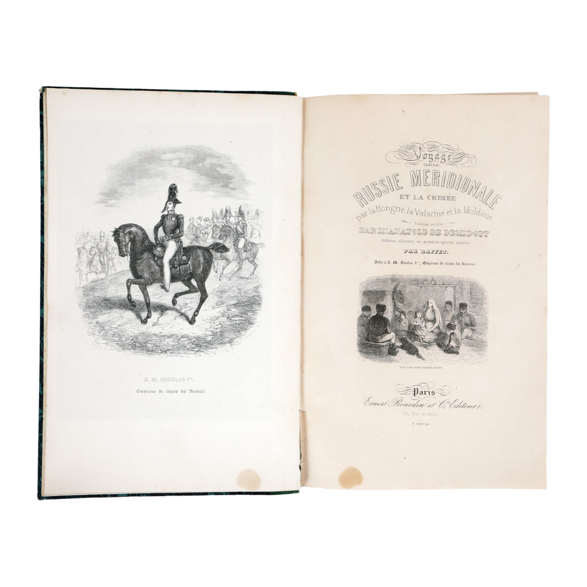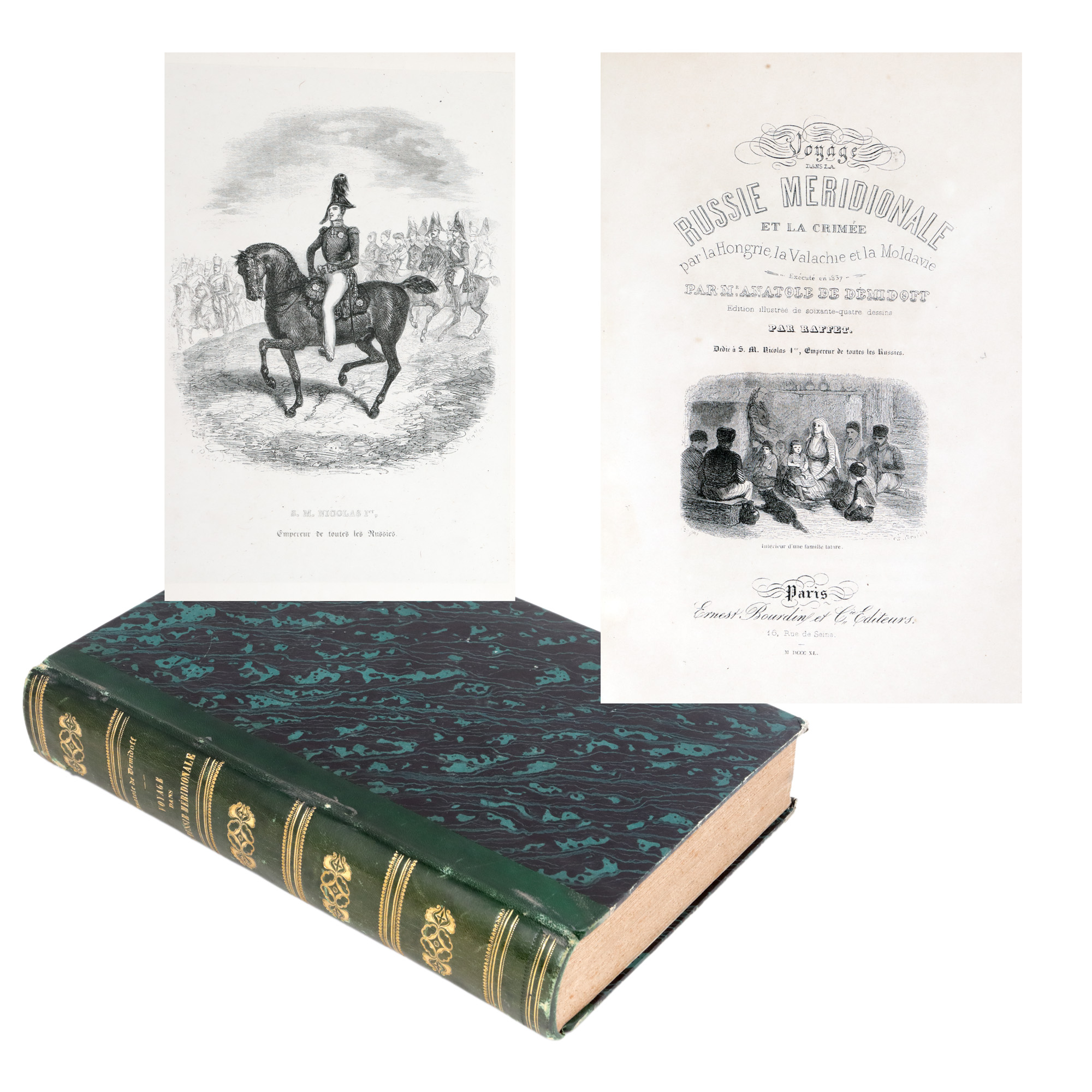 Anatole Demidoff (1813-1870) a fost un nobil rus cu o personalitate complexă, un veritabil intelectual și om de știință al epocii sale, diplomat și explorator. După o tinerețe petrecută la Paris alături de tatăl său, ambasador al Imperiului Rus în Franța, se întoarce în patrie unde se va dedica unei lungi cariere științifice, abandonând diplomația în care intrase datorită insistențelor familiei. Lucrarea descrie atât partea de sud a imperiului și Crimeea, teritorii cucerite de curând de armatele ruse și încă puțin cunoscute, cât și regiunea Principatelor Române, Muntenia și Moldova, care, deși sub suzeranitate otomană, intraseră și ele în sfera de interes a Rusiei care privea zona drept un culoar de trecere a armatelor sale către Constantinopol și Strâmtori. În expedițiile sale ștințifice Demidoff a fost însoțit de doi prieteni francezi, un scriitor și un pictor gravor, Jules Janin și Auguste Raffet, care l-au ajutat să redacteze și să ilustreze opera. Publicată prima dată la Paris în 1840, lucrarea s-a bucurat de un mare succes care a determinat republicarea ei în 1854. Paginile cuprind numeroase referiri la români, atât legate de starea generală ecomică, socială, politică a Principatelor, cât și cu privire la oameni și modul lor de viață. Cele 27 de splendide gravuri de Raffet sunt completate de numeroase vignete și iliustrații. Opera era dedicată împăratului Nicolae I al cărui portret se găsește la începutul lucrării, deși autorul s-a aflat în dizgrația suveranului. Exemplarul este legat într-o legătură de epocă. Coperțile sunt din carton, cu cotorul din piele împărțit în cinci registre.