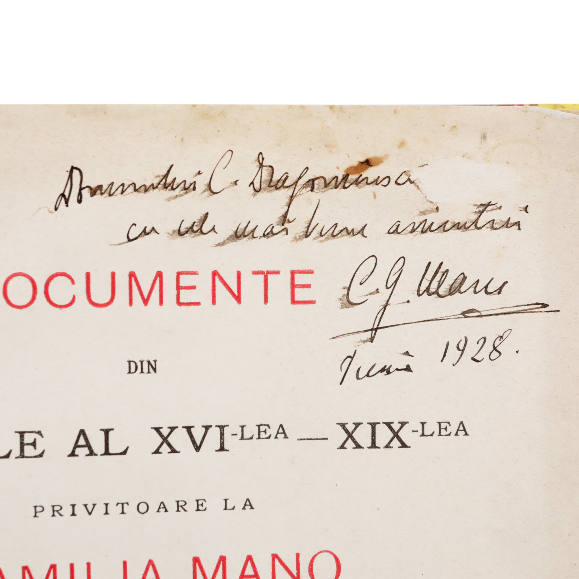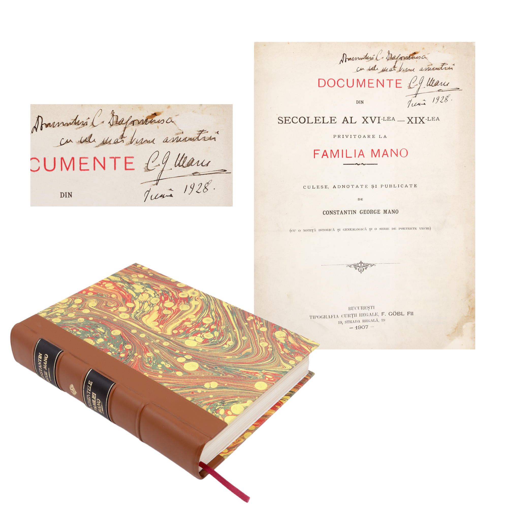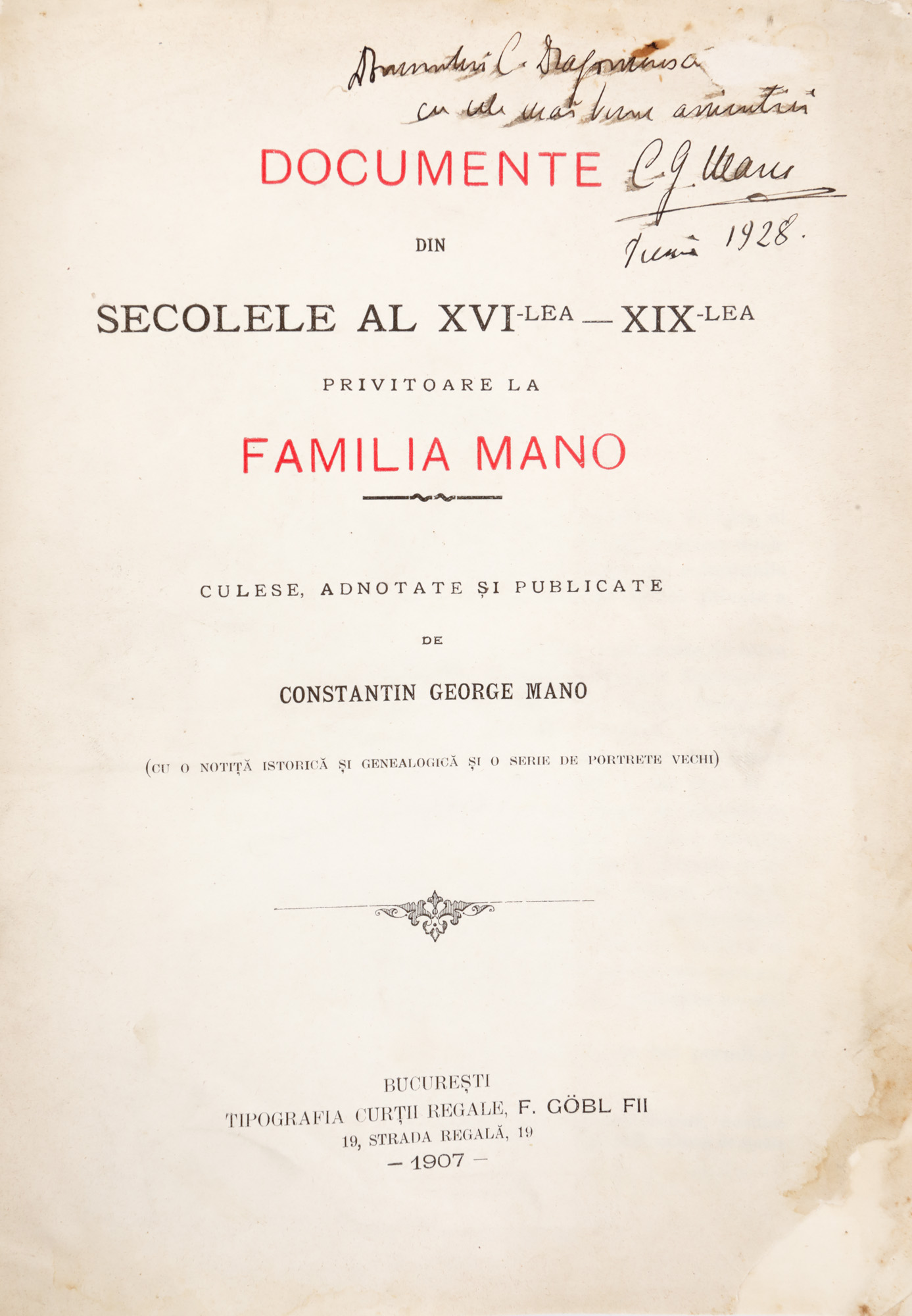 144. ”Documentele din secolele al XVI-lea - XIX-lea privitoare la familia Mano”, de Constantin George Mano, București, 1907, cu patru planșe, dedicația și semnătura olografă a autorului