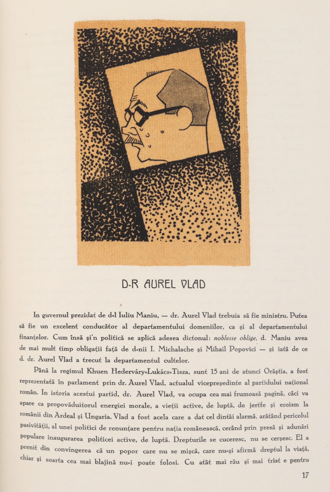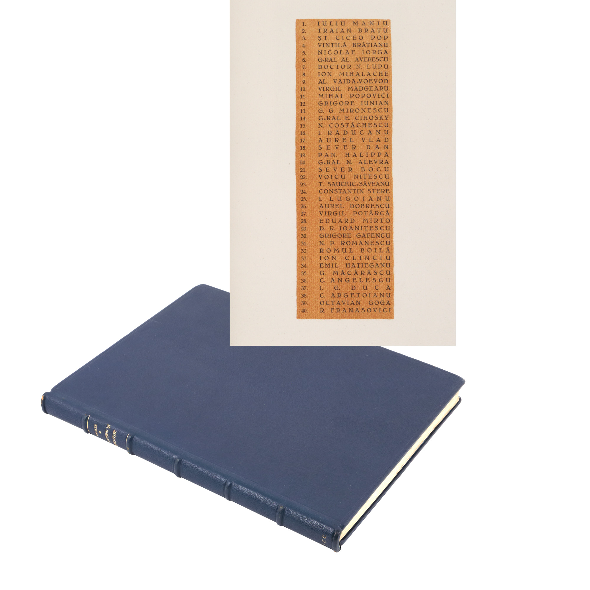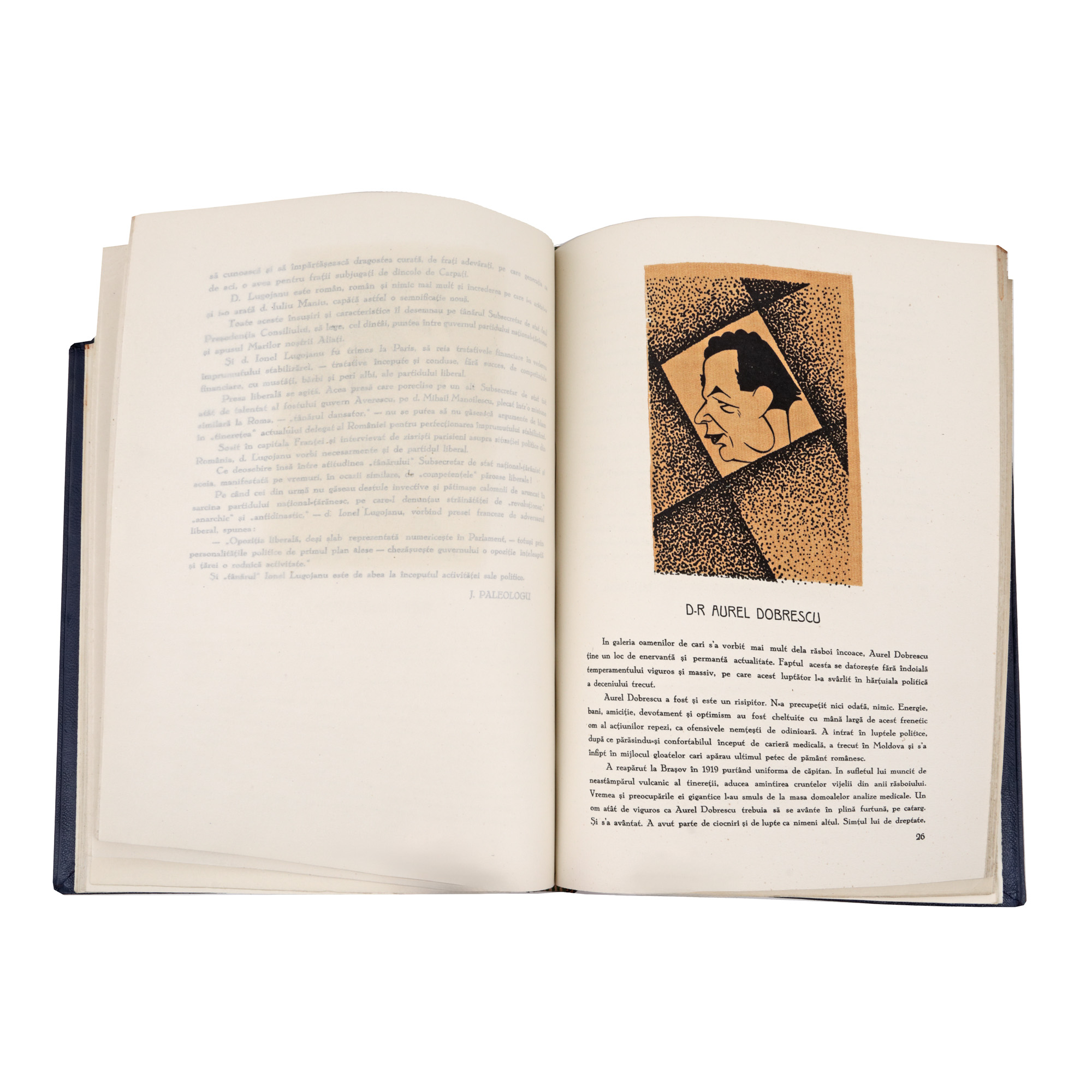 Caricaturistul Dralex (Nicolae Drăgulescu) publica în 1929 un album de lux care cuprinde caricaturile principalilor oameni politici ai momentului. Exemplarul este legat într-o elegantă legătură din piele, cu cotorul împărțit în șase registre.