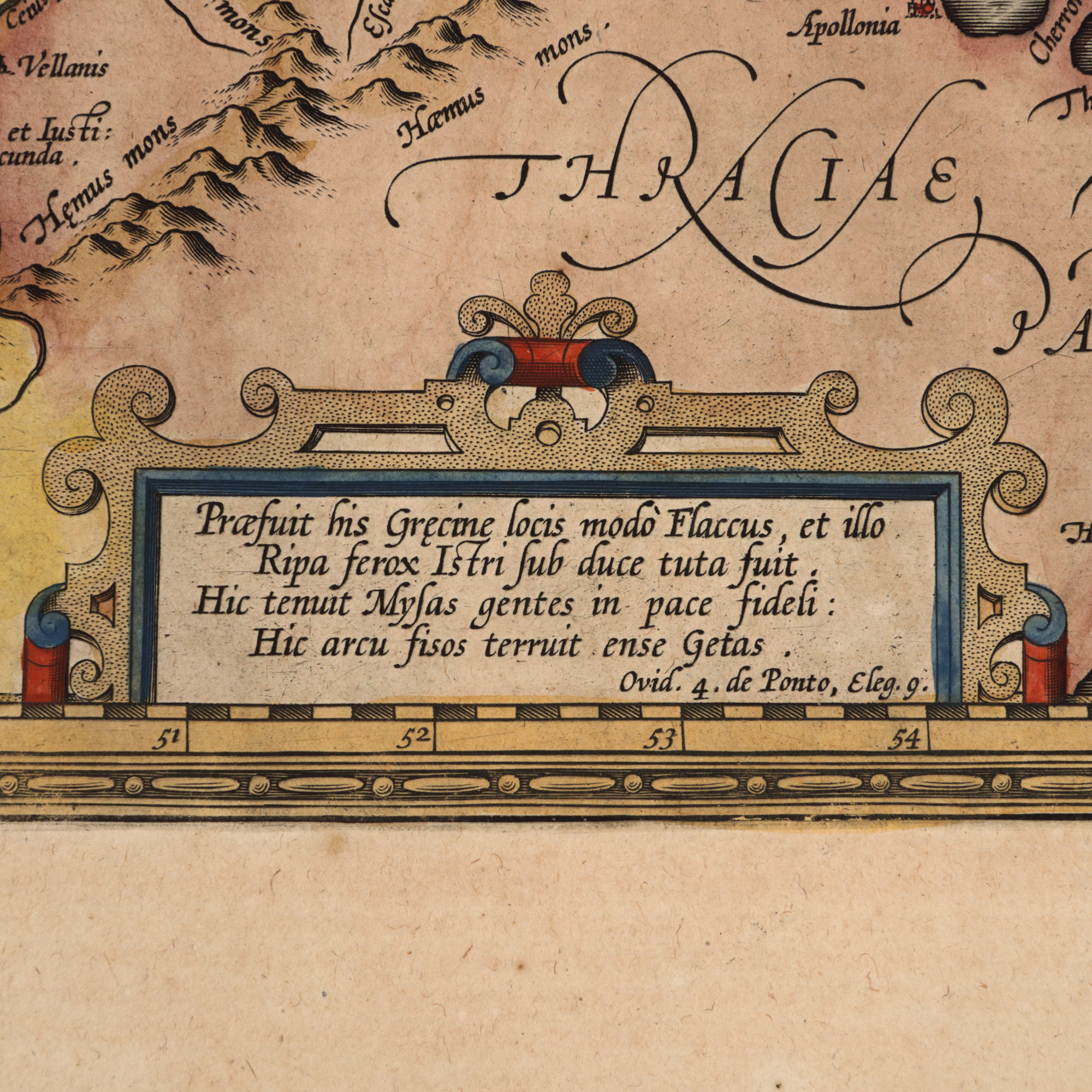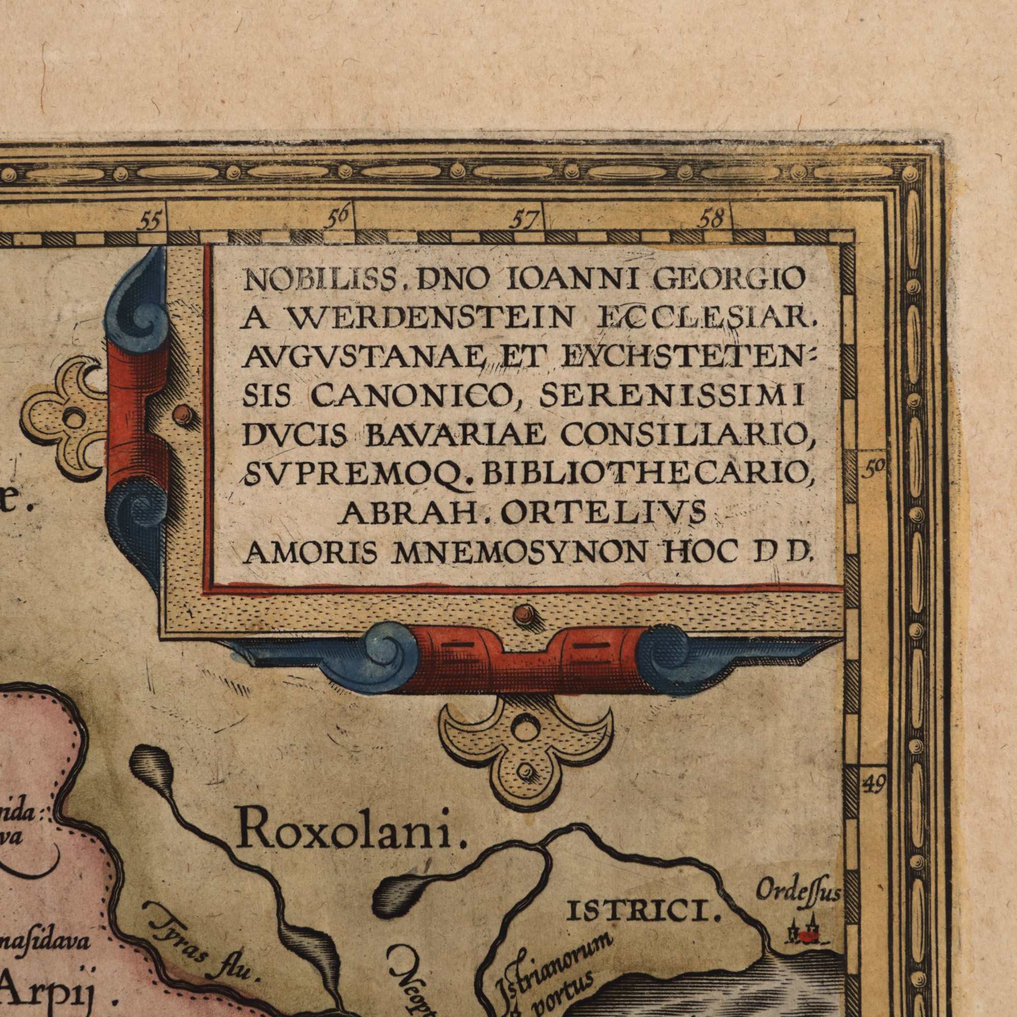 Celebrul cartograf, geograf și editor olandez Abraham Ortelius (1527-1598) este considerat fondatorul cartografiei moderne datorită în primul rând celebrei sale lucrări "Theatrum Orbis Terrarum" care a cunoscut până la sfârșitul secolului al XVIII-lea nu mai puțin de 34 de ediții. Piesa face parte dintr-o ediție imprimată la mijlocul secolului al XVIII-lea. Gravură pe cupru colorată manual după imprimare.