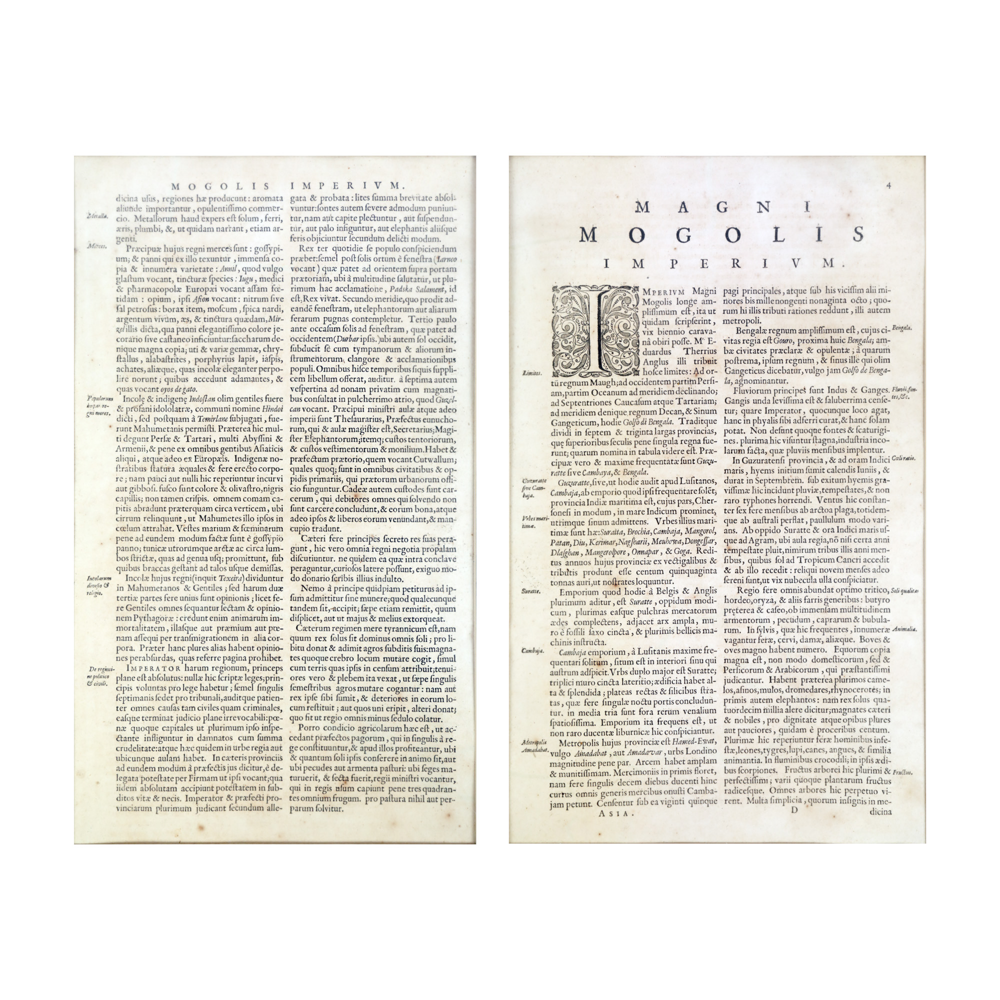 Harta este prima reprezentare, acceptată pe larg ca precisă a Indiei de Nord, acoperind de la Pakistan, Afganistan și Bangladesh, până la Himalaya și Tartaria. Poate fi considerată un testament al lucrării a aventurierului englez William Baffin, bazată pe informațiile furnizate de Sir Thomas Roe, primul ambasador al Angliei în Imperiul Mogul. Corectează inexactitățile de lungă durată prevalente în hărțile anterioare, oferind o reprezentare revoluționară a geografiei regiunii. Notabil, poziționează corect intrarea râului Indus în Marea Arabiei și îmbunătățește portretizarea râului Gange, arătând un nivel de precizie planimetrică fără precedent pentru vremea sa. Pe lângă meritele sale cartografice și artistice, "Magni Mogolis Imperium" se distinge prin reprezentarea detaliată a orașelor legendare situate de-a lungul marilor rute comerciale. Această hartă nu numai că descrie cu precizie râurile Gange și Indus, dar și marchează cu acuratețe orașe istorice precum Katmandu, Kabul, Agra, Delhi și Lahore, puncte esențiale pe drumurile comerțului și schimbului cultural. Fiecare oraș este reprezentat cu un grad de detalii care nu doar că evidențiază importanța sa în cadrul imperiului, dar și rolul său în rețeaua vastă a comerțului global din acea eră. Prin capturarea acestor noduri vitale, "Magni Mogolis Imperium" servește drept o fereastră în trecutul vibrant al comerțului și interacțiunilor culturale, amplificând și mai mult valoarea sa unică și atractivitatea pentru colecționari.