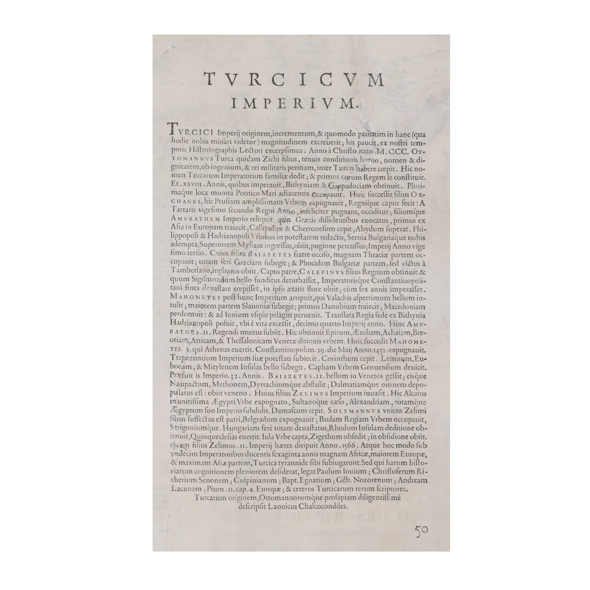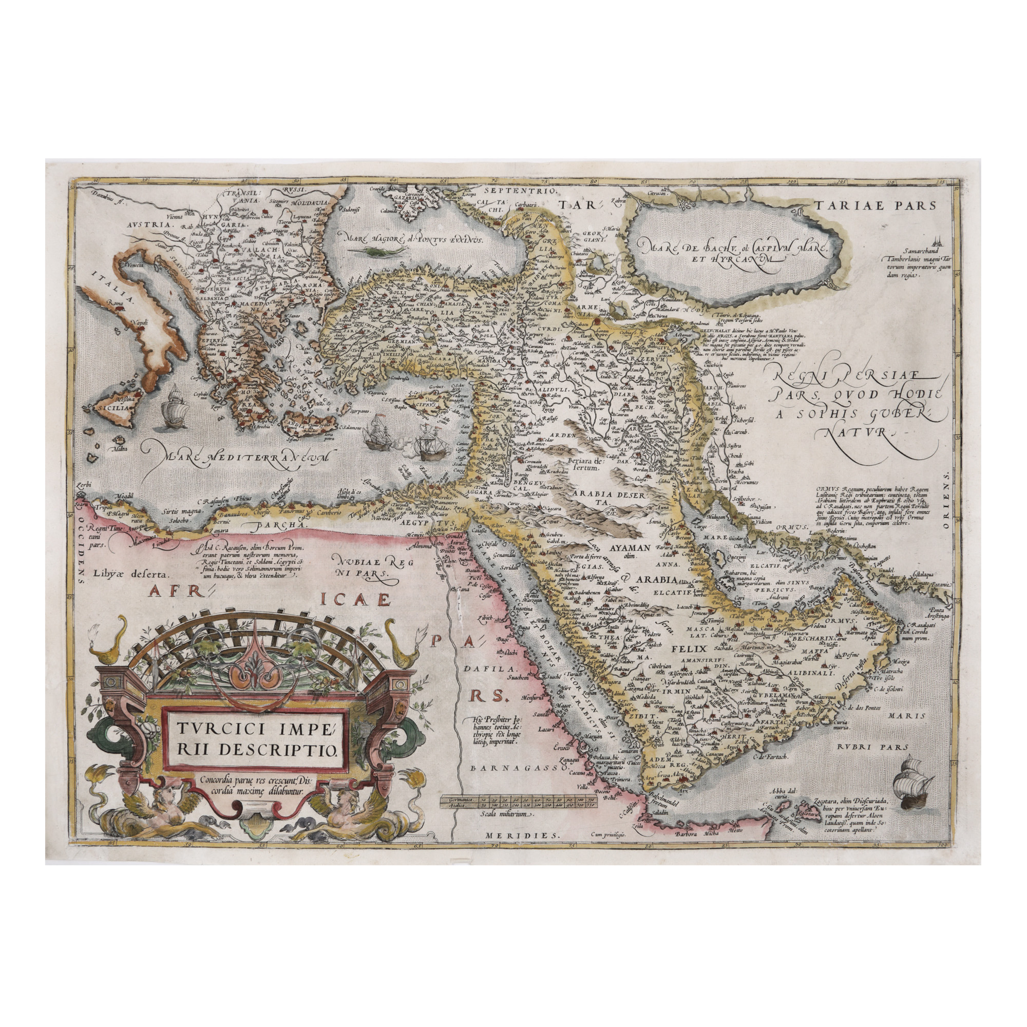 Cartograful și editorul olandez Abraham Ortelius (1527-1598) includea în celebra sa lucrare "Theatrum Orbis Terrarum" această hartă a Imperiului Otoman. În partea dreaptă jos se află un foarte bogat cartuș sub forma unei pupe a unui vas, susținută de figuri mitologice, și care cuprinde titlul hărții.