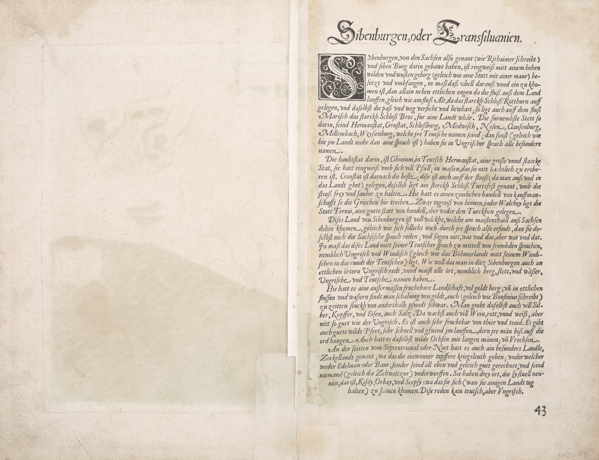 Hartă a Transilvaniei, întocmită de cărturarul, geograful și editorul maghiar Johannes Sambucus (Janos Zsamboky, 1531-1584) după cea a lui Honterus, publicată la Basel în anul 1532. Piesa face parte din prima ediție pe care geograful a tipărit-o la Viena în anul 1566. Ea se evidențiază prin legenda tipărită în partea dreptă, alcătuită din cinci rânduri. Edițiile mai târzii au avut această legendă formată din patru rânduri. Gravură pe cupru colorată manual după imprimare.