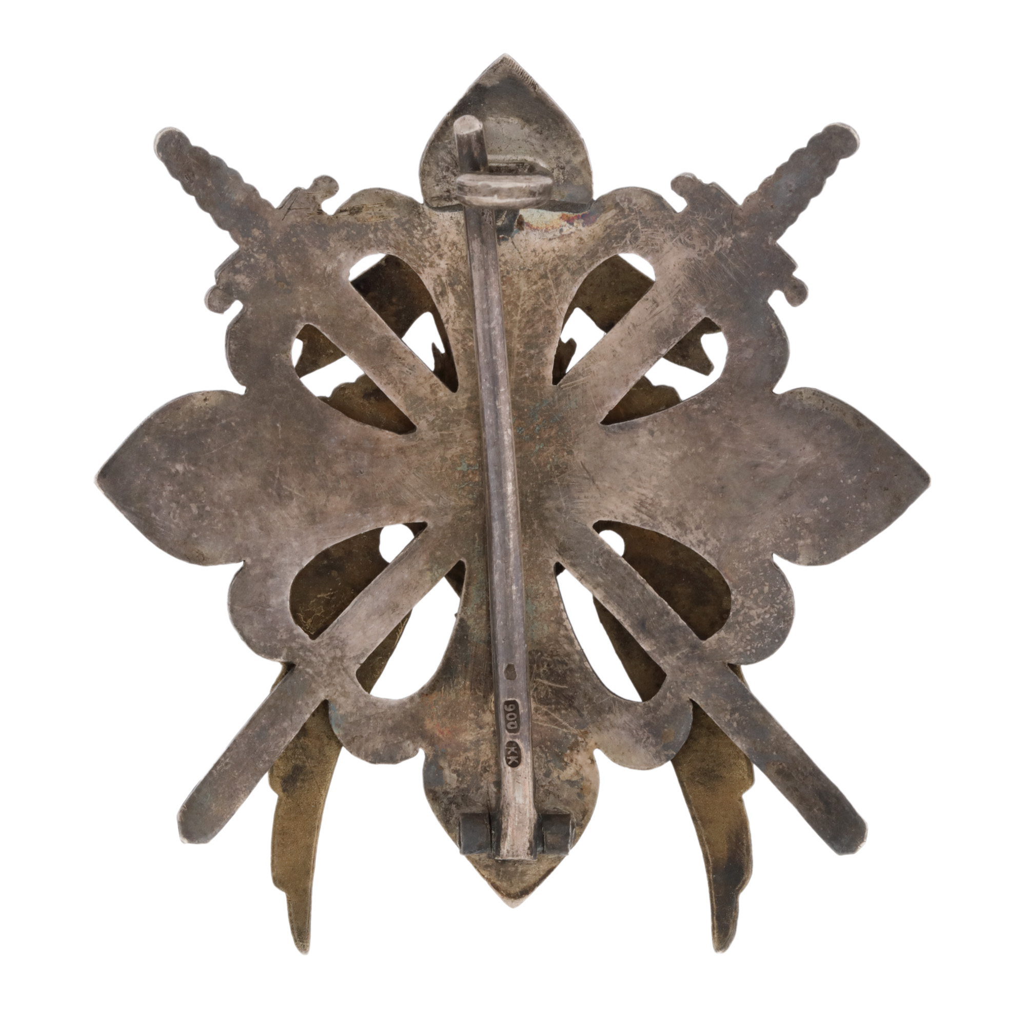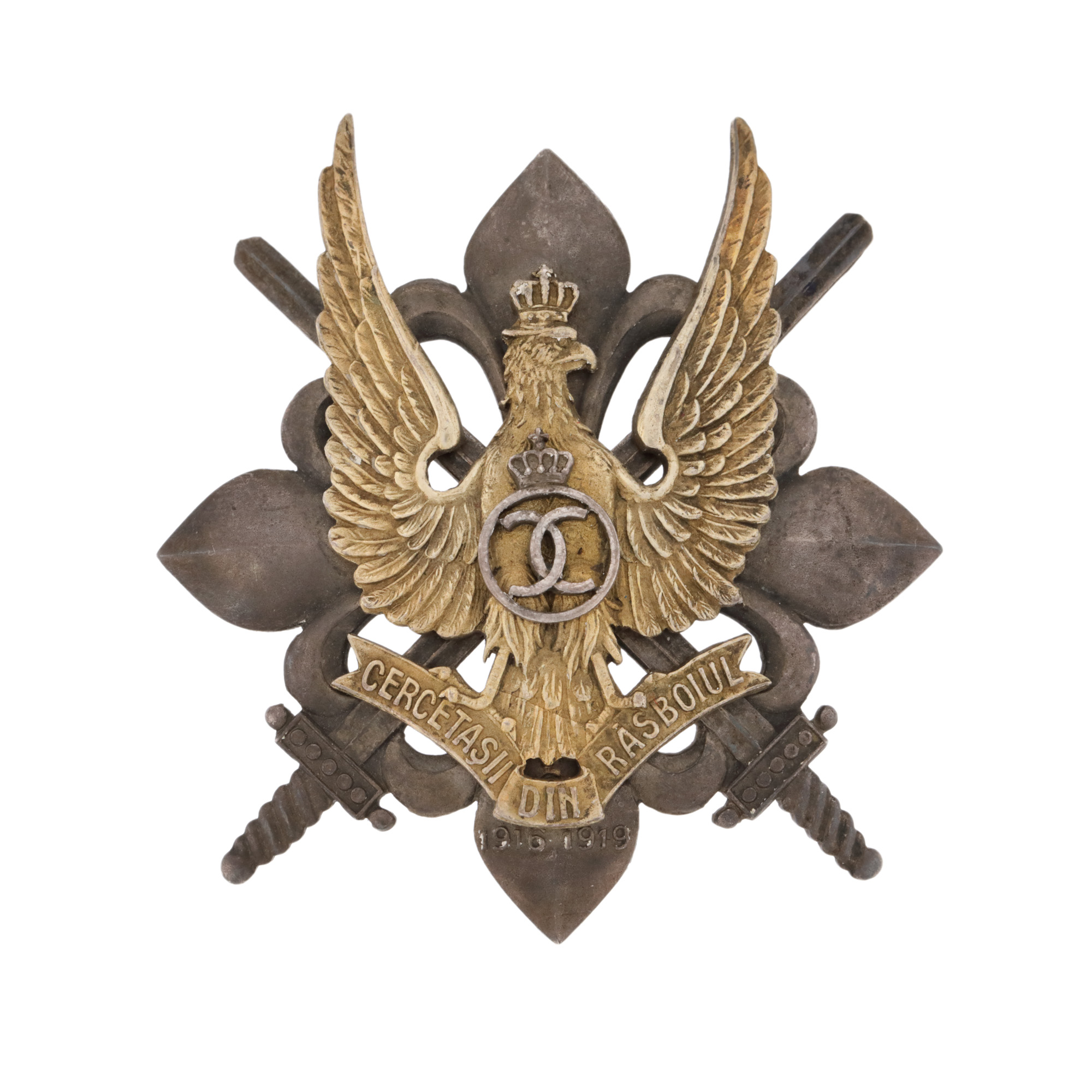 63. Insigna Cercetașilor României din Războiul de Întregire a Neamului 1916-1919, model Carol II, argint, manufactura Karnet-Kyselý, Praga, perioada interbelică