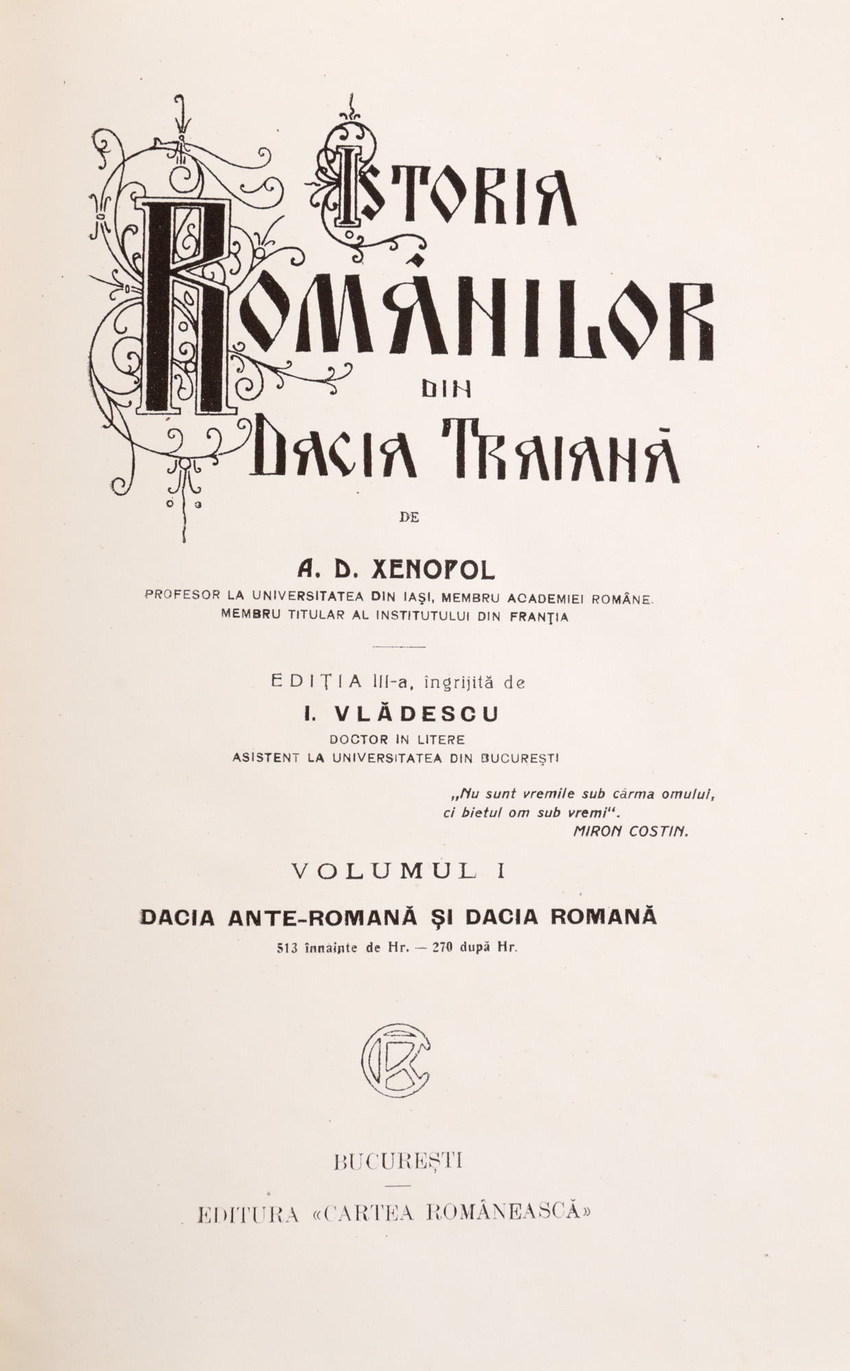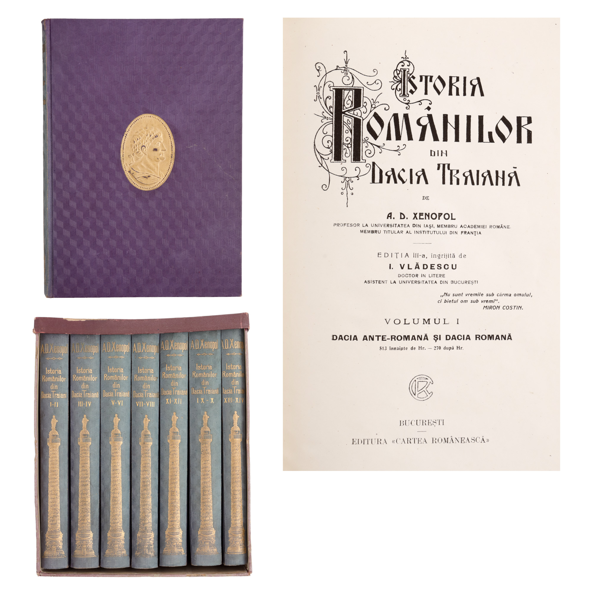 124. "Istoria românilor", de A.D. Xenopol, 14 volume colegate în șapte tomuri, București, 1925-1930, ediție bibliofilă, cu etuiul original