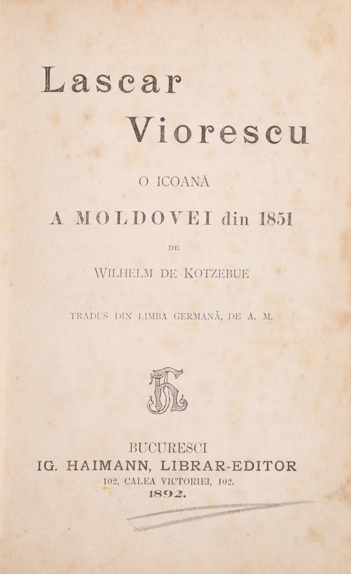 130. "Lascăr Viorescu - O Icoană a Moldovei din 1851", de Wilhelm de Kotzebue, București, 1892
