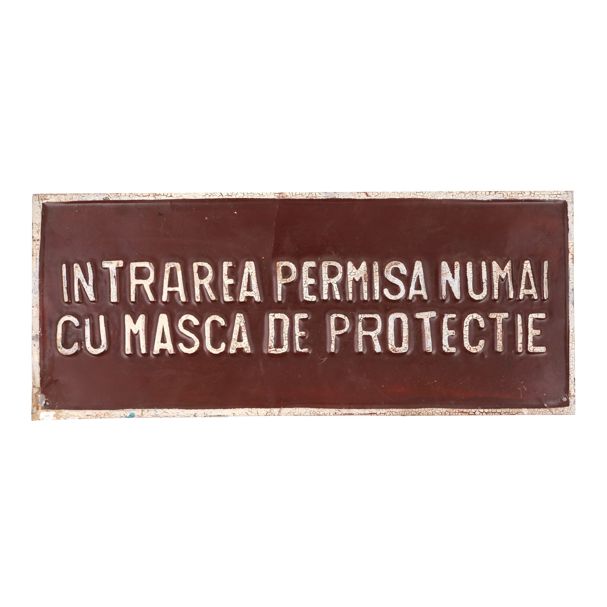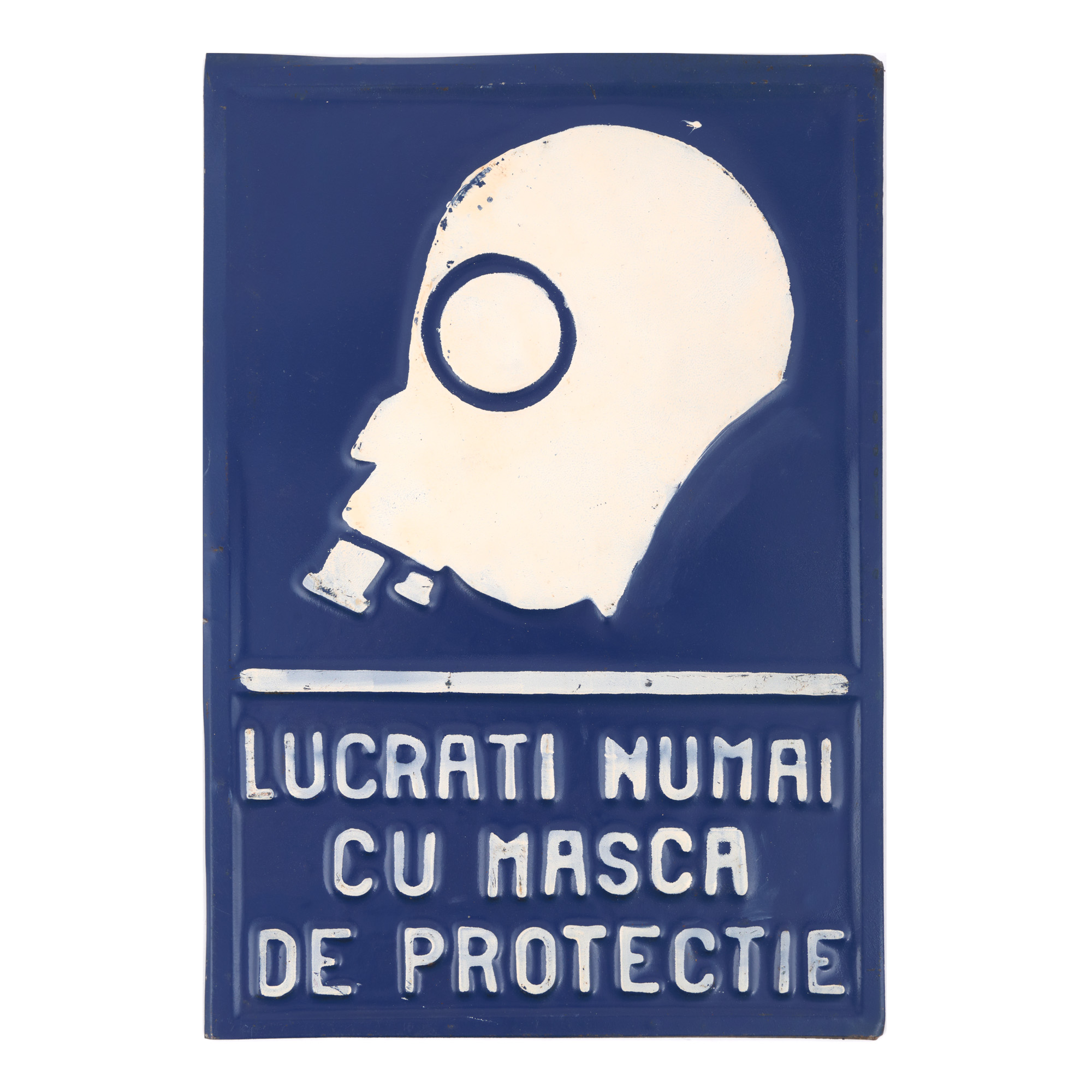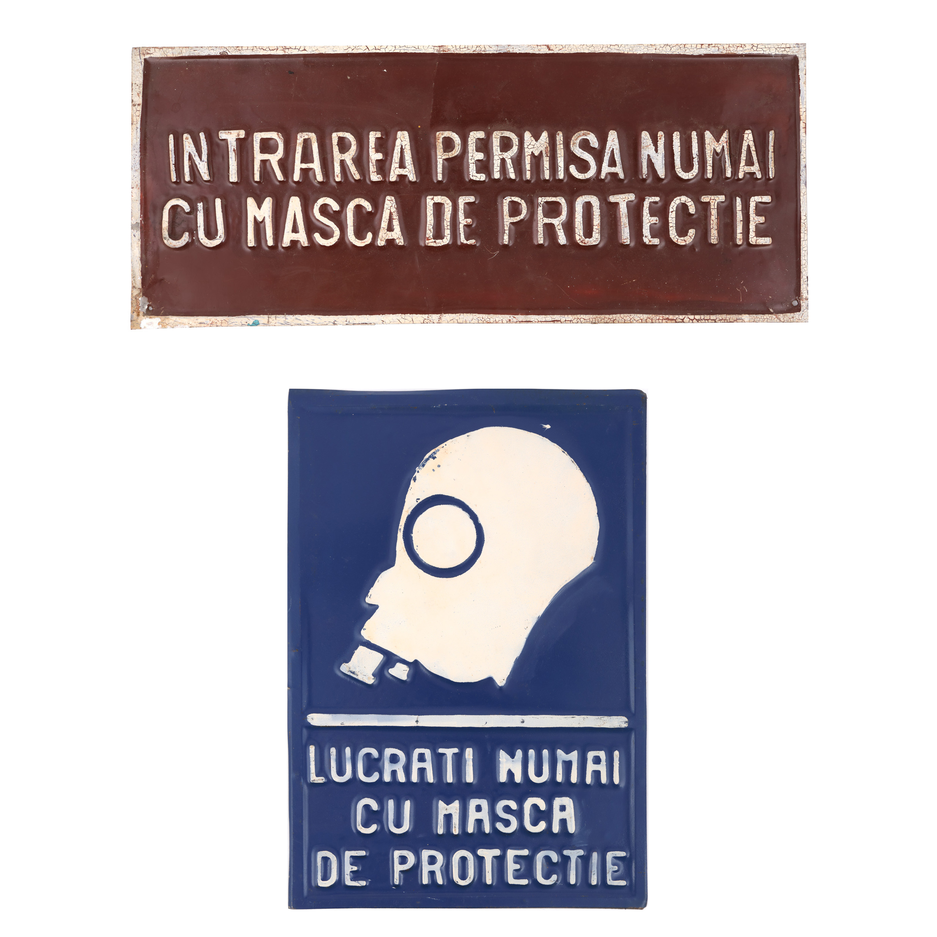 245. Lot format din două plachete metalice, de protecția muncii, "Lucrați numai cu masca de protecție" și "Intrarea pemisă numai cu masca de protecție", perioada comunistă
