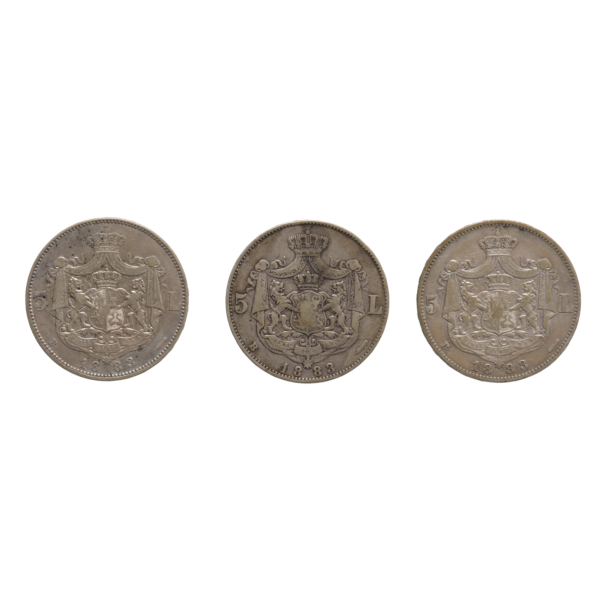 213. Lot format din trei monede de 5 Lei 1883, argint