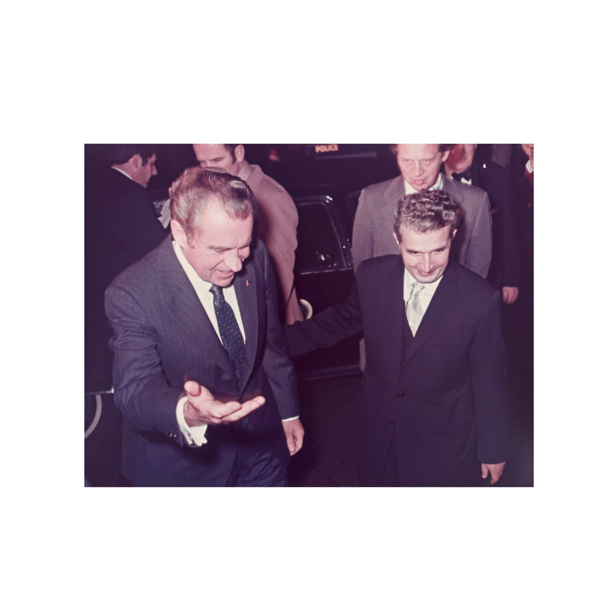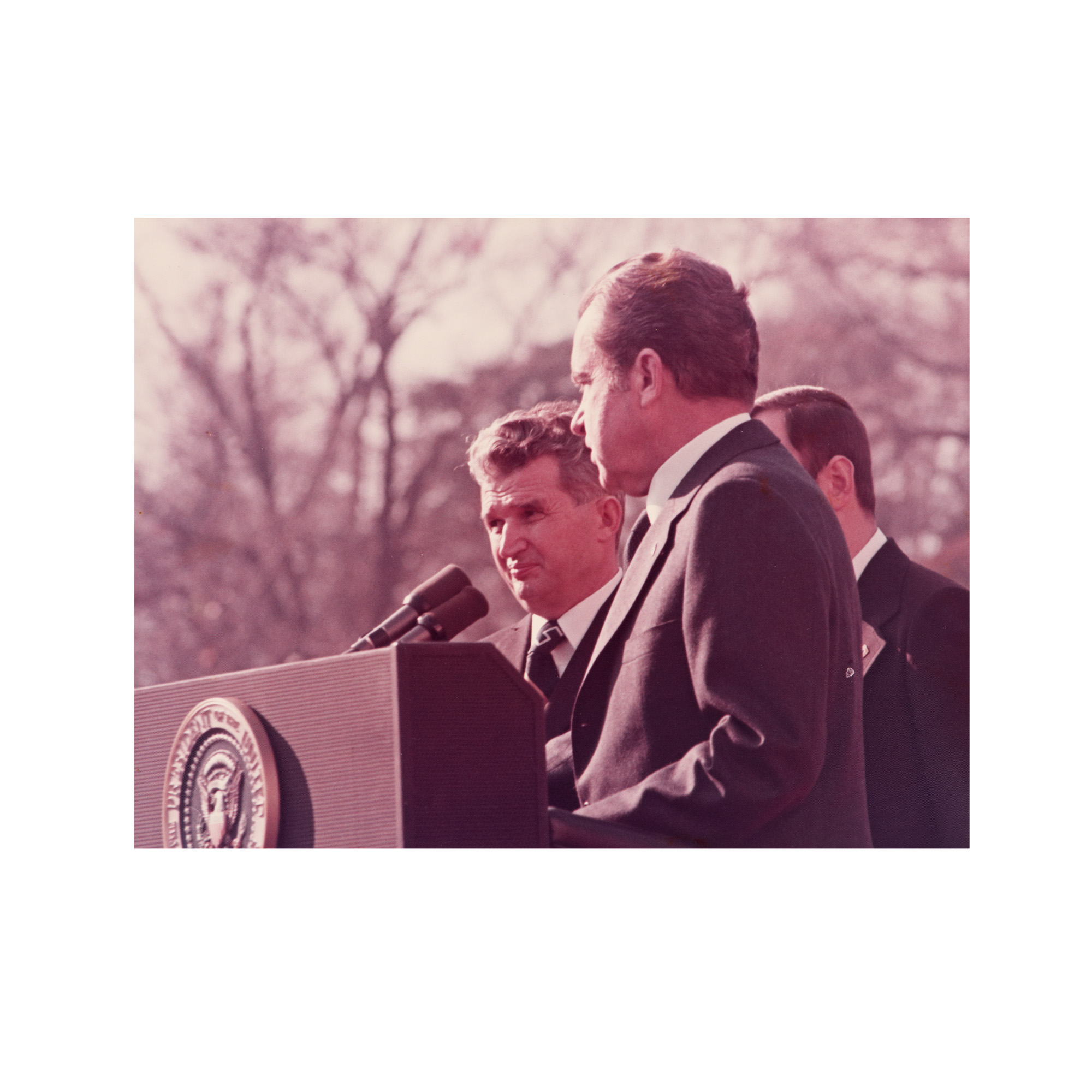 În decembrie 1973, la invitația președintelui Statelor Unite ale Americii Richard Nixon, dictatorul comunist Nicolae Ceaușescu întreprindea o vizită oficială la Washington. Fotografiile au surprins diferite momente din timpul acestei vizite, inclusiv primirea oficiată pe peluza Casei Albe. În imagini apar cei doi președinți cu soțiile lor, Secretarul de Stat american Henry Kissinger, diplomarul Sergiu Celac, translatorul pentru limba engleză al lui Ceaușescu, Ministrul de Externe român din acel moment George Macovescu, alți oficiali americani și români. Exemplarele au făcut parte din arhiva fostului Ministru de Externe George Macovescu.