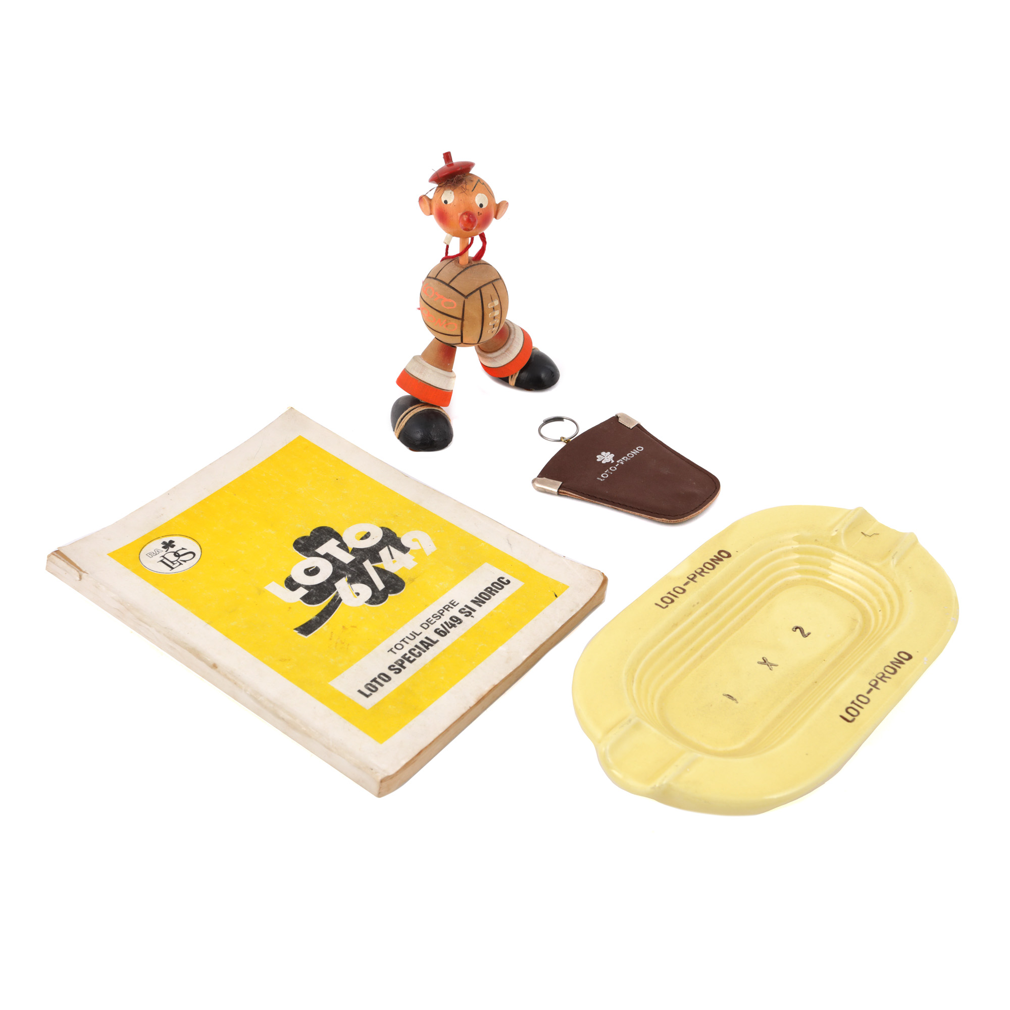 234. Lot Iliuță Pronosport, format dintr-o carte, o scrumieră, o jucărie și un breloc, toate cu tematica Loto, perioada comunistă